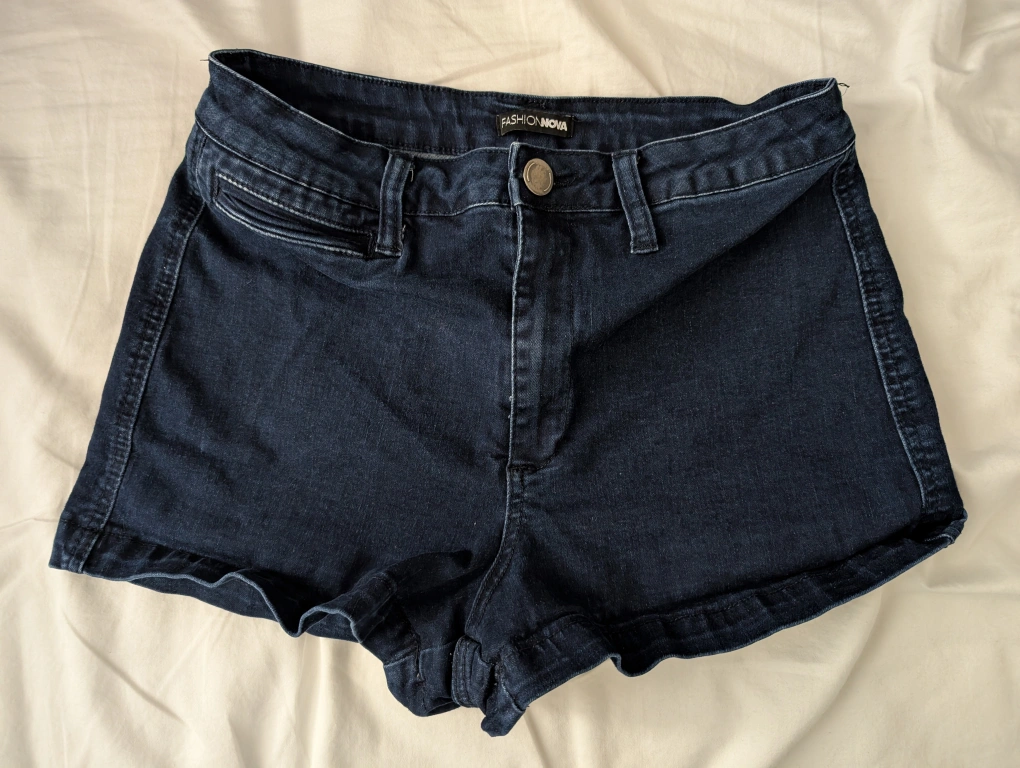 Selling a pair of Fashion Nova denim shorts in size 9. They're made of 75% cotton, 23% polyester, and 2% spandex. The style number is SH22870. They are in great condition! Good to pair with knee high boots in Fall Season!