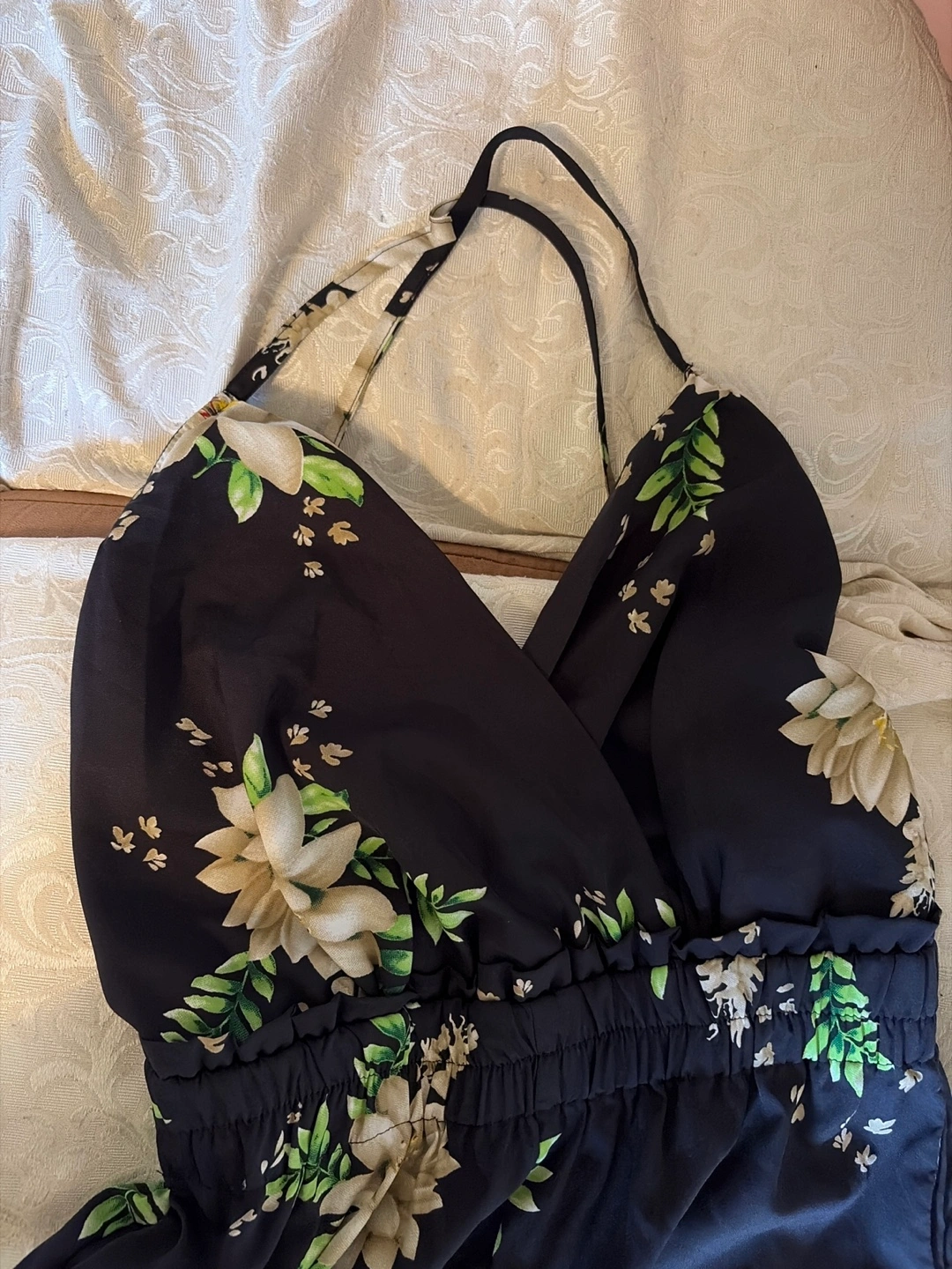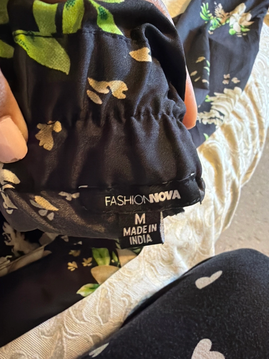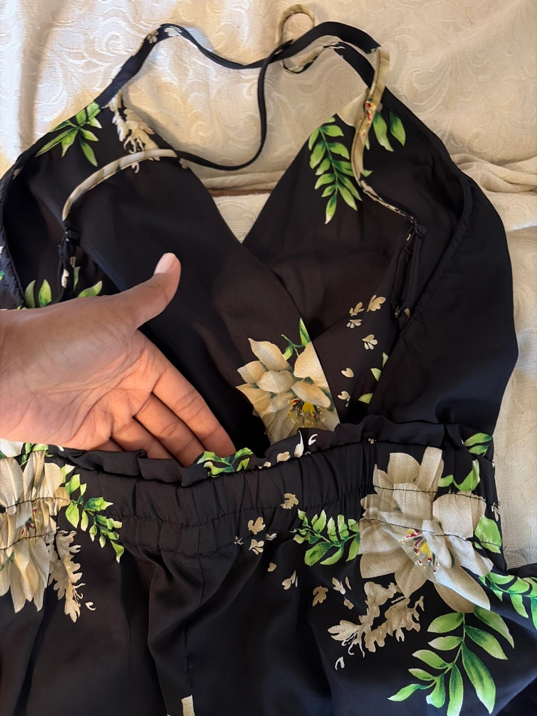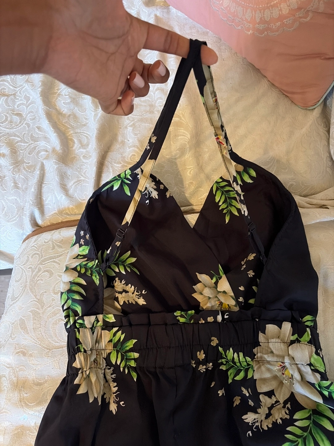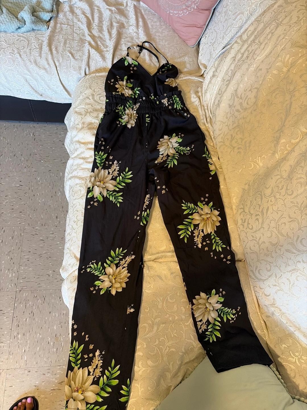 Selling a cute Fashion Nova jumpsuit! It's a size medium and features a black background with a lovely floral pattern. Perfect for a casual day out or dressing up for an evening event
