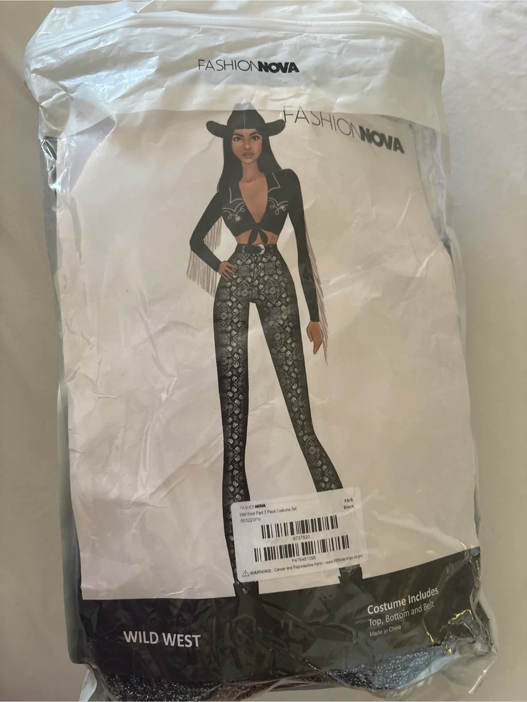 Selling a Fashion Nova Wild West 3-piece costume set in size XS/S. The costume includes the top, bottom, and belt. It's black and still in the original packaging!