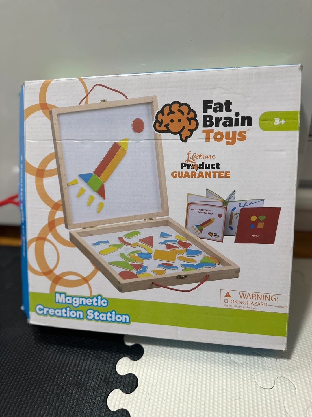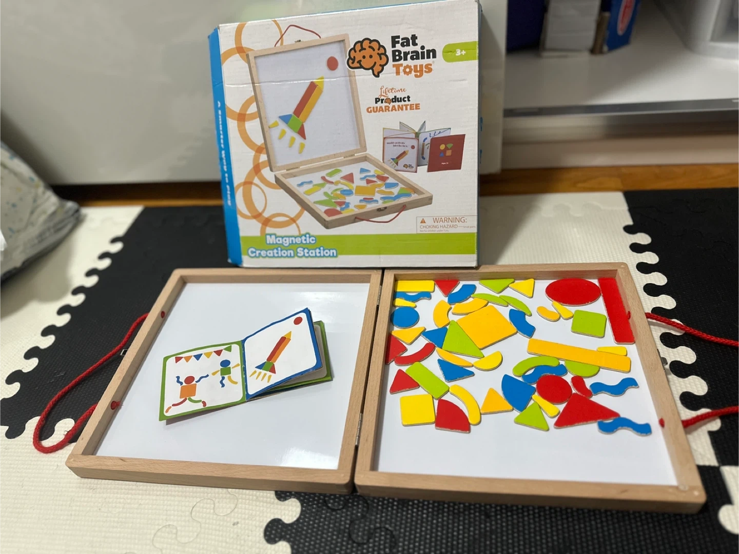 21This is a fun magnetic creation station from Fat Brain Toys! It's great for ages 3+. It comes with a variety of colorful magnetic shapes and a whiteboard to create different designs. The set also includes a booklet with design ideas to get you started