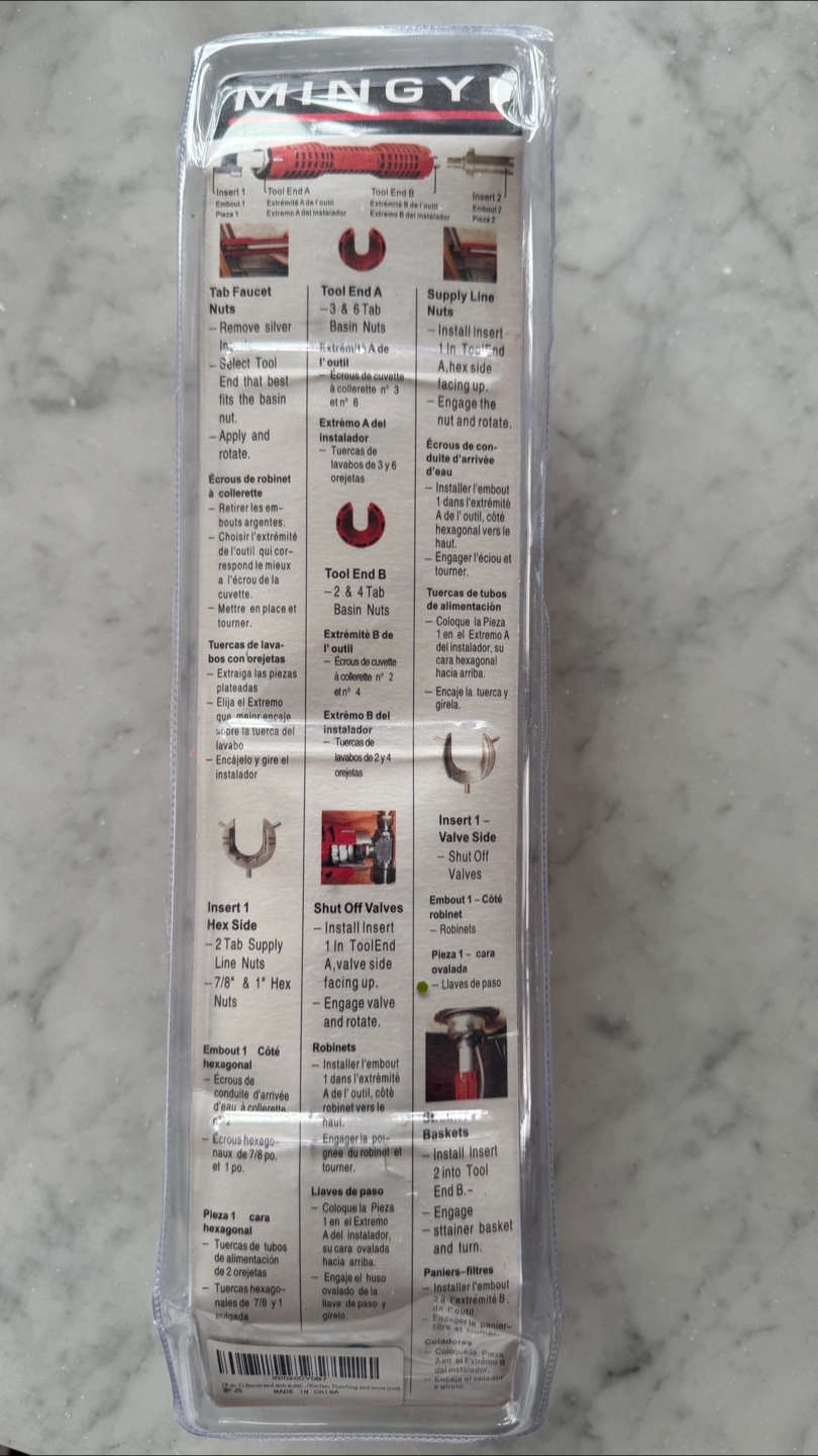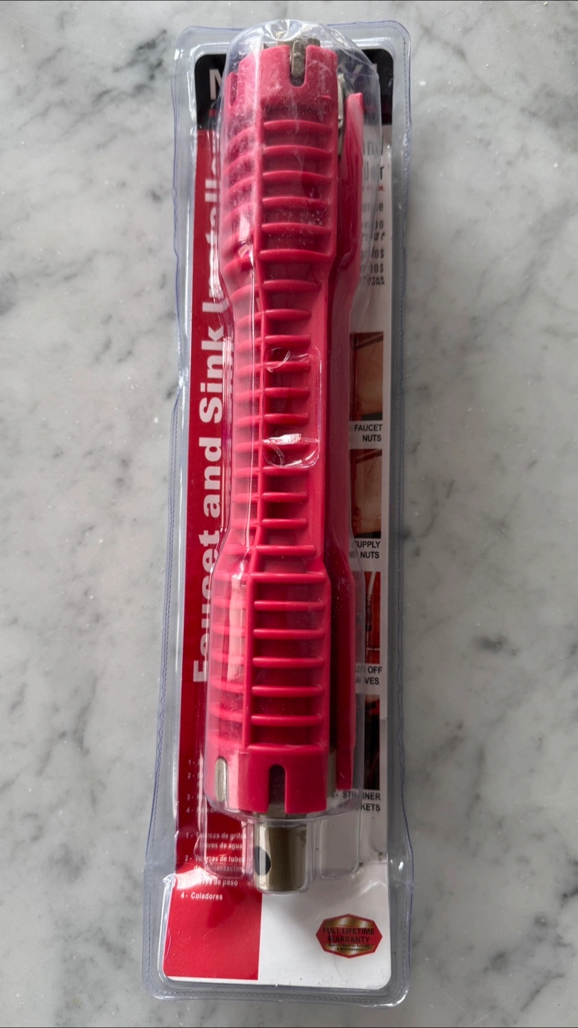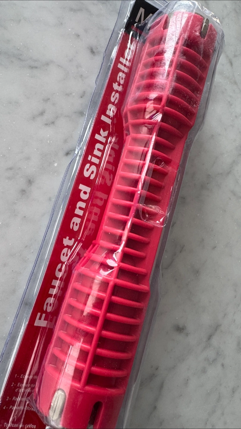 42New faucet and sink installation tool. Multiple uses. Red plastic handle. Includes several attachments.