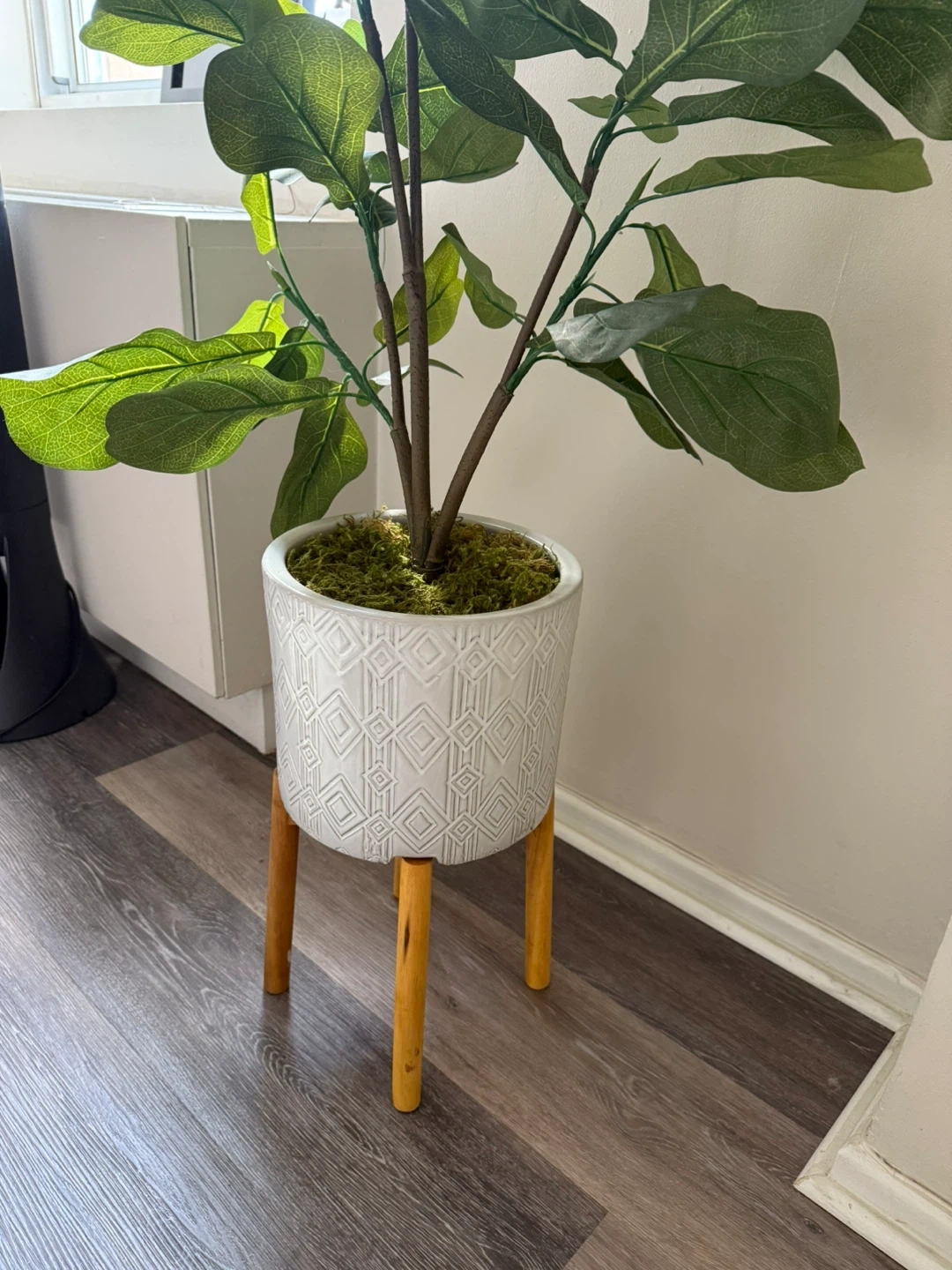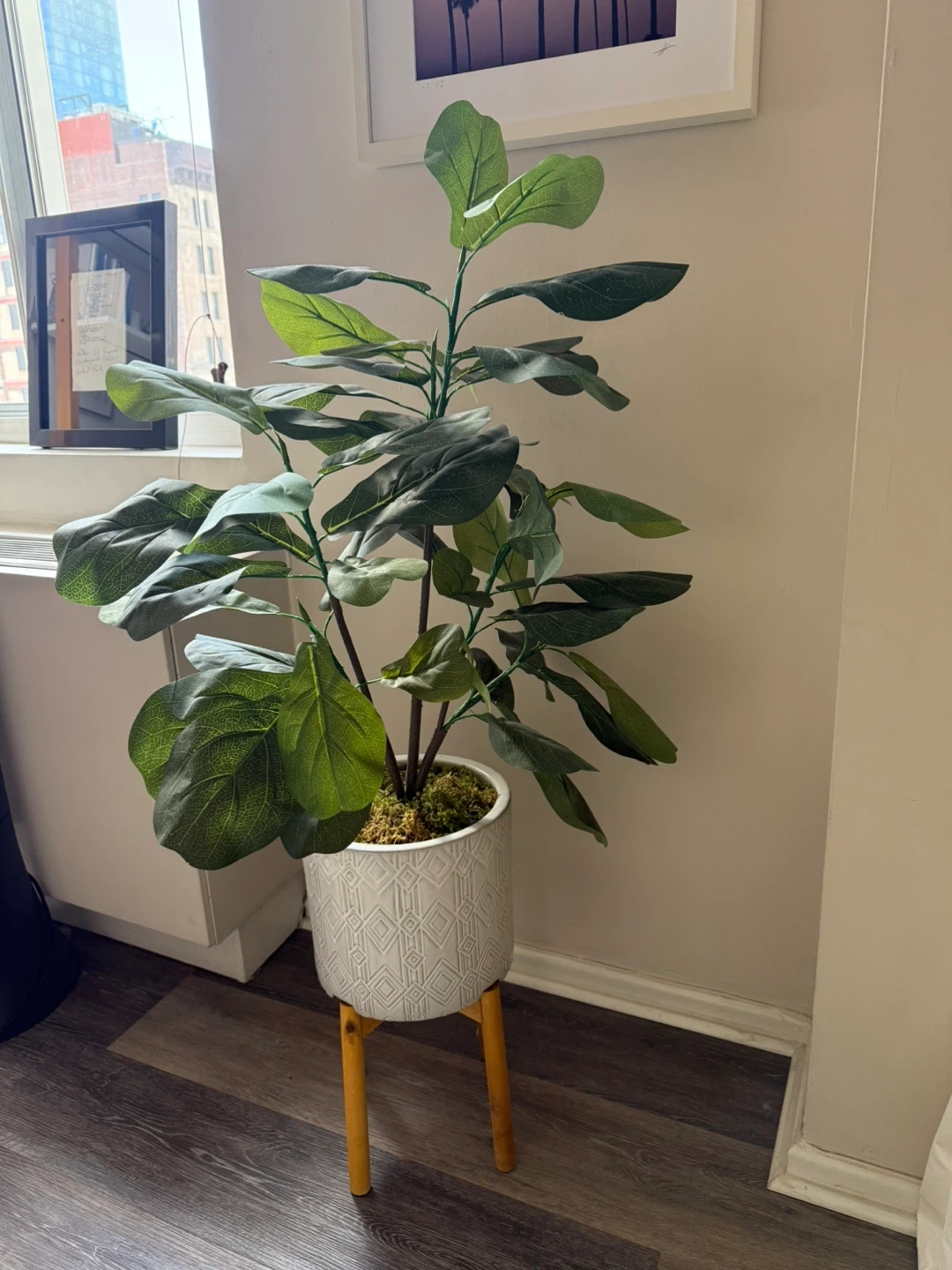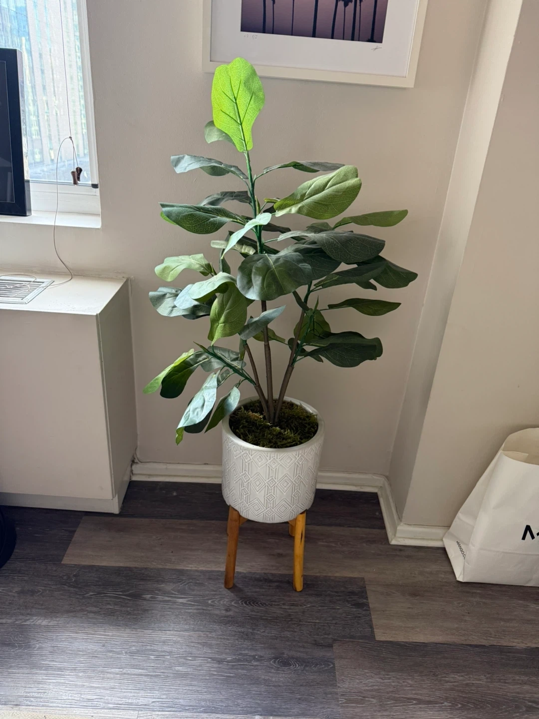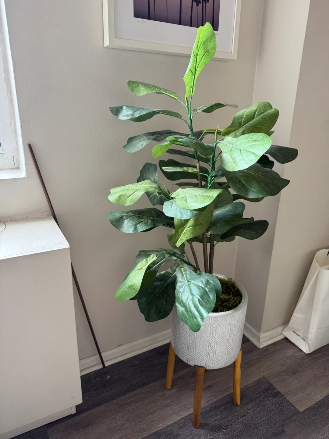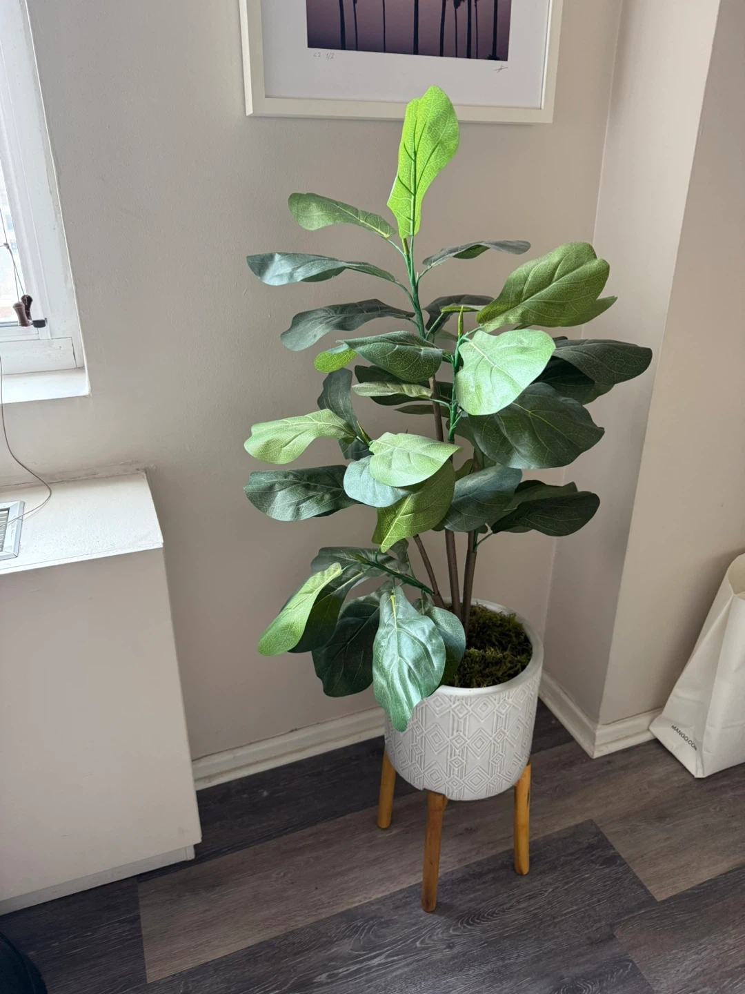 Selling a faux fiddle leaf fig tree! It comes in a cute pot with a stand. It's perfect for adding a touch of greenery to any room without the hassle of real plant care. Very slightly wobbly on stand but still stable. 47 inches from floor to top of plant; 18 inches from floor to top of pot.