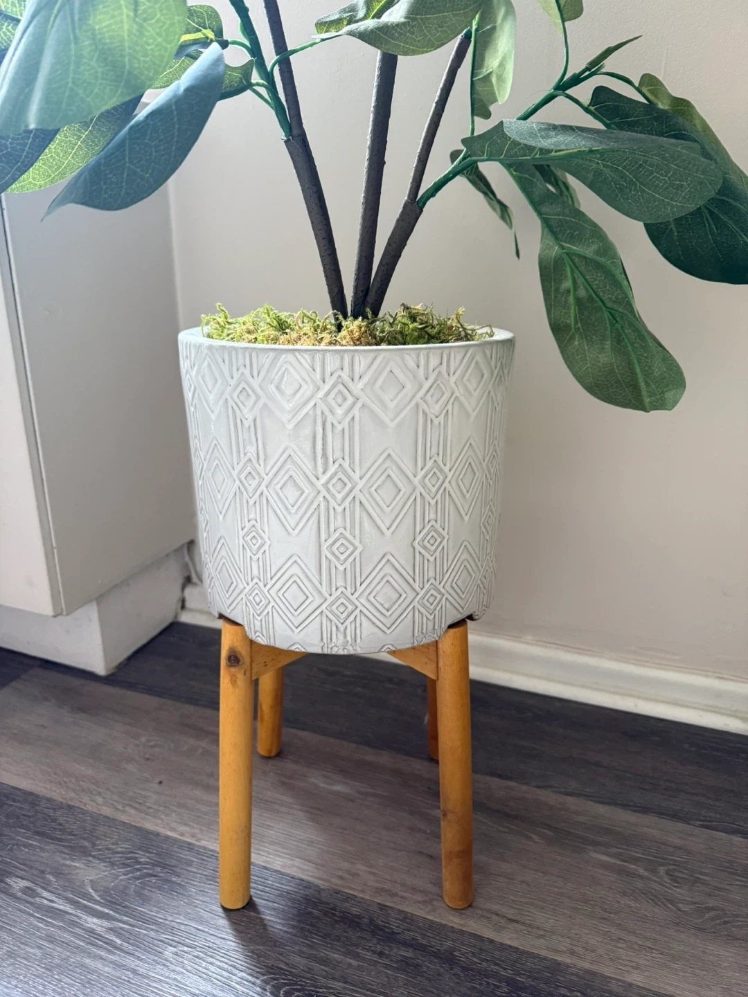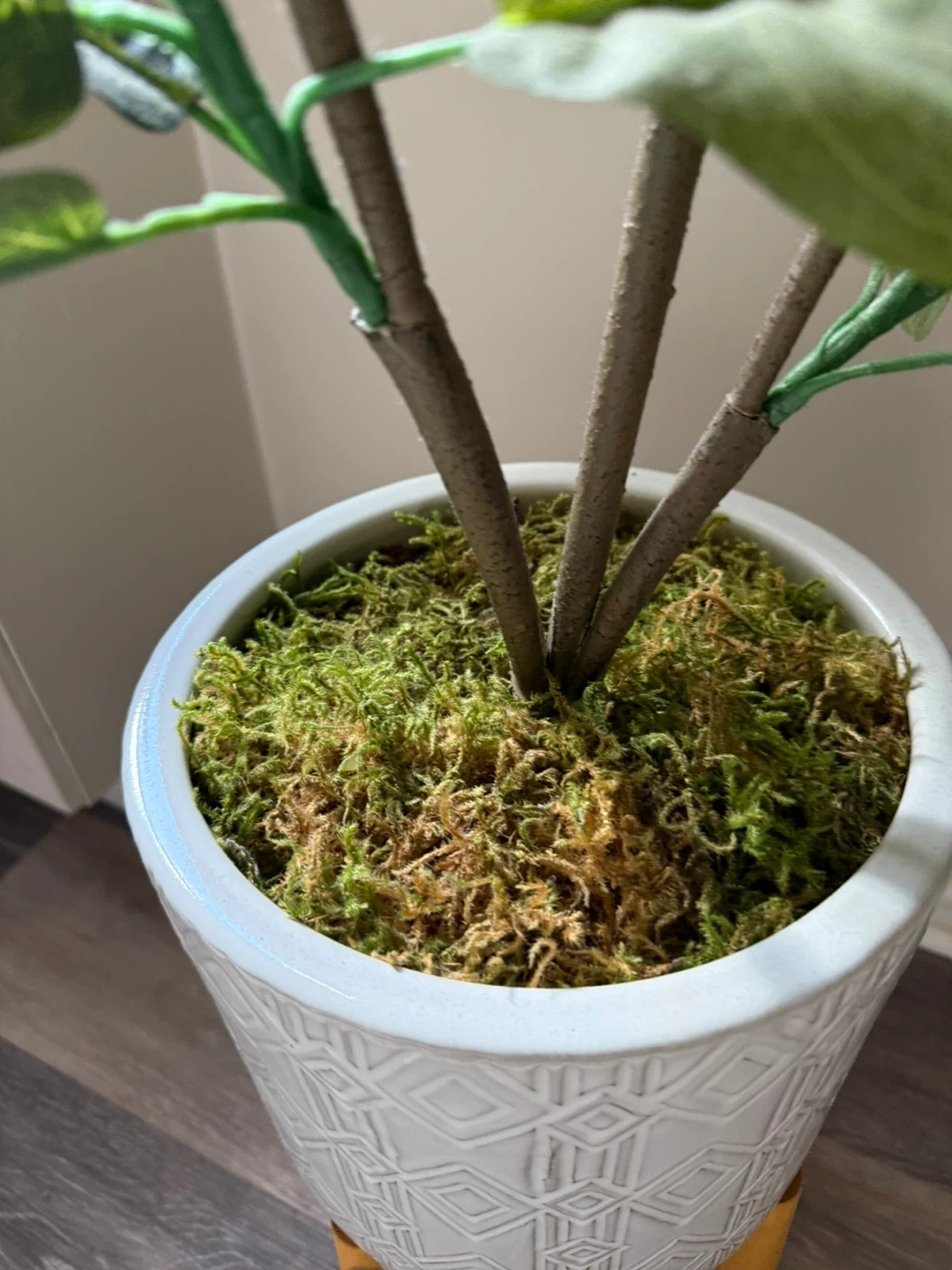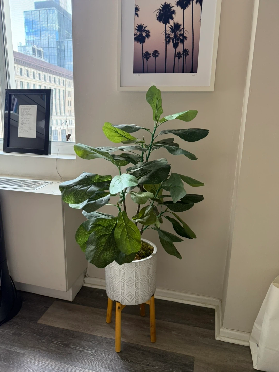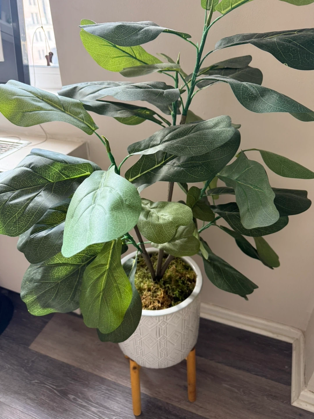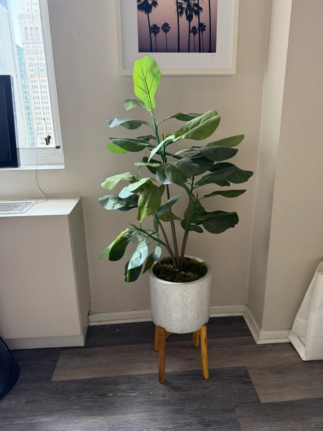 Selling a faux fiddle leaf fig tree! It comes in a cute pot with a stand. It's perfect for adding a touch of greenery to any room without the hassle of real plant care. Very slightly wobbly on stand but still stable. 47 inches from floor to top of plant; 18 inches from floor to top of pot.