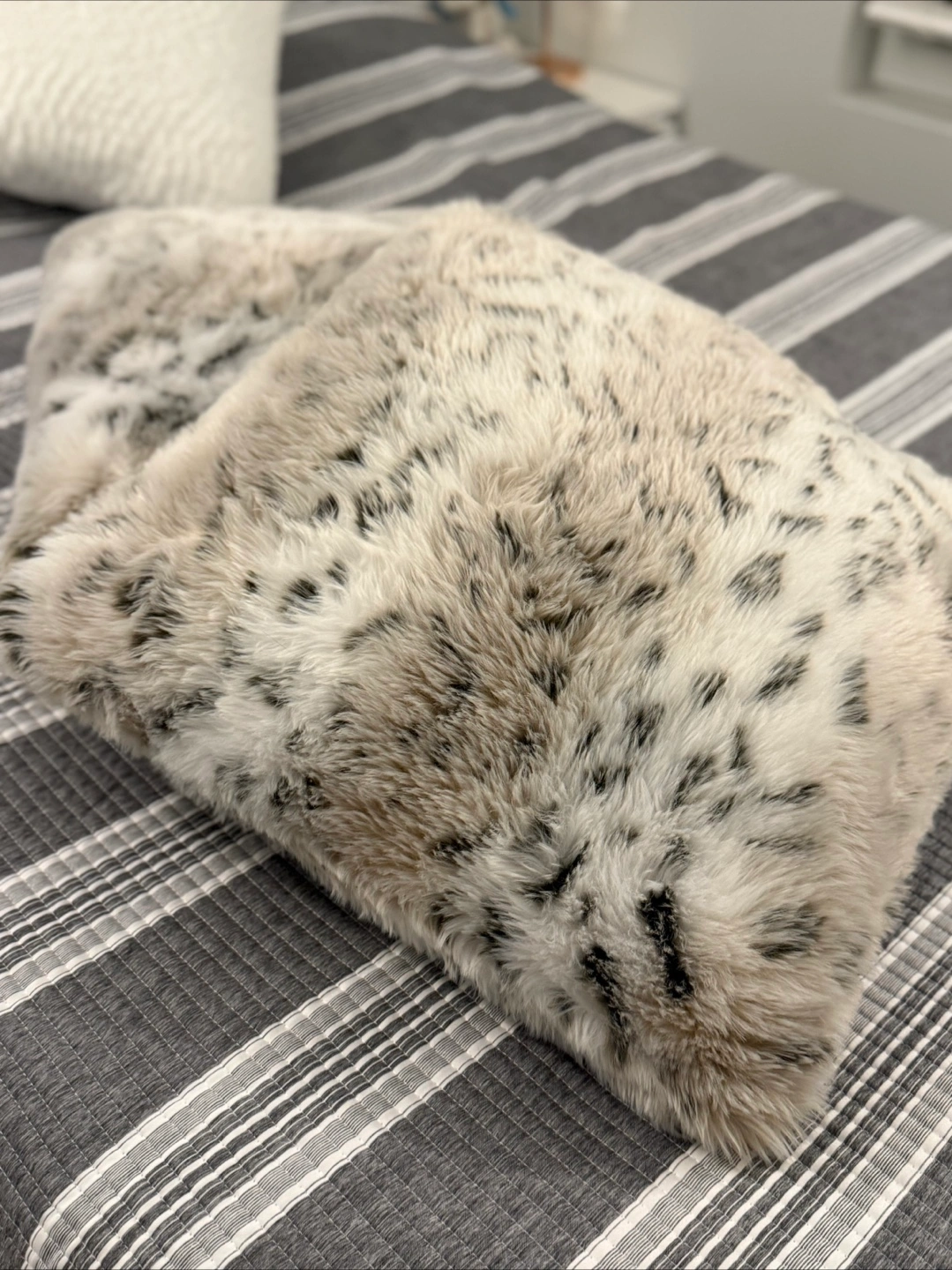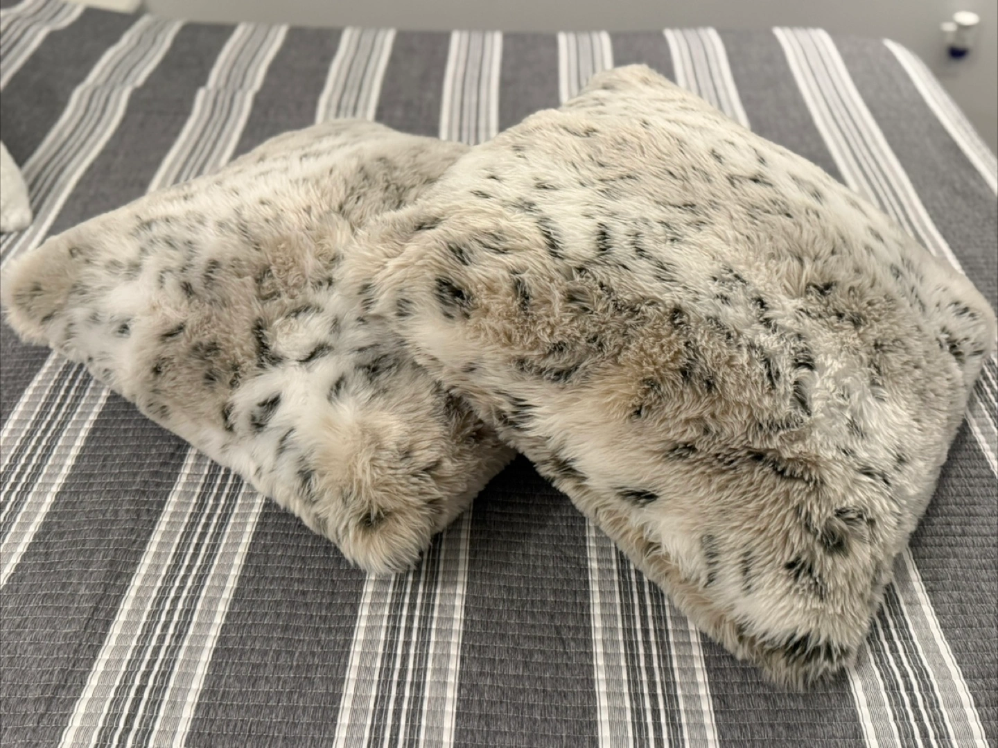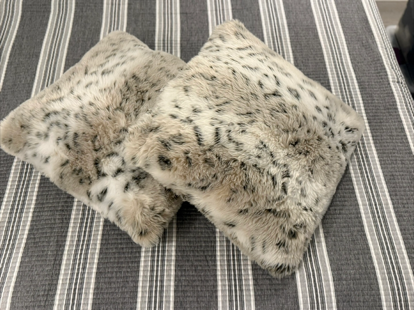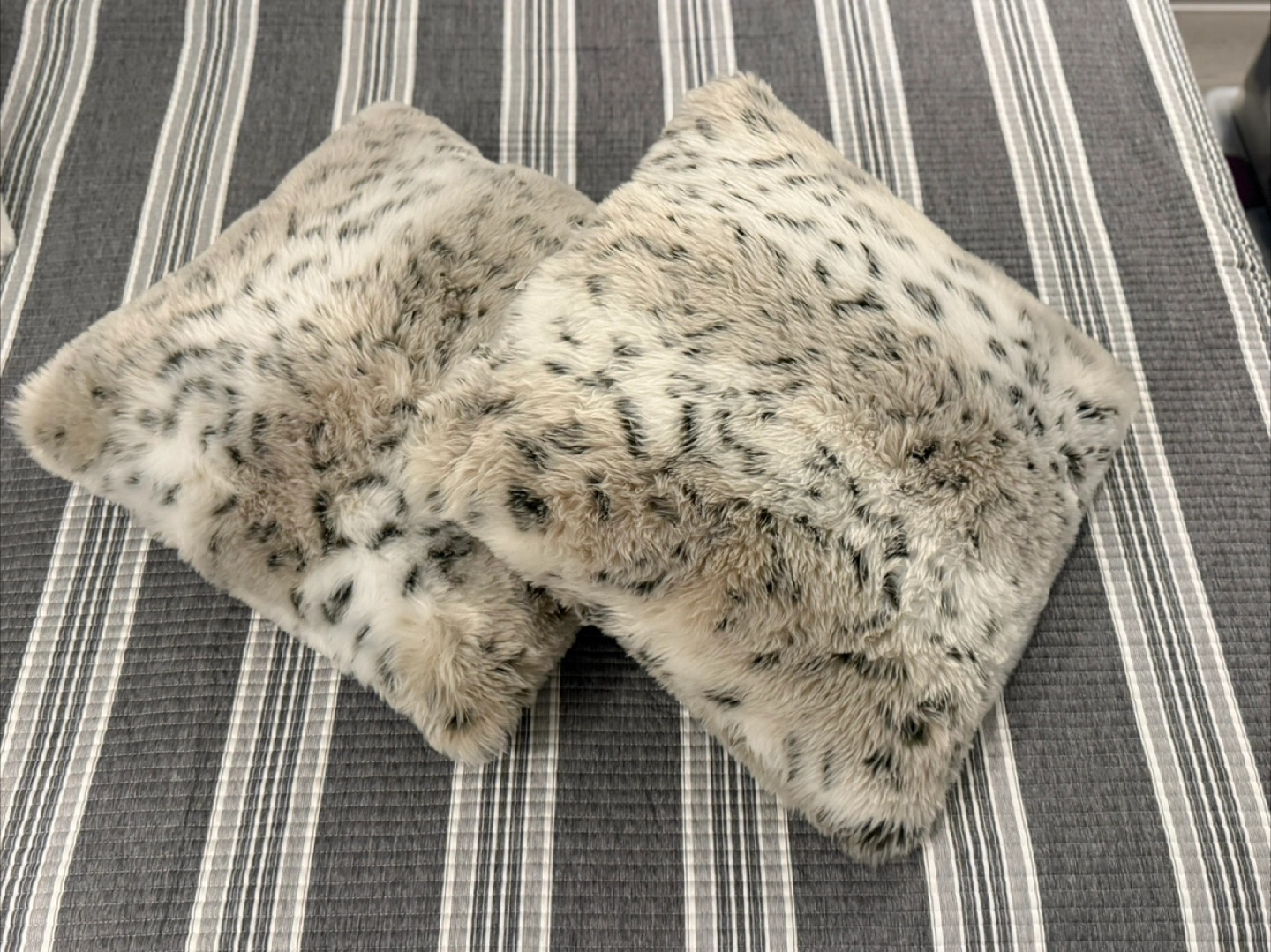 I'm selling a set of two faux fur throw pillows! They have a soft, plush texture and a subtle animal print pattern. They're in great condition and would add a cozy touch to any room