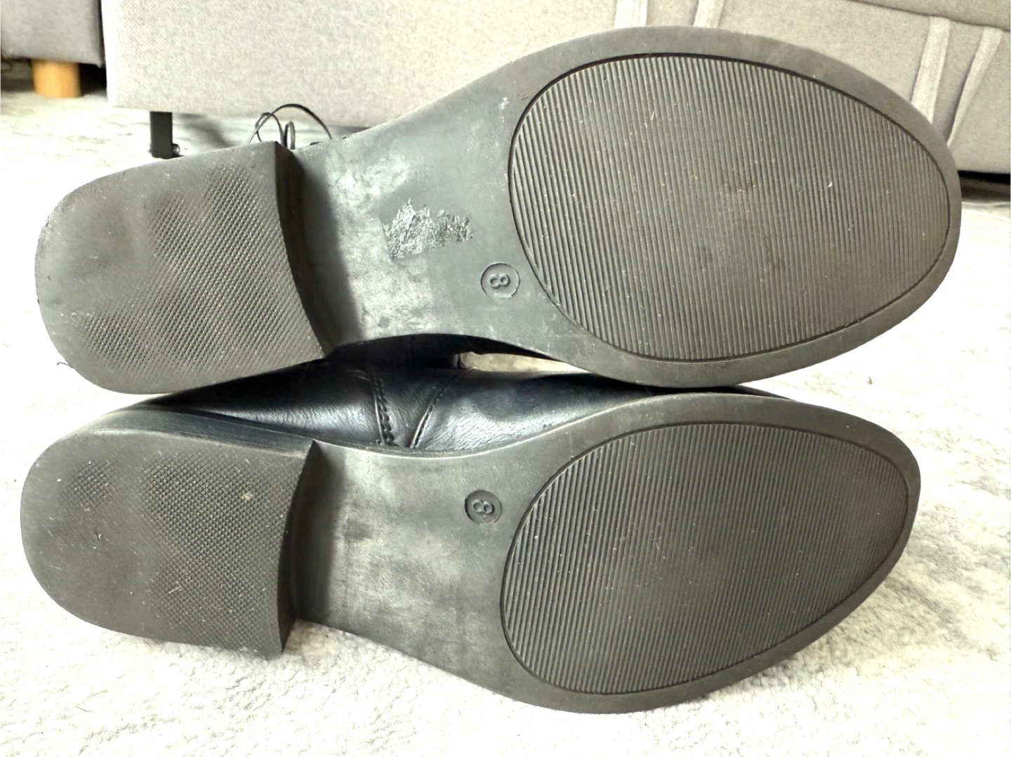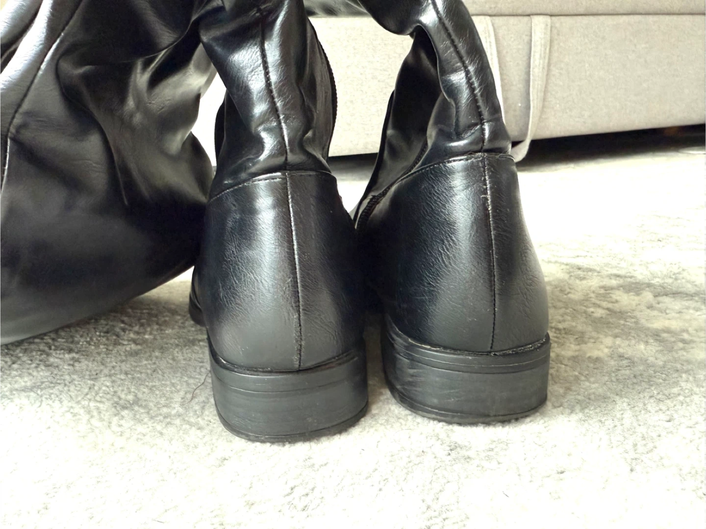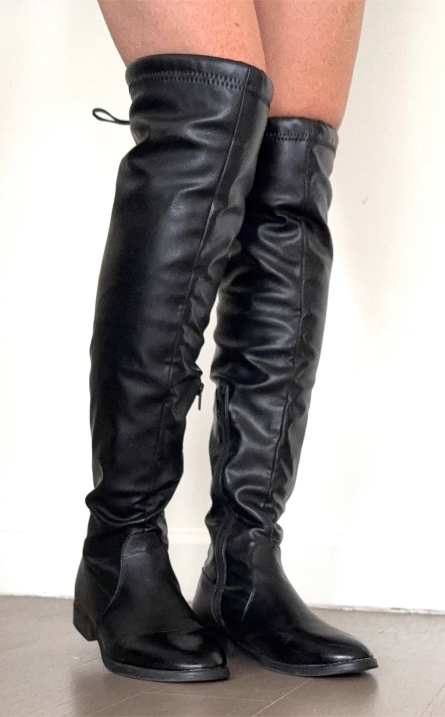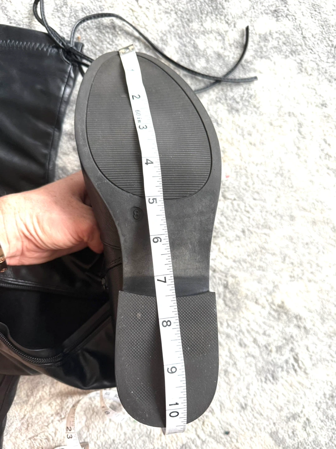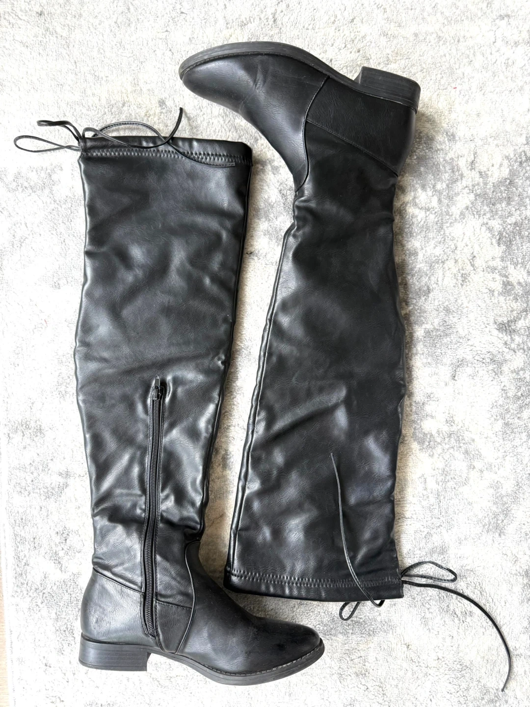 78Selling a pair of black over-the-knee boots. They're in good condition and ready for a new home! Faux leather over-the-knee boots. • Semi-round toe • Side zipper closure • Tie at back • Rubber outsole Size: 8 22 inches long from sole to top