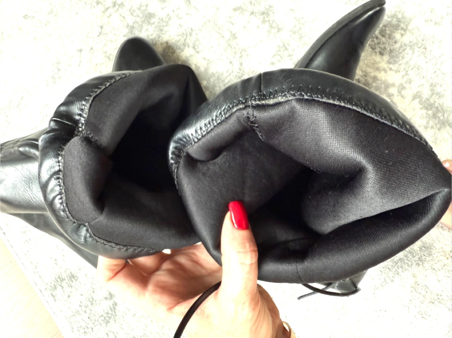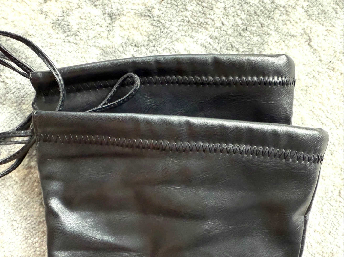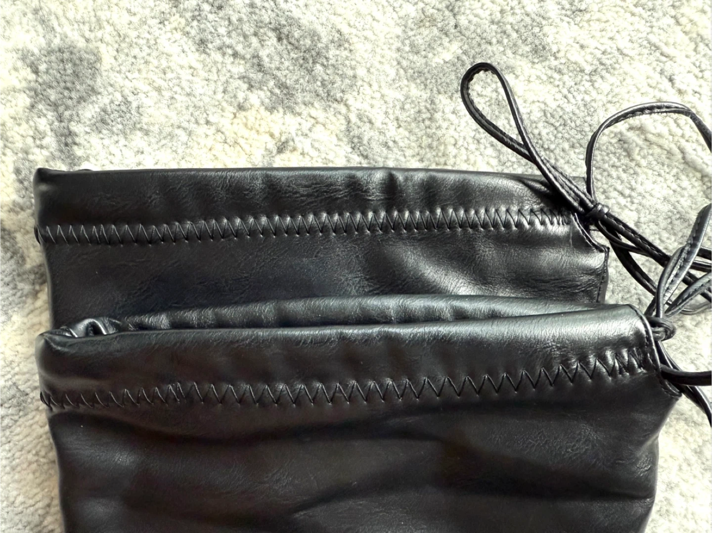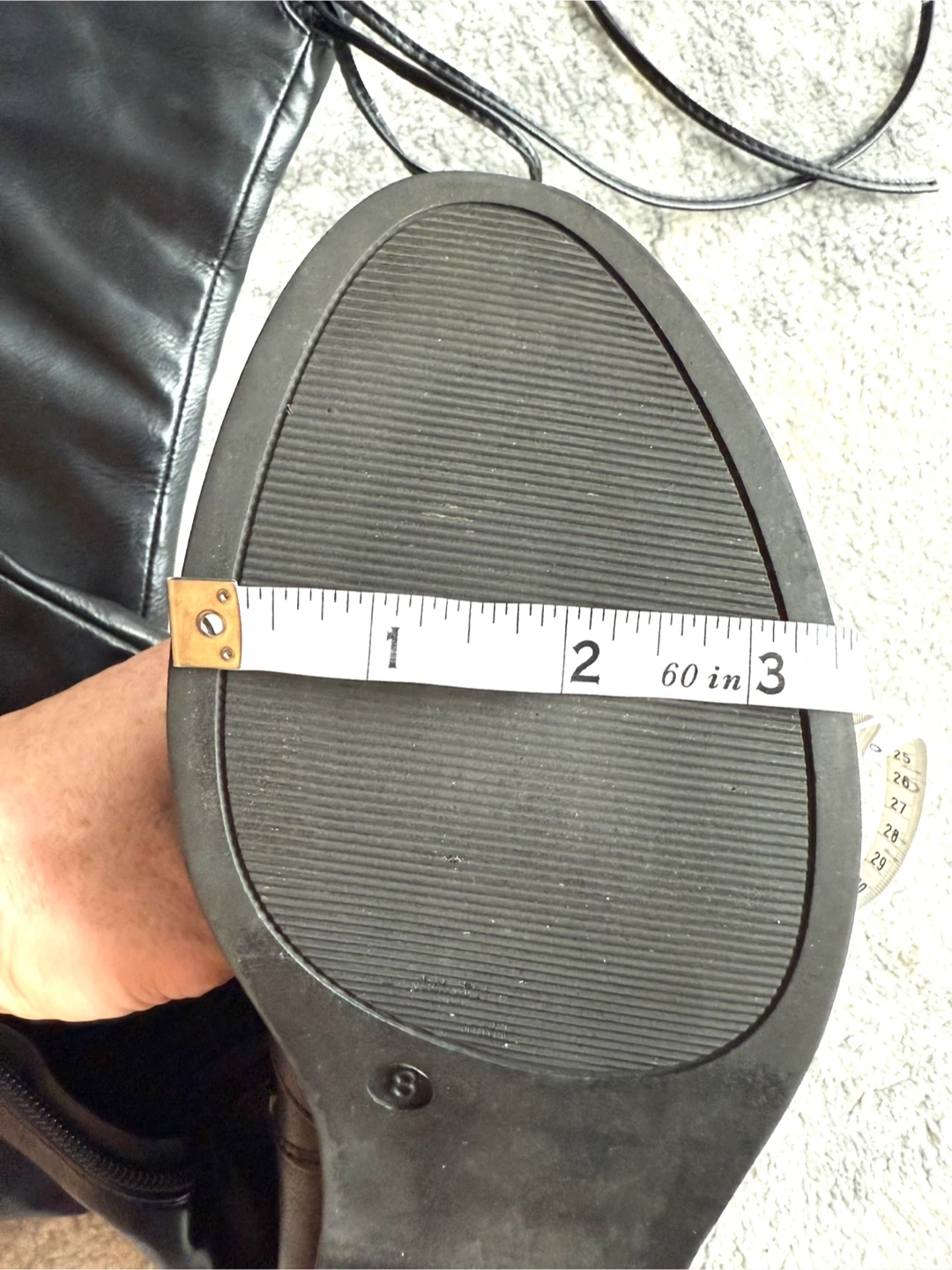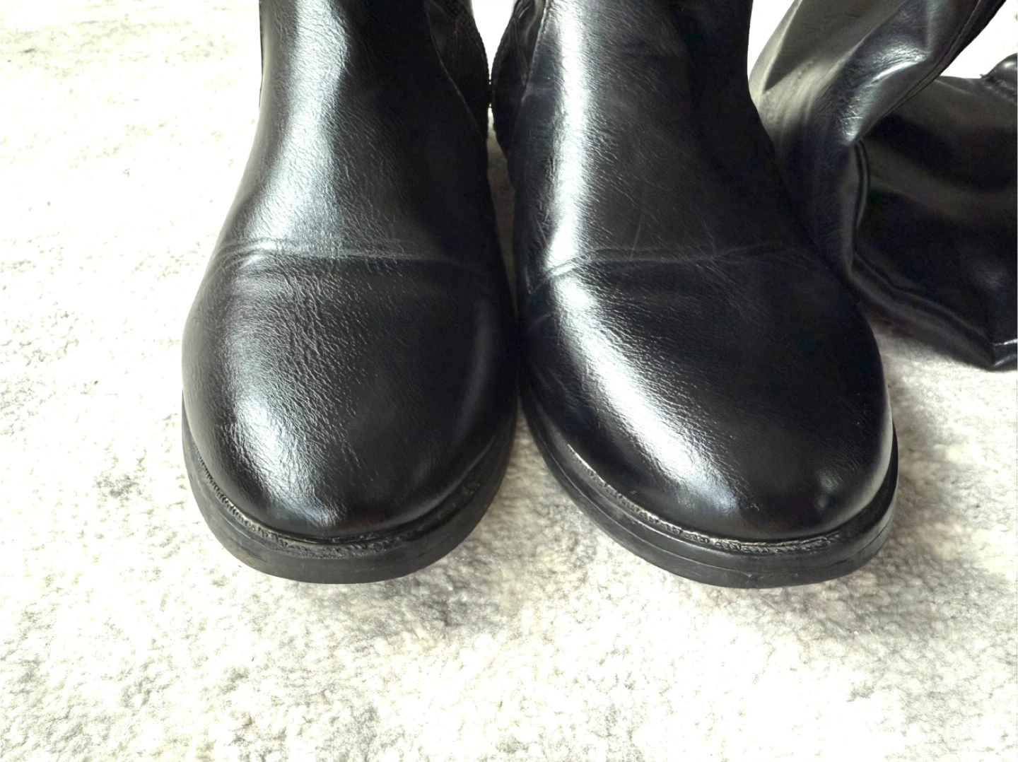 78Selling a pair of black over-the-knee boots. They're in good condition and ready for a new home! Faux leather over-the-knee boots. • Semi-round toe • Side zipper closure • Tie at back • Rubber outsole Size: 8 22 inches long from sole to top