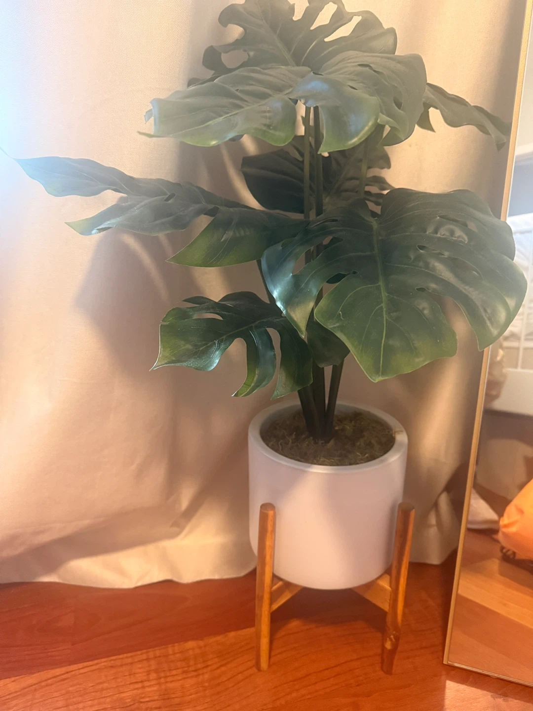 60Selling a faux monstera plant! It comes with a pot and wooden stand. It's a great way to add some greenery to your space without the hassle of real plant care