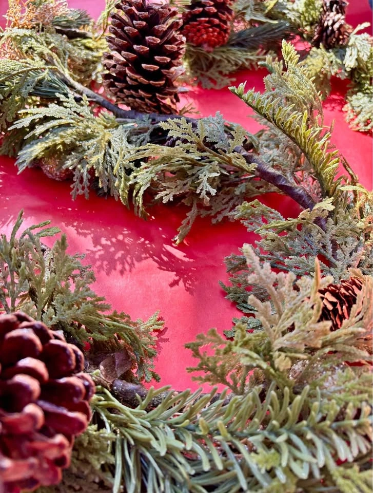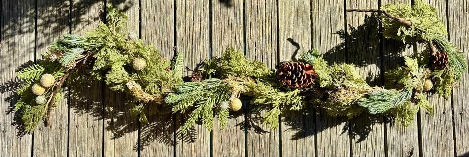 15Faux Pine & Spruce Garland Embellished with Pinecones & Ornaments. Like New / Never Used. This elegant garland features faux evergreen needles embellished with large & small pinecones, silver & gold glitter covered ornaments, and frosted twigs, and its thickness provides for ample coverage. Welcome in the most wonderful time of the year by displaying this festive garland on your mantle, shelf, staircase or over a doorway to add extra warmth and merry to the holiday season. * Add string lights for an even cozier display * Flexible for ease of styling and storage * 5’ L x ~7” W