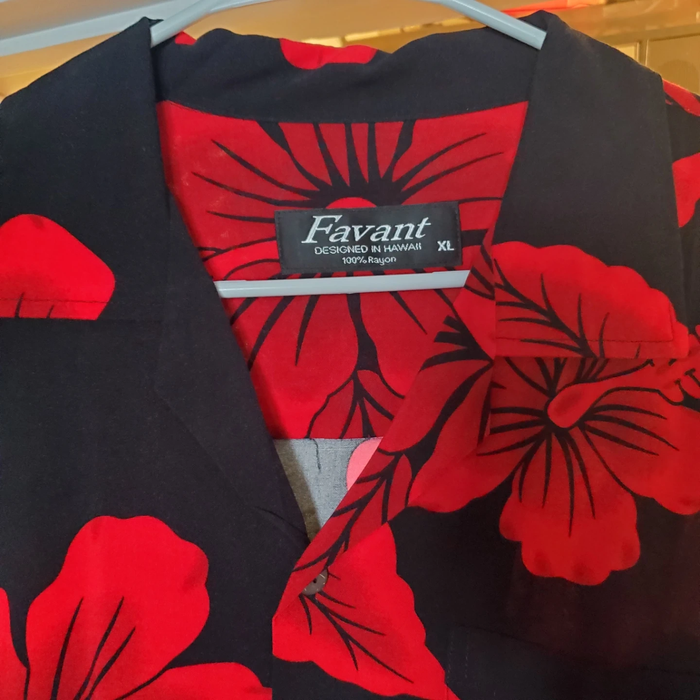 18Selling a Favant Hawaiian shirt in excellent condition! It's an XL size with a vibrant red floral design on a black background. Made of 100% Rayon, it's lightweight and perfect for a casual, stylish look