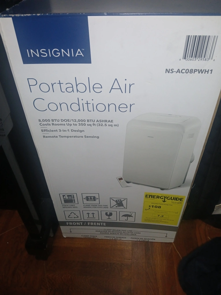Selling an Insignia portable air conditioner! It cools rooms up to 350 sq ft and has an efficient 3-in-1 design with remote temperature sensing. The model number is NS-AC08PWH1. It's 8,000 BTU DOE/12,000 BTU ASHRAE. The box includes information about stacking limits and clamping force as well