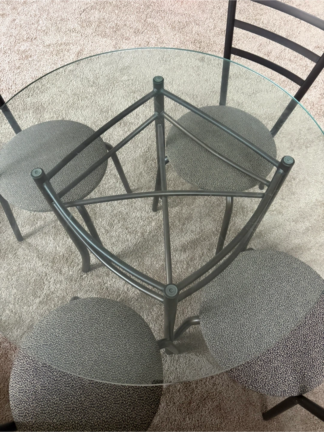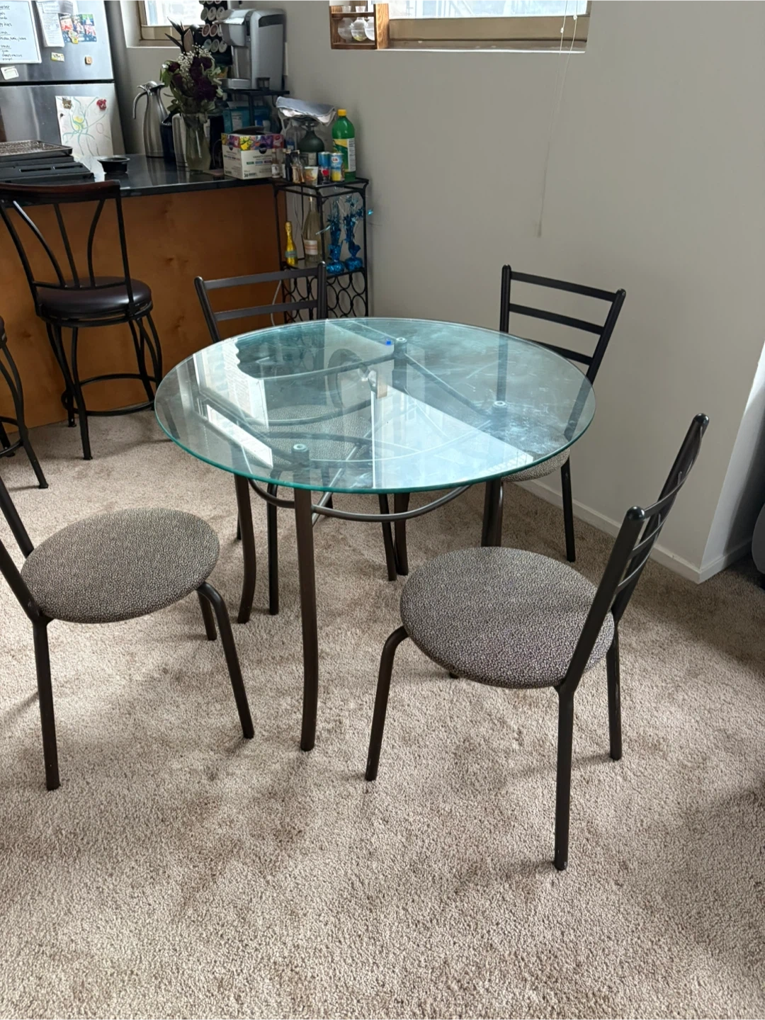 This is a round glass top dining table with four matching chairs. The table has a metal base and frame, and the chairs have upholstered seats. It's a compact set, perfect for smaller dining areas or breakfast nooks.