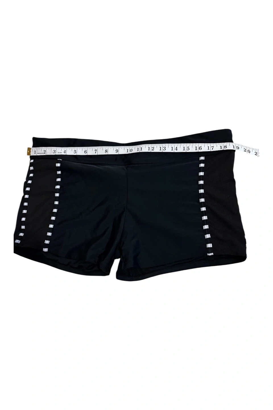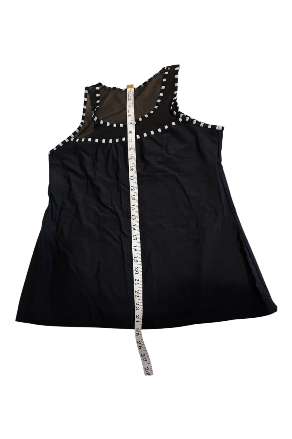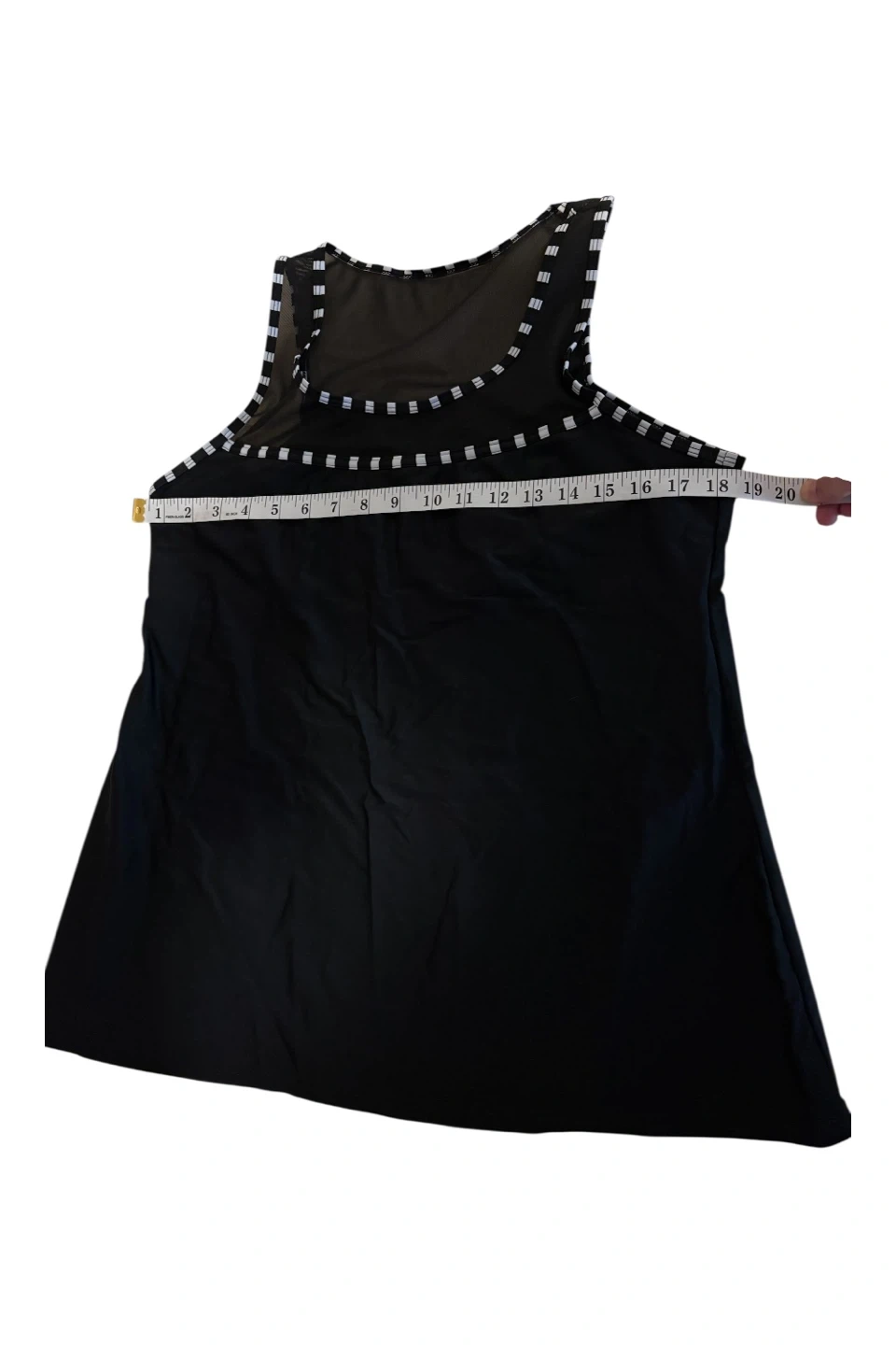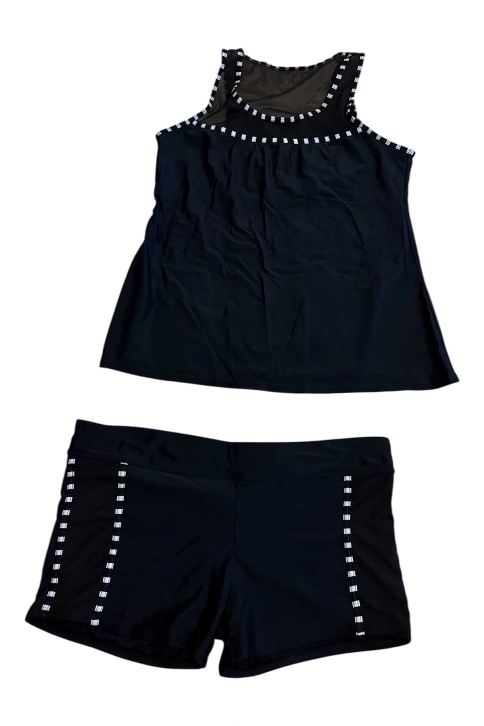 This is a black tankini swimsuit top with matching shorts. The top features sheer mesh detailing around the neckline with white accent squares. The shorts have a comfortable waistband. Shell: 82% nylon, 18% spandex. Lining: 95% polyester, 5% spandex.