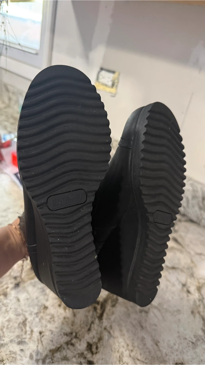 These are a pair of Khombu black wedge ankle boots. They appear to be in good condition and ready for a new owner! They have a nice, subtle wedge heel for a little extra height.