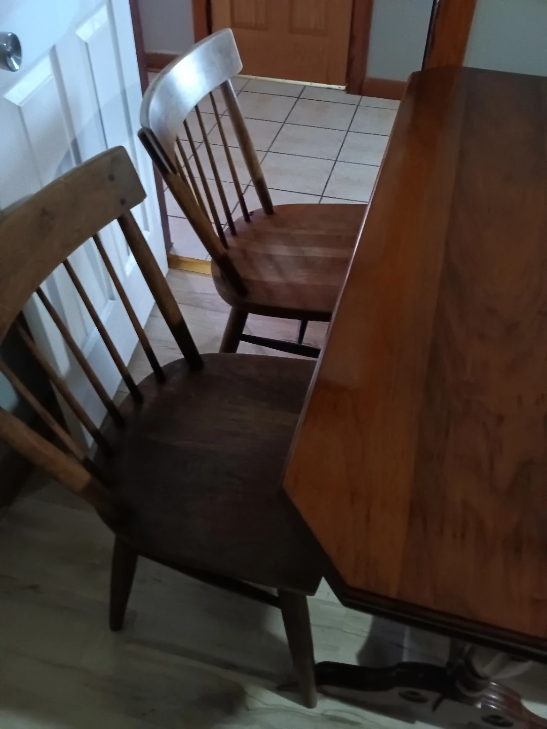 A wooden dining table with two matching chairs. The set has a classic design and a polished finish. Wood construction.
