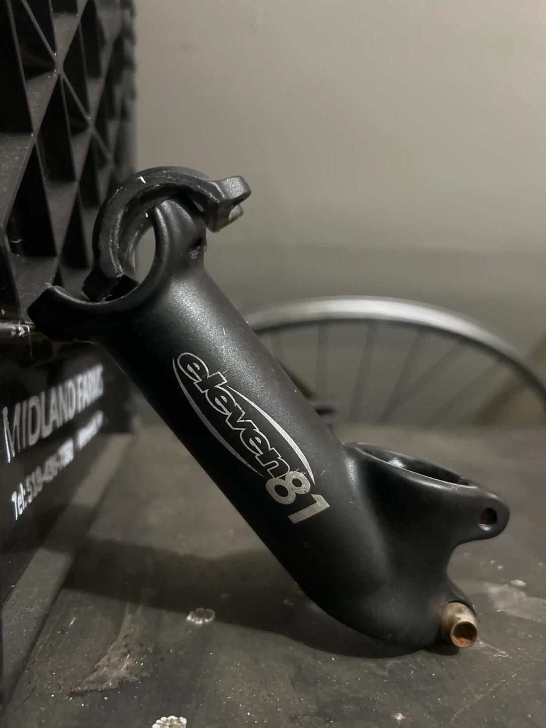 This is an Eleven81 brand bicycle stem. It's made of aluminum and has a black finish. It's a component for a bike's handlebars.