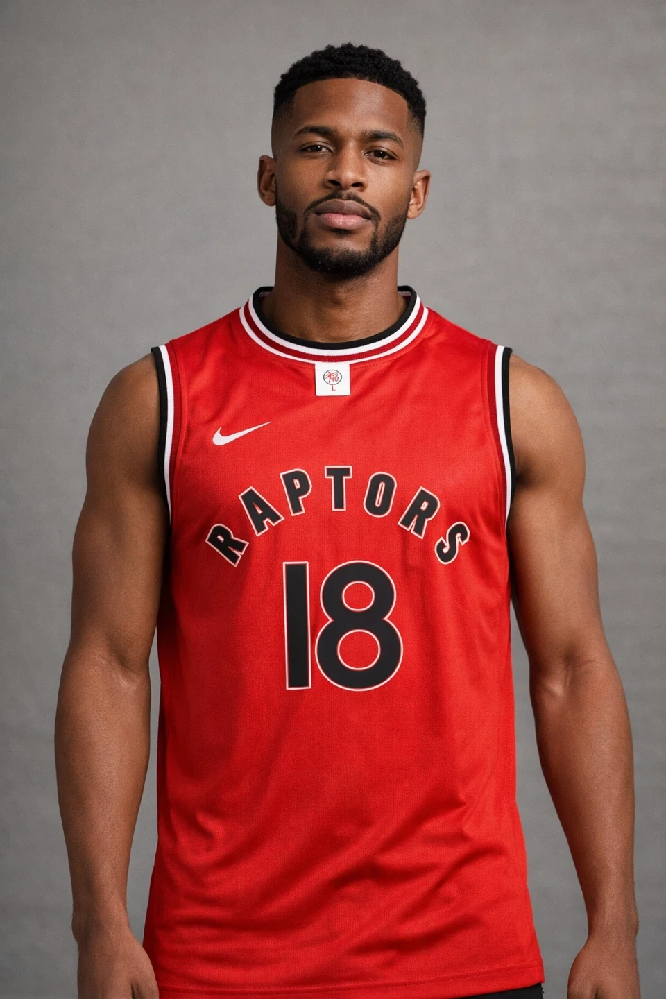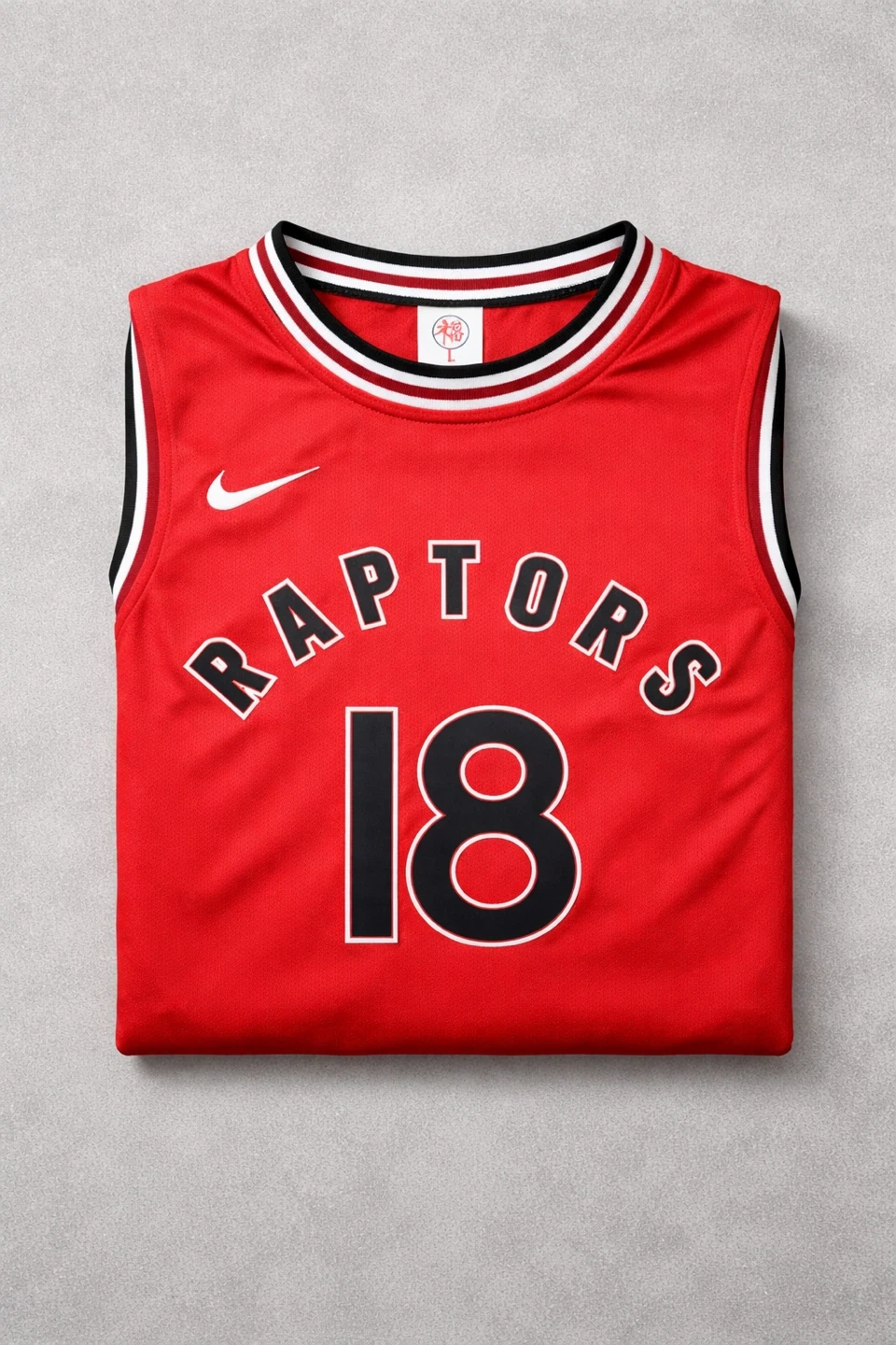New Nike Toronto Raptors basketball jersey Slim Fit with the number 18. It's red with black and white trim. Shows team name and player number on the front. Size M, L, XL, XXL