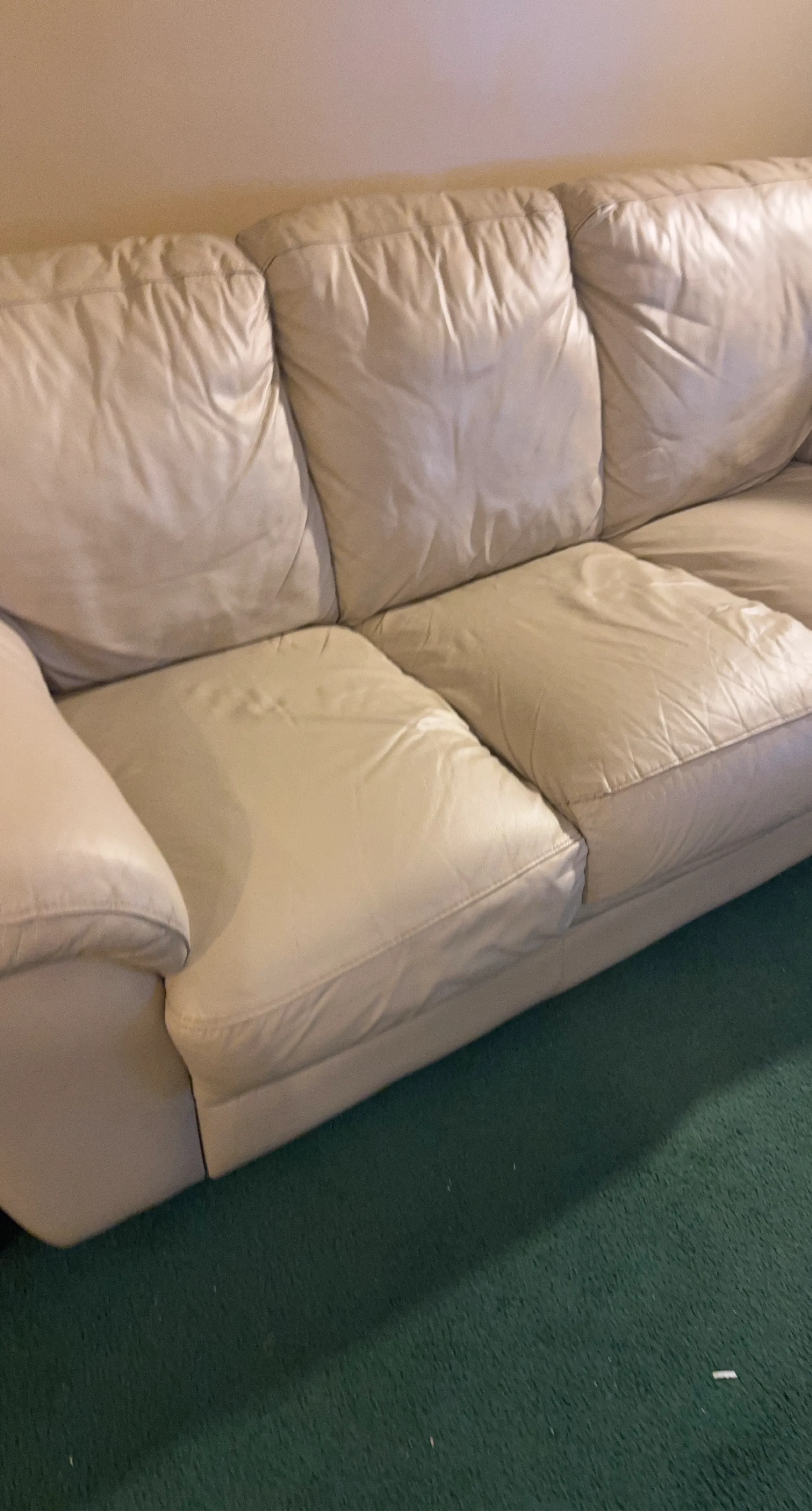 Cream-colored leather sofa with three seat cushions. This sofa is made of genuine leather. It's a comfortable seating option for your living room. Great for a family or entertaining guests!