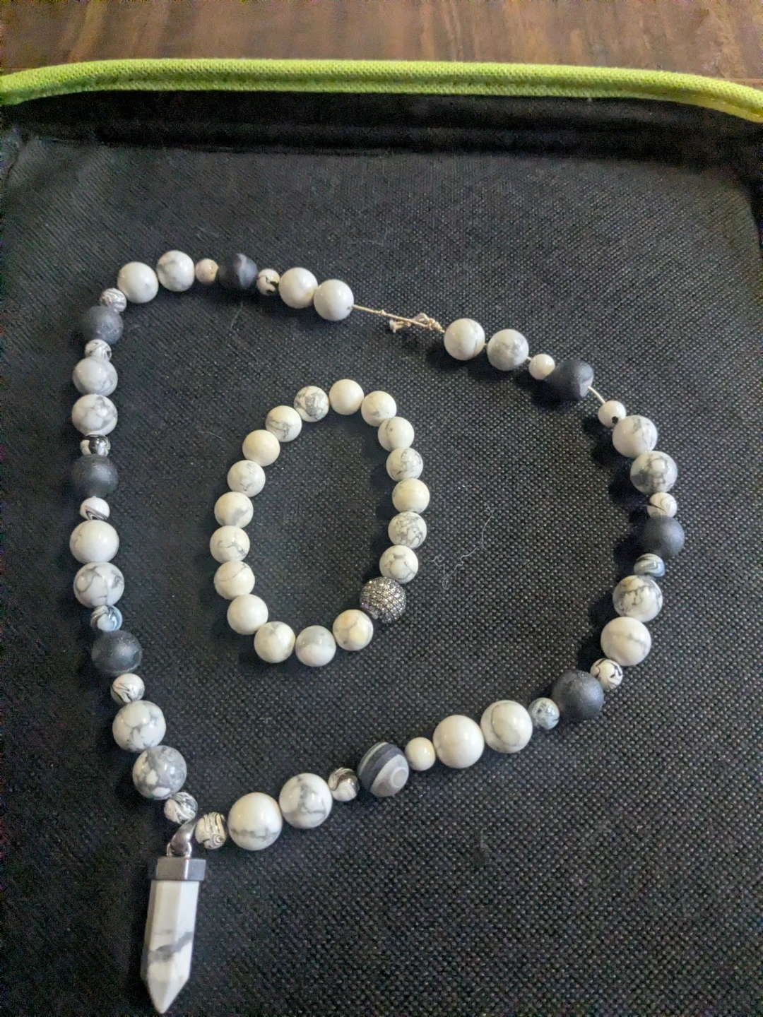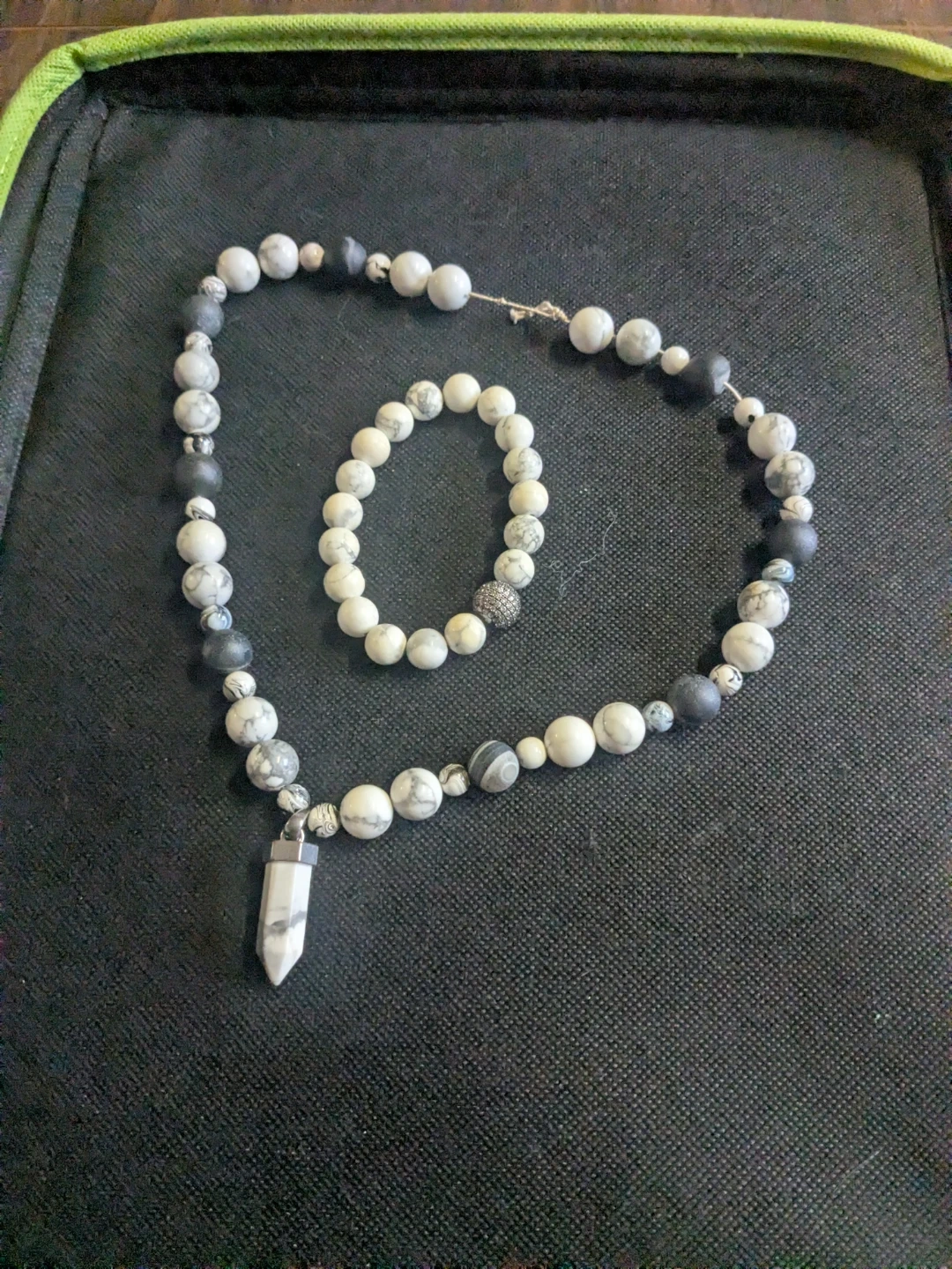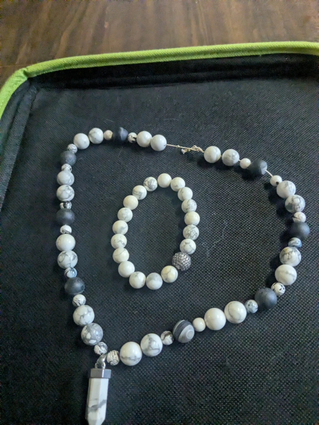 Here's a beautiful beaded necklace and bracelet set! The necklace has a pendant and both feature a lovely mix of white and black beads. They're in great condition and ready to accessorize your outfits