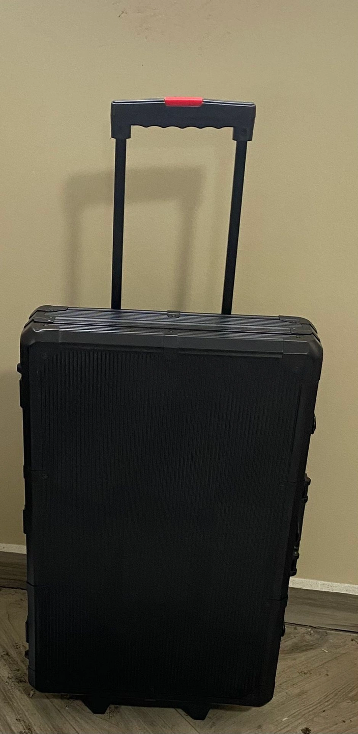 Comes with the black aluminum rolling case with 3 locking mechanisms — super solid build, wheels + handle. Also includes branded acrylic trays, dealer buttons, and a brand new sealed 2-pack of KEM cards (these alone are premium).