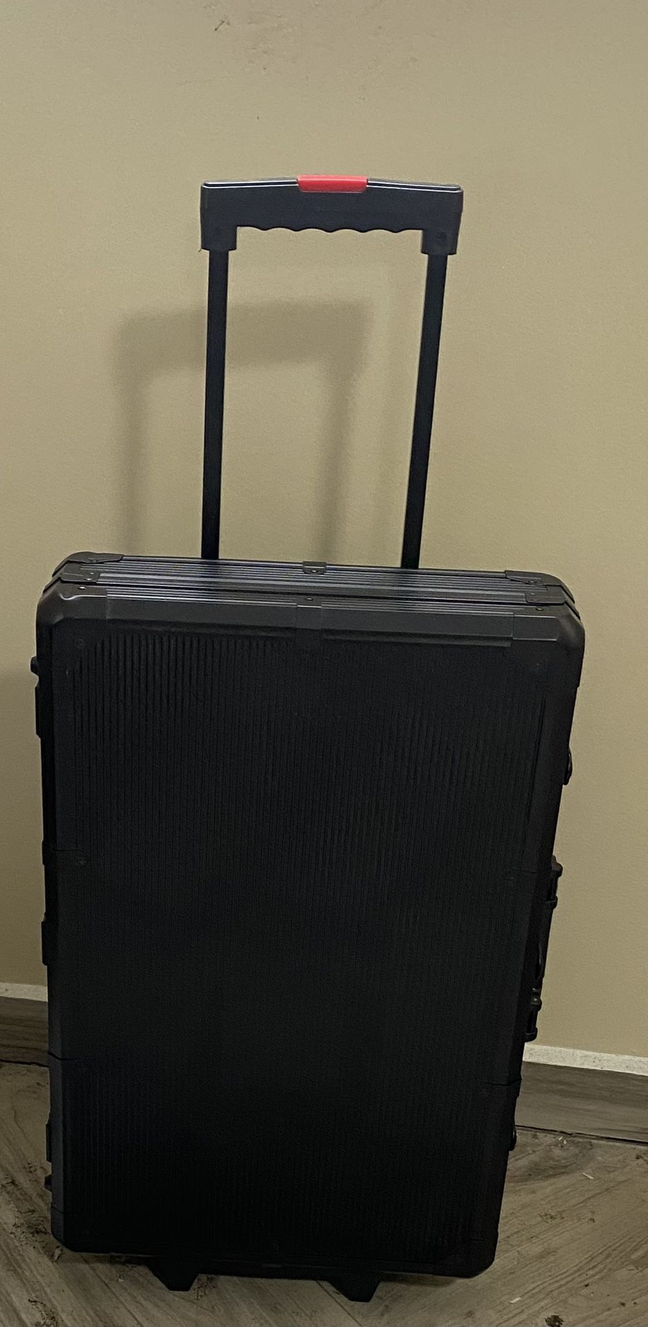 Comes with the black aluminum rolling case with 3 locking mechanisms — super solid build, wheels + handle. Also includes branded acrylic trays, dealer buttons, and a brand new sealed 2-pack of KEM cards (these alone are premium).