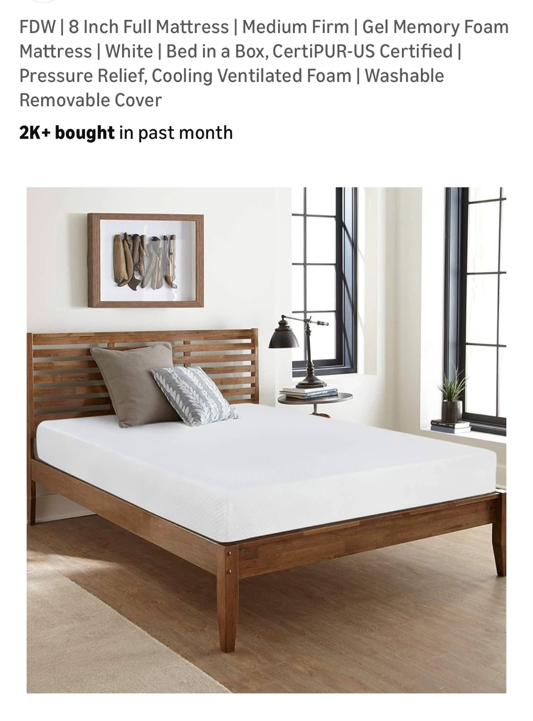 Selling an FDW 8-inch full mattress. It's a medium-firm mattress with gel memory foam. This mattress comes in white and is CertiPUR-US certified. It also offers pressure relief and has cooling ventilated foam with a washable removable cover