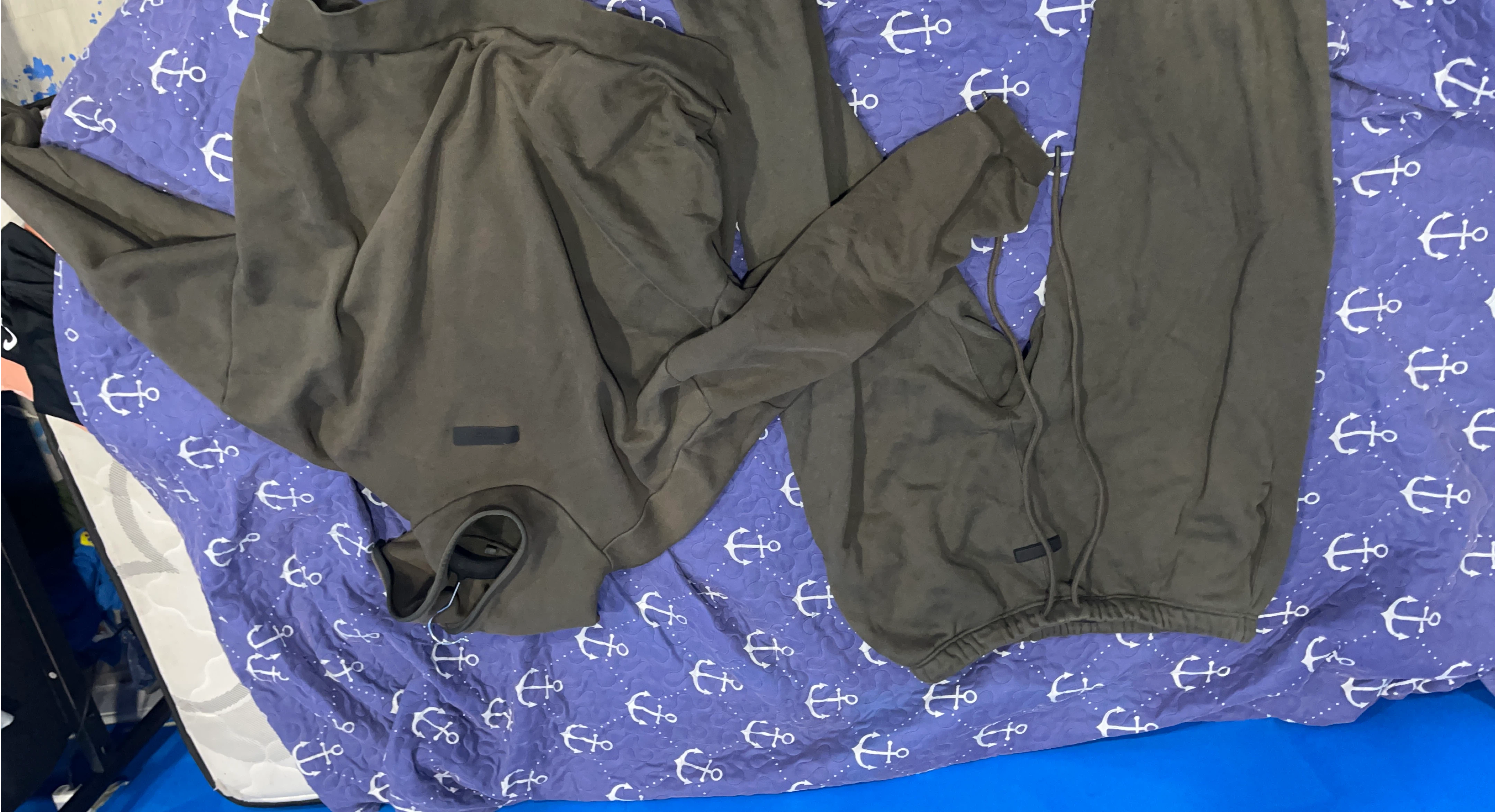 Selling a Fear of God Essentials set in an olive color. It's in great condition and ready for a new home! The set includes both the top and bottom, perfect for a comfy and stylish look.