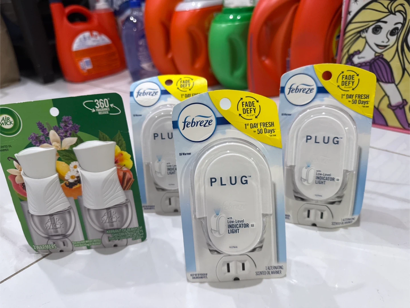 I have Febreze PLUG and Air Wick scented oil warmers available. They both feature a low-level indicator light. The Febreze PLUG provides fade-defy freshness for 50 days on low. Keep your home smelling great!