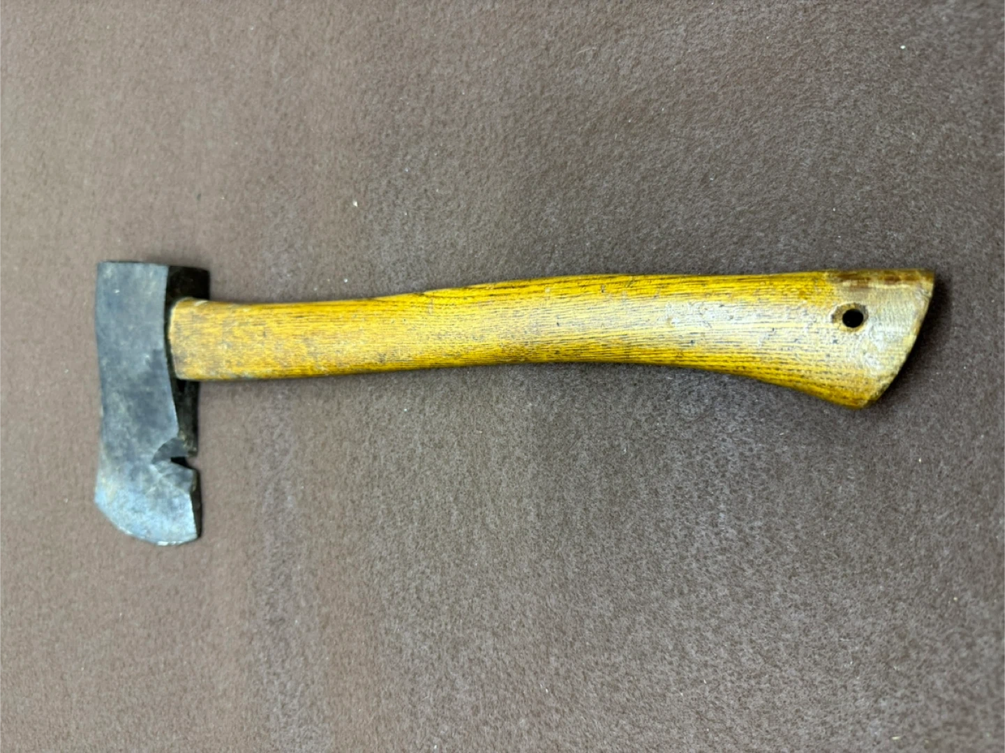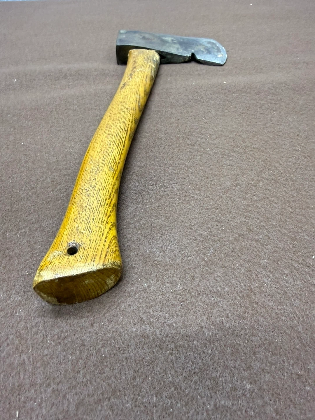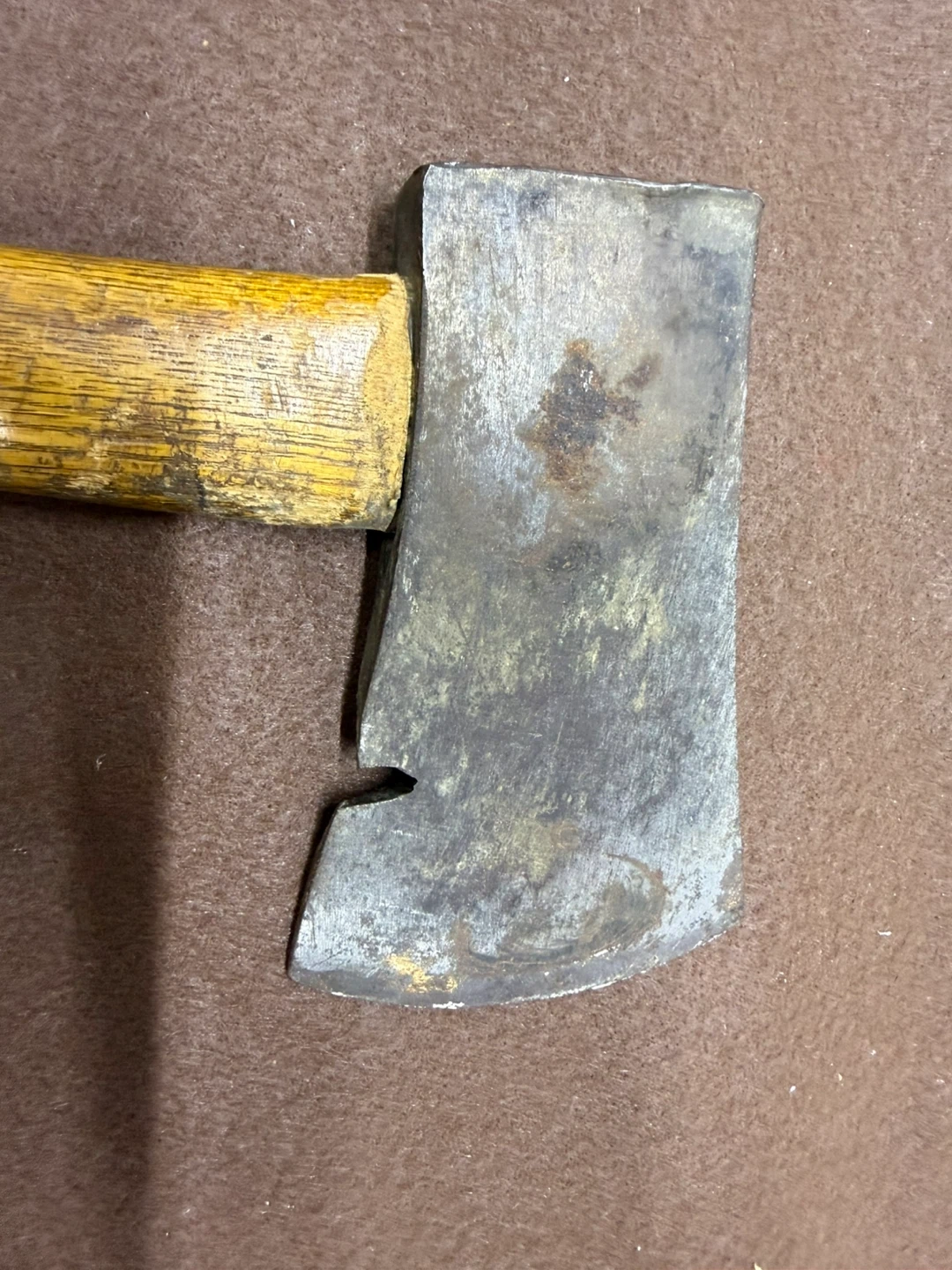 Great for collectors, carpentry tool collections, or workshop use. This is a vintage hand axe with a wooden handle. It measures approximately 13 inches in length. The axe head is metal and shows signs of age and use.