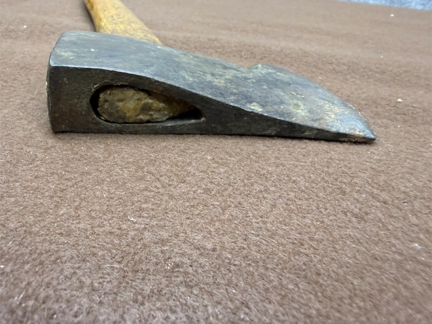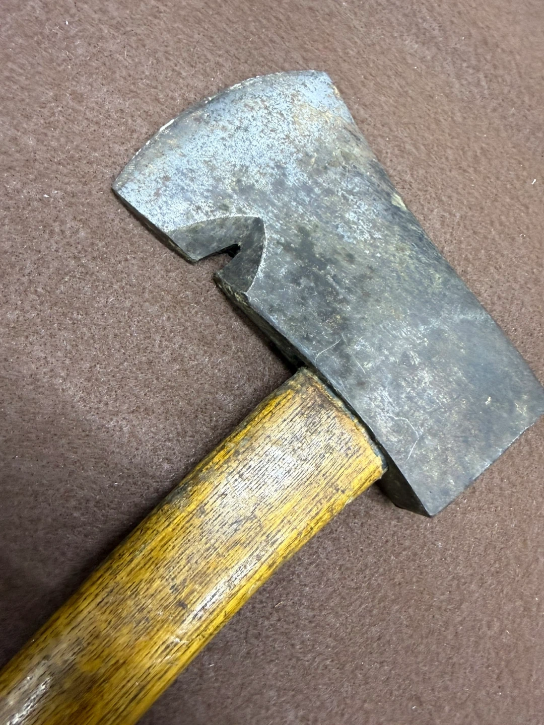 Vintage roofing / shingle hatchet with forged steel head and wooden handle.