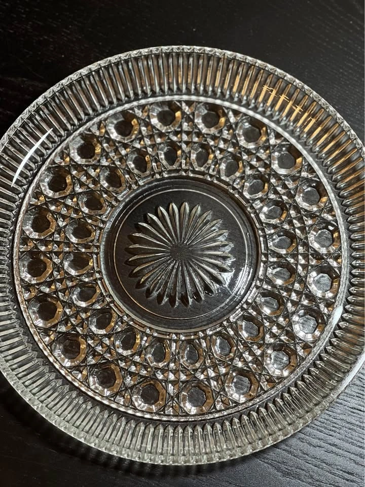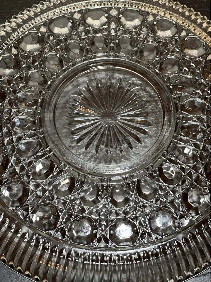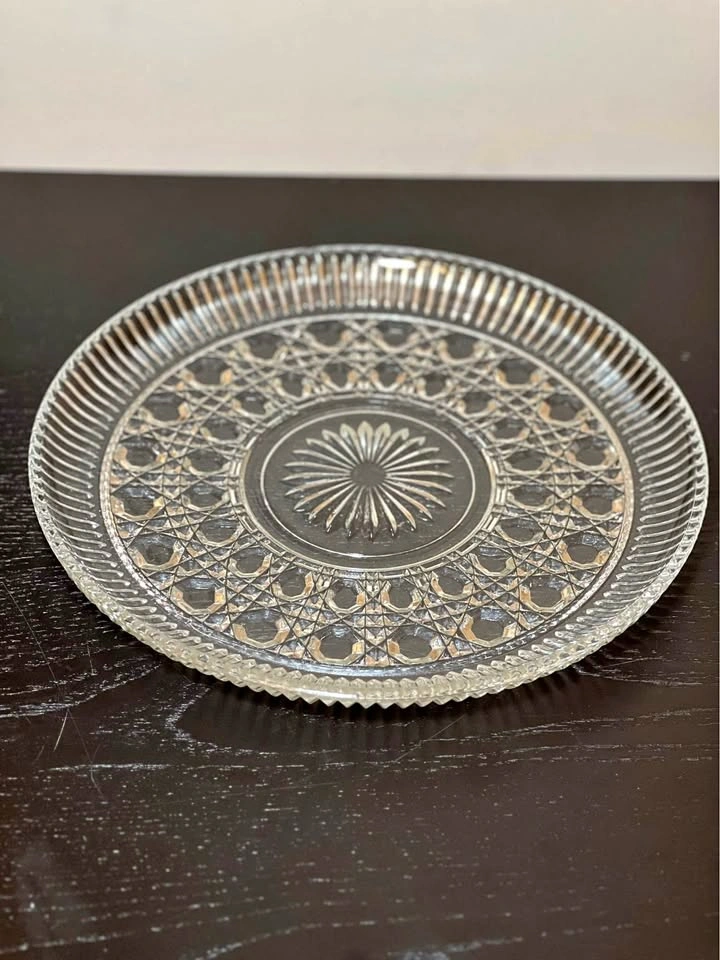 98This is a vintage clear glass serving plate from the Windsor pattern by Federal Glass. The pattern is also known as "Button & Cane". Manufacturer: Federal Glass Company, which was founded in 1900 and went out of business around 1979. Pattern: Windsor "Button & Cane," first produced by Federal Glass in the early 1970s. Description: The plate features a pressed glass design with a sunburst or starburst center and a circular pattern of "buttons" and "canes". Approx 11” in diameter.