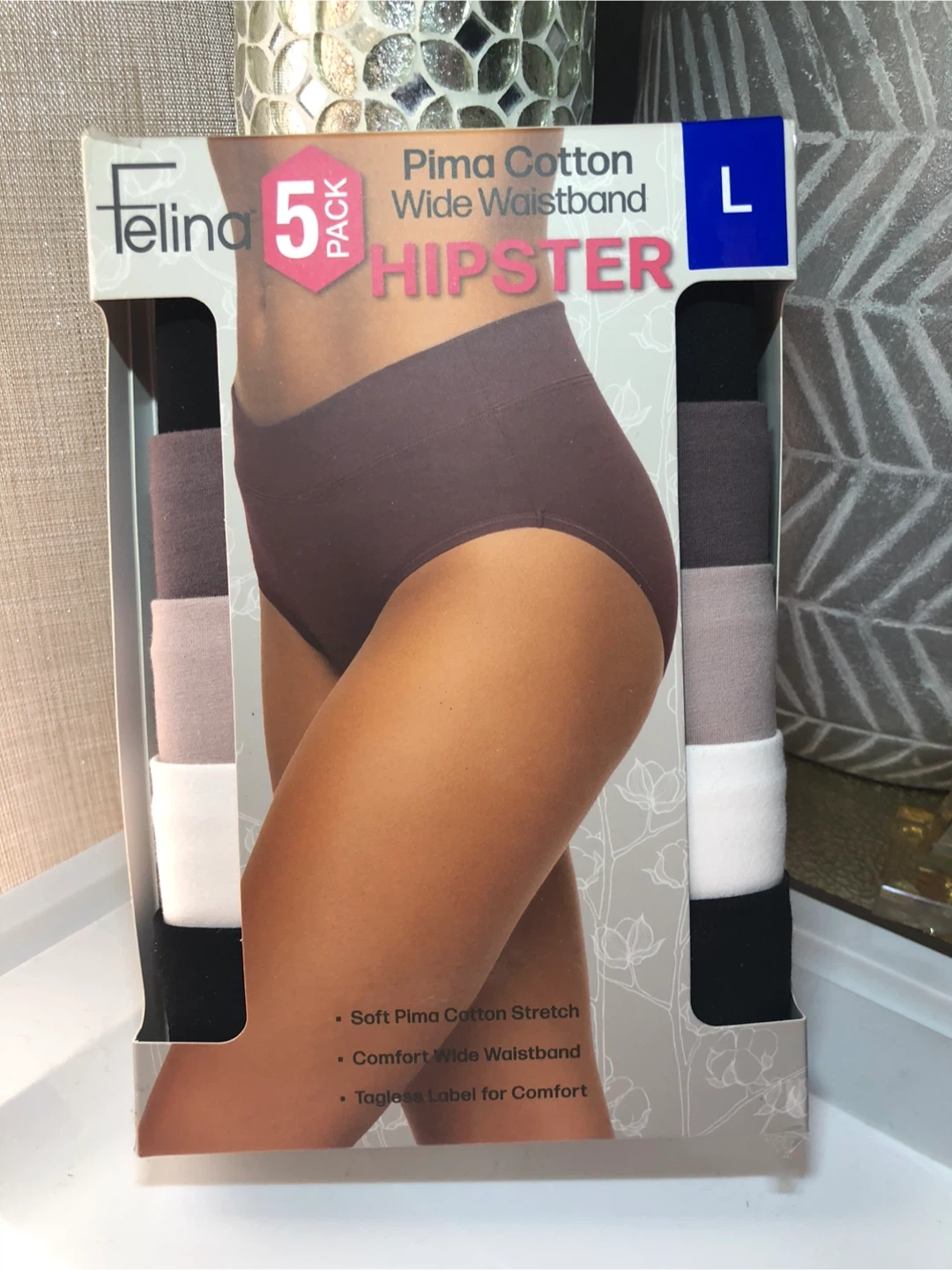37Selling a pack of Felina Pima Cotton Wide Waistband Hipster underwear. This is a 5-pack, size L. They feature a comfort wide waistband, soft Pima cotton stretch, and a tagless label for comfort. Made of 91% Pima cotton and 9% Spandex/Elastano