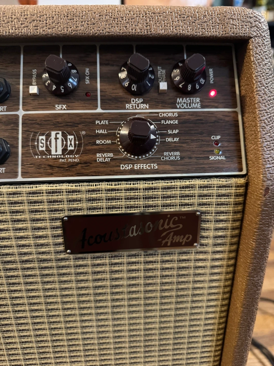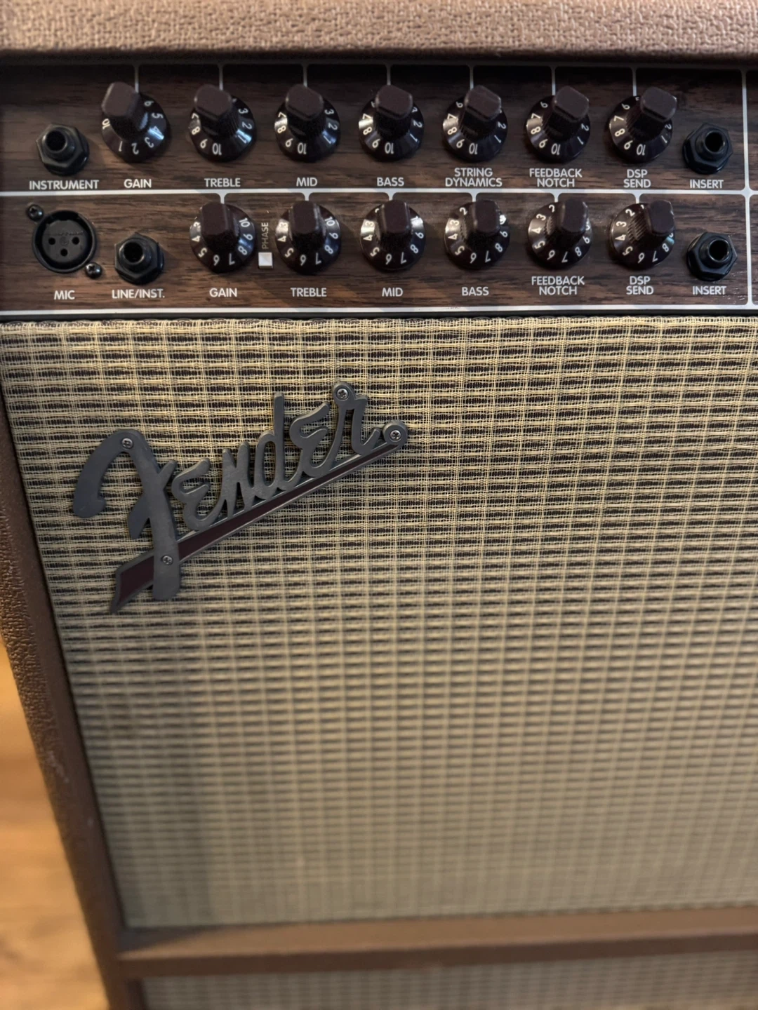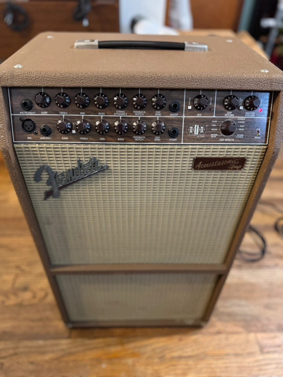Selling a Fender Acoustasonic amplifier. It has various controls for gain, treble, mid, bass, and dynamics. Also features DSP effects like reverb, delay, chorus, and flange. Great for acoustic instruments!