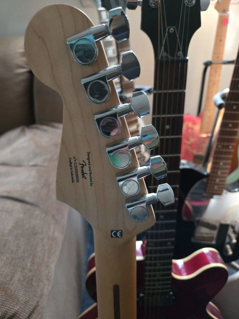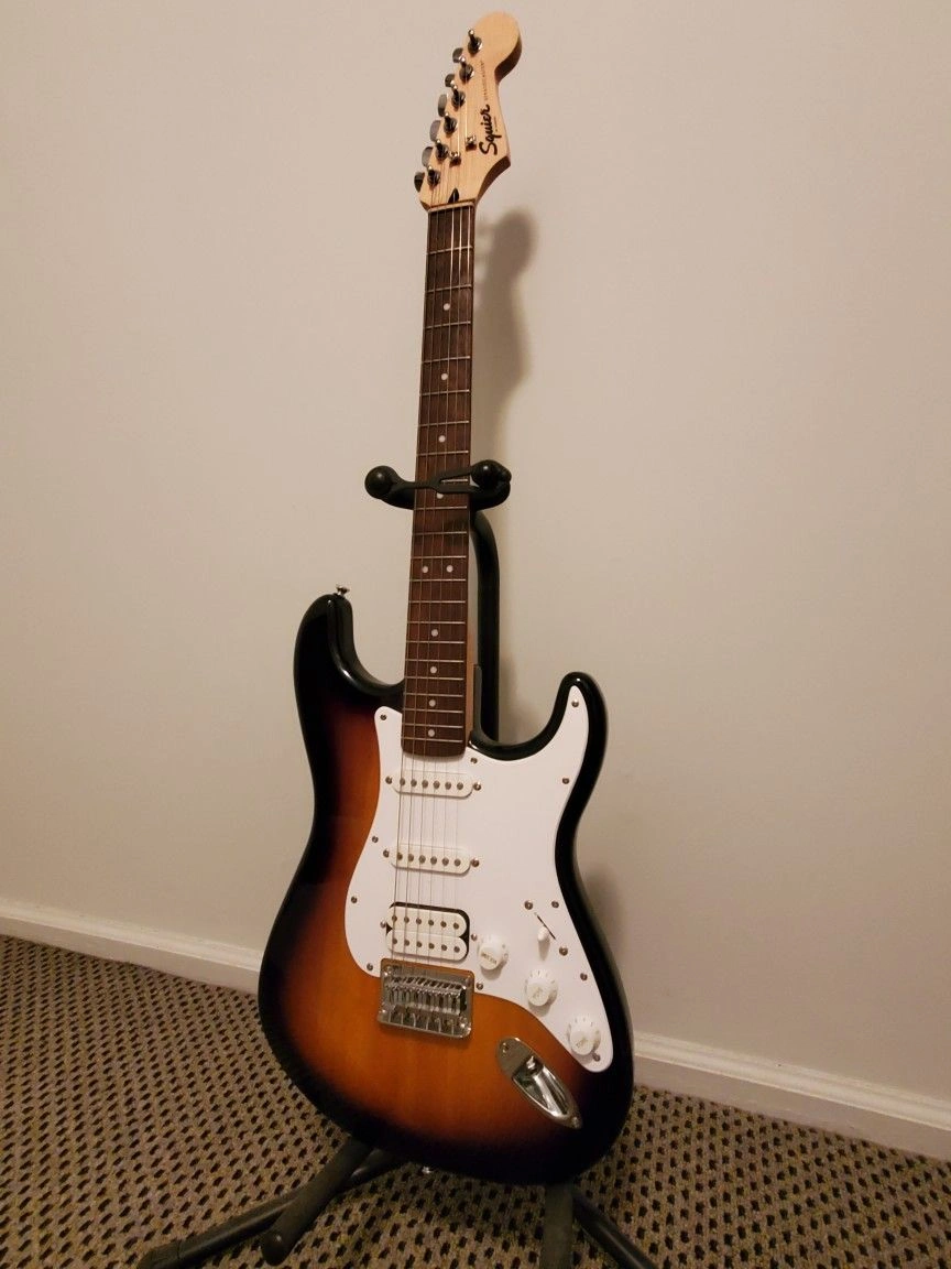 In like new condition. HSS, Brown Sunburst, Rosewood Fretboard Can pair with a 25-watt amplifier for an additional $75 Body Color: Brown Sunburst Size: 4/4 Right Or Left Handed: Right-handed Type: Electric Brand: Fender Squire