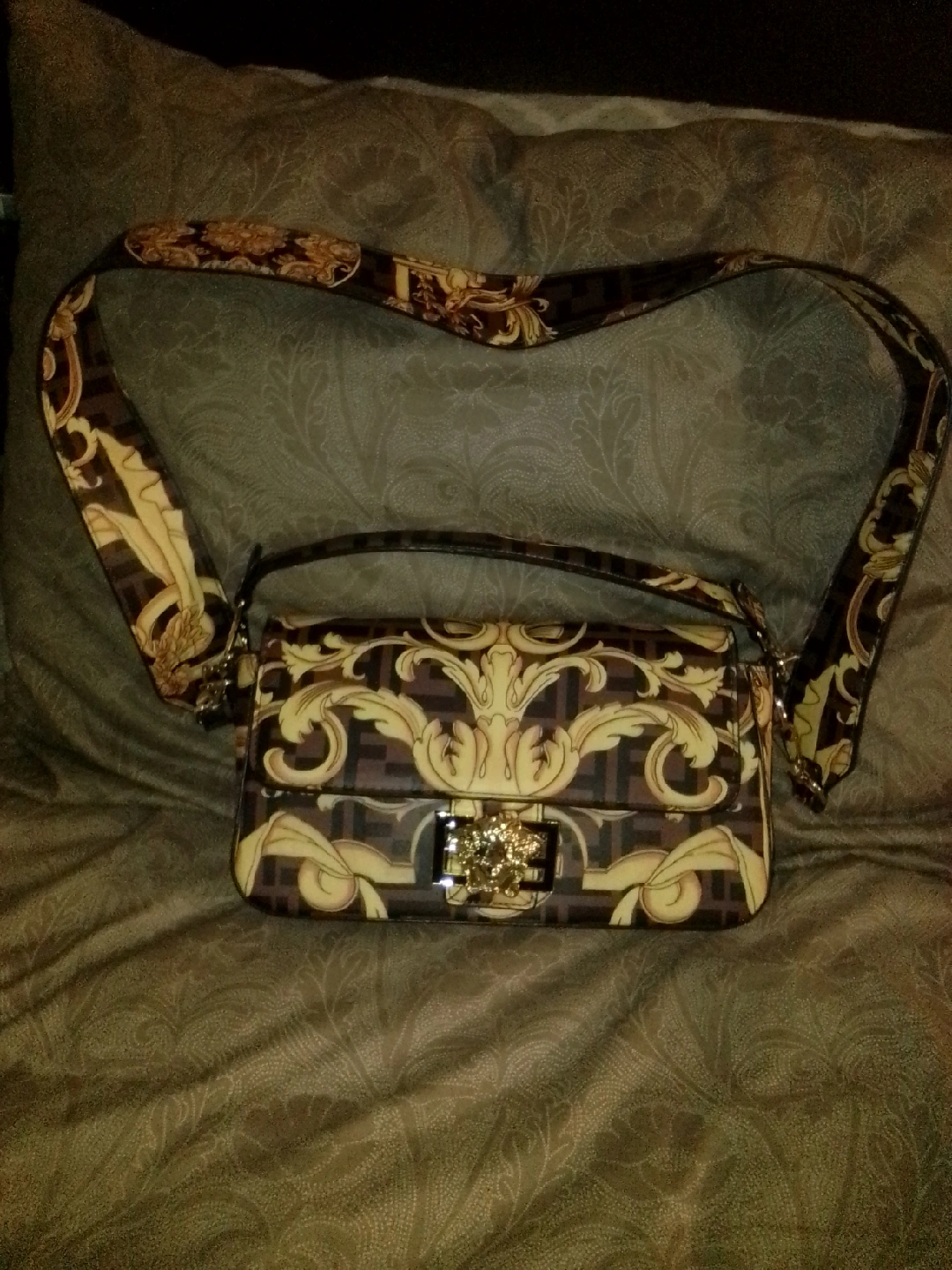 Selling a Fendi handbag with a brown and gold design. It has a shoulder strap and a gold-colored buckle. The handbag is in perfect condition and ready for a new home!