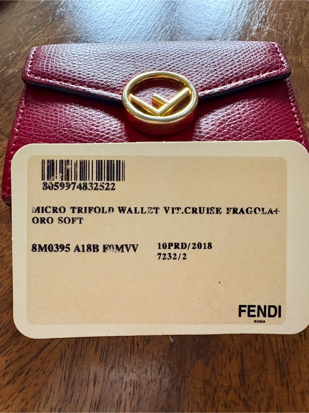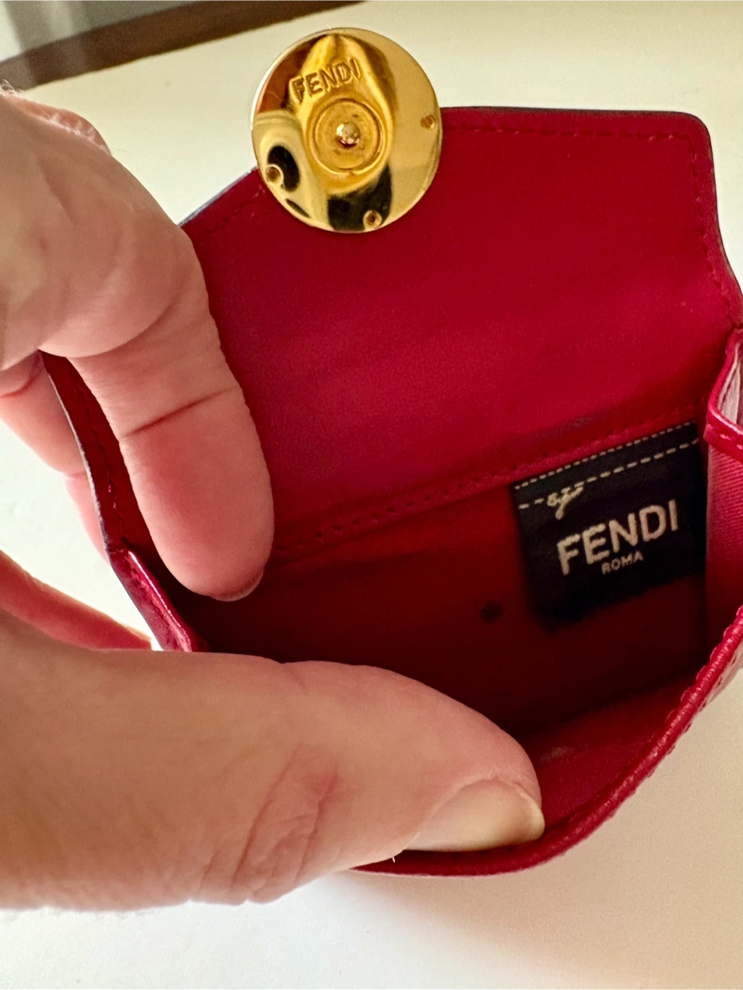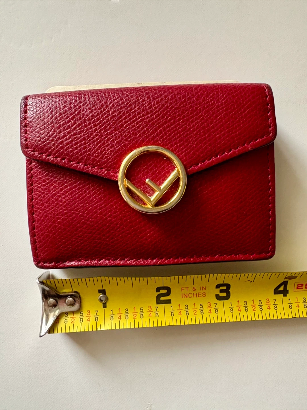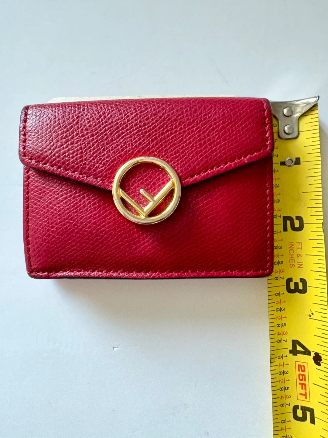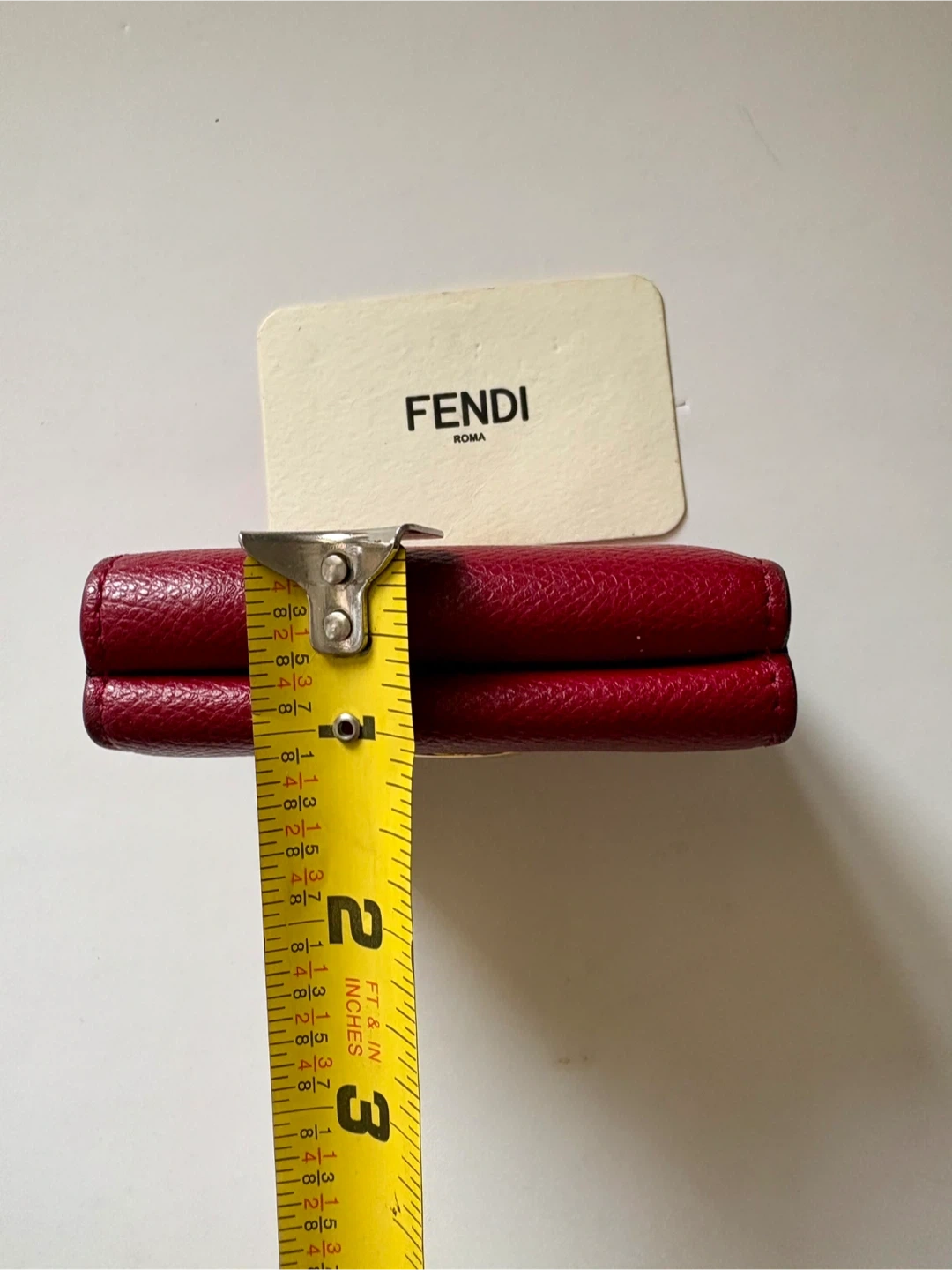 FENDI red calf leather micro wallet with gold hardware. Comes with certificate of authenticity (pictured in the photos). It was well cared for and has no scratches or scuff marks, just a bit of coin residue on the lining in coin compartment. With the reputable brand of Fendi, this wallet exudes quality and sophistication, making it a versatile and timeless piece for both men and women.