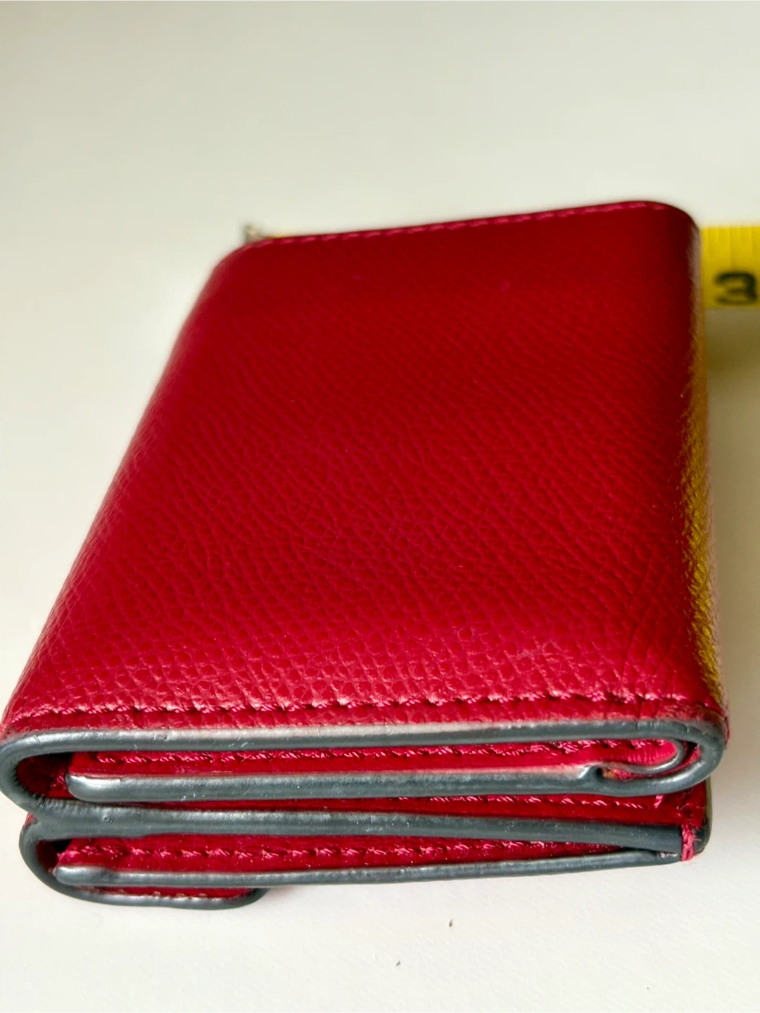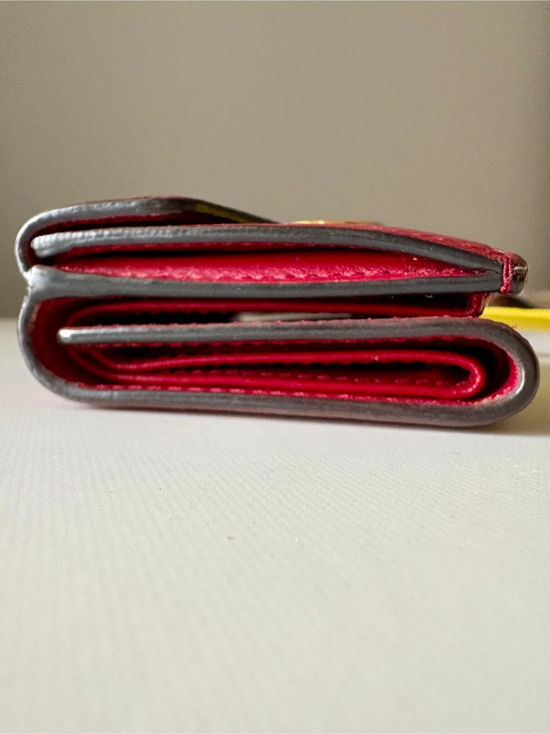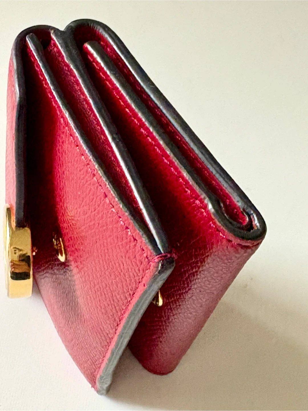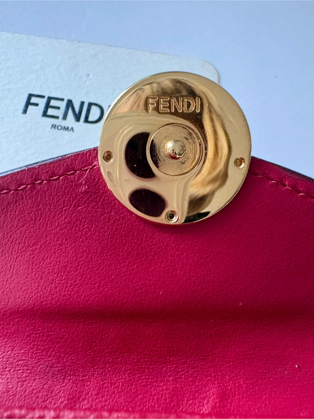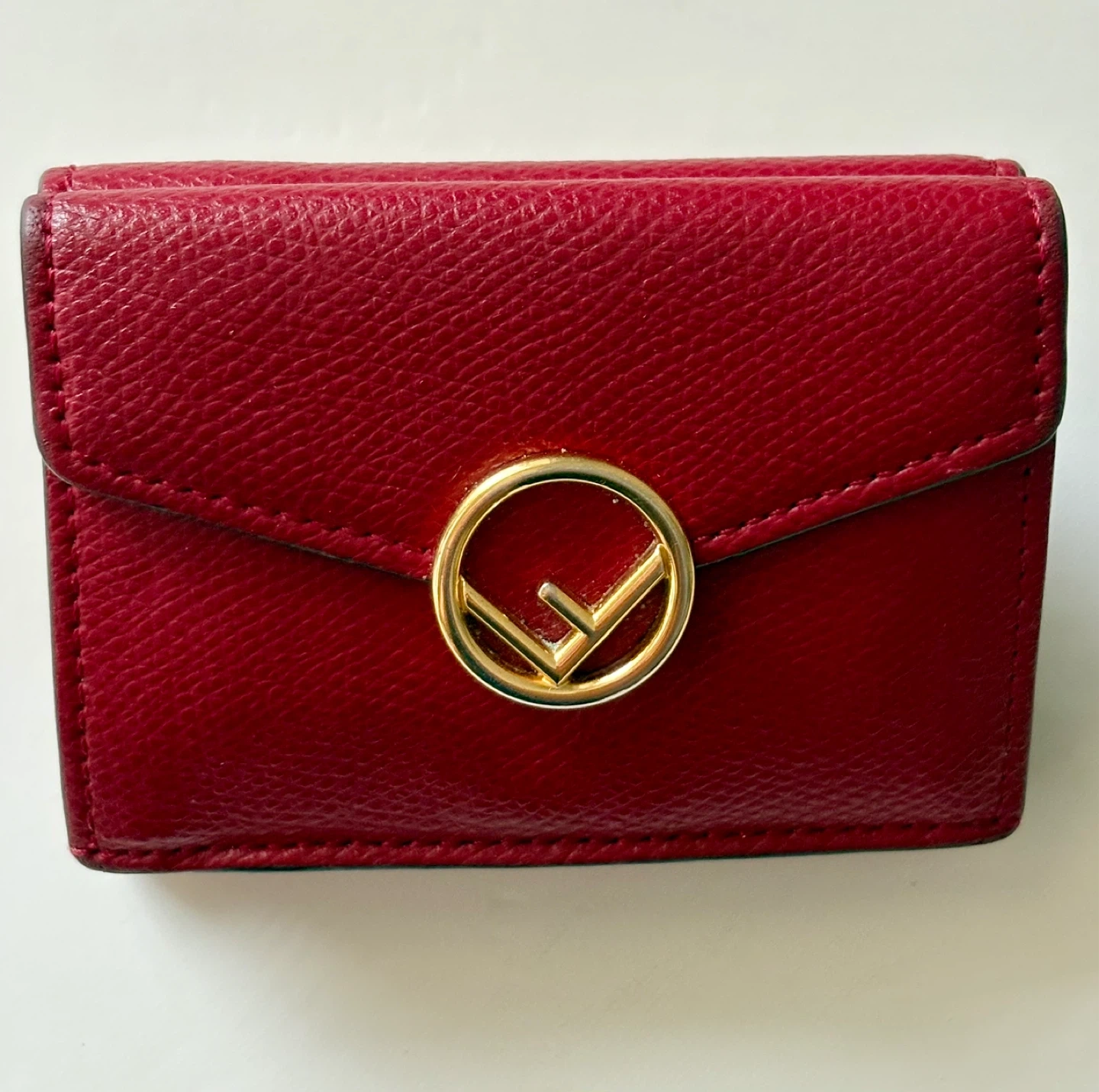 FENDI red calf leather micro wallet with gold hardware. Comes with certificate of authenticity (pictured in the photos). It was well cared for and has no scratches or scuff marks, just a bit of coin residue on the lining in coin compartment. With the reputable brand of Fendi, this wallet exudes quality and sophistication, making it a versatile and timeless piece for both men and women.