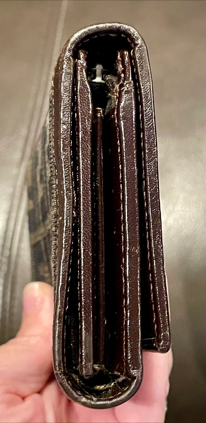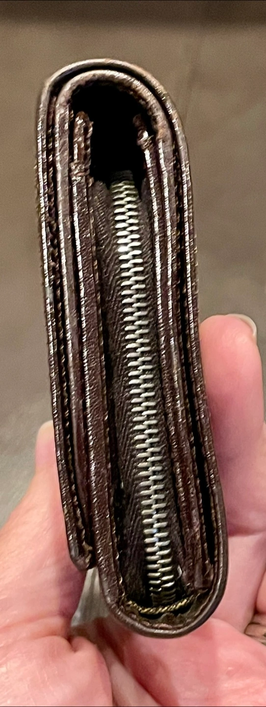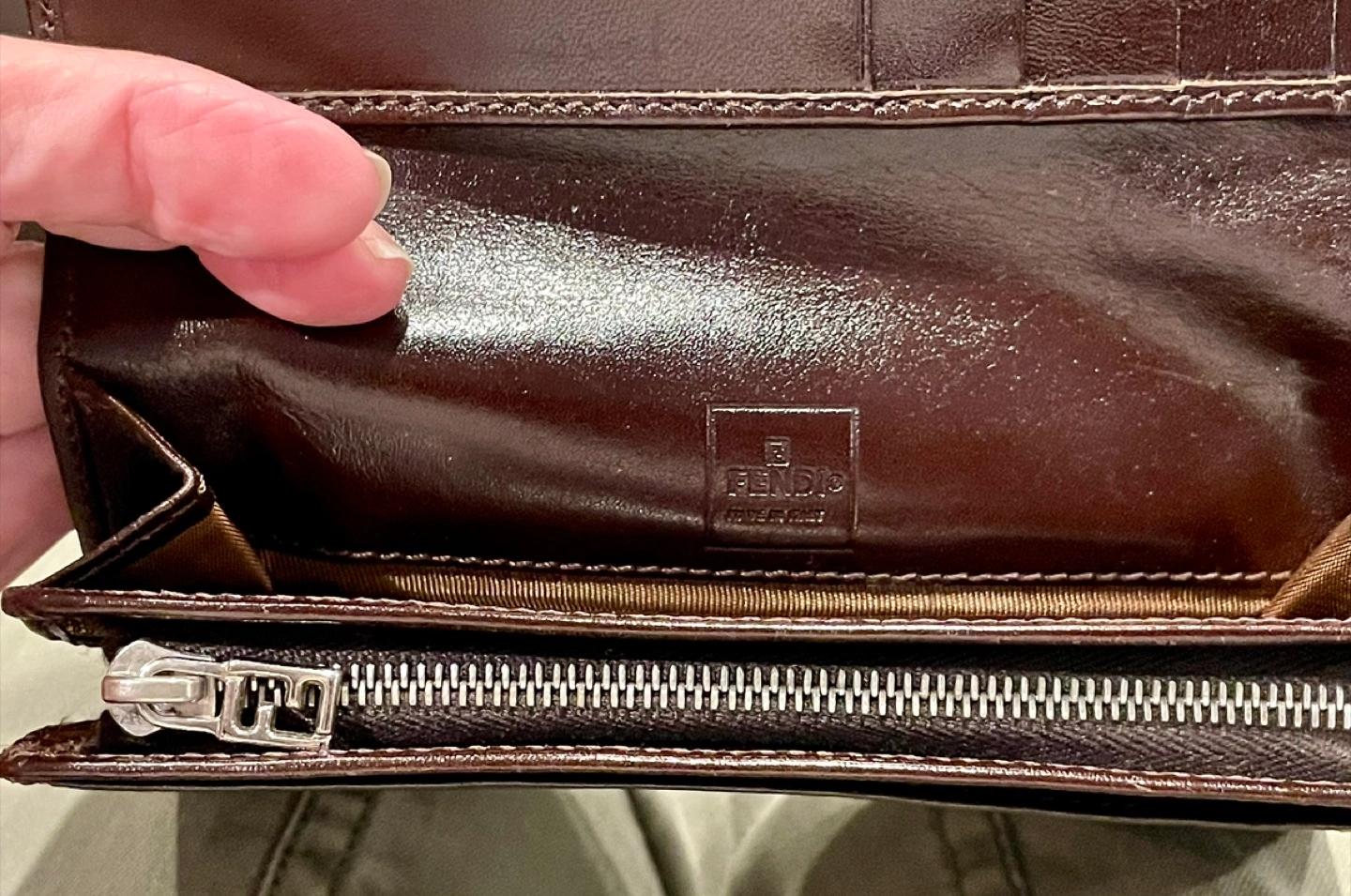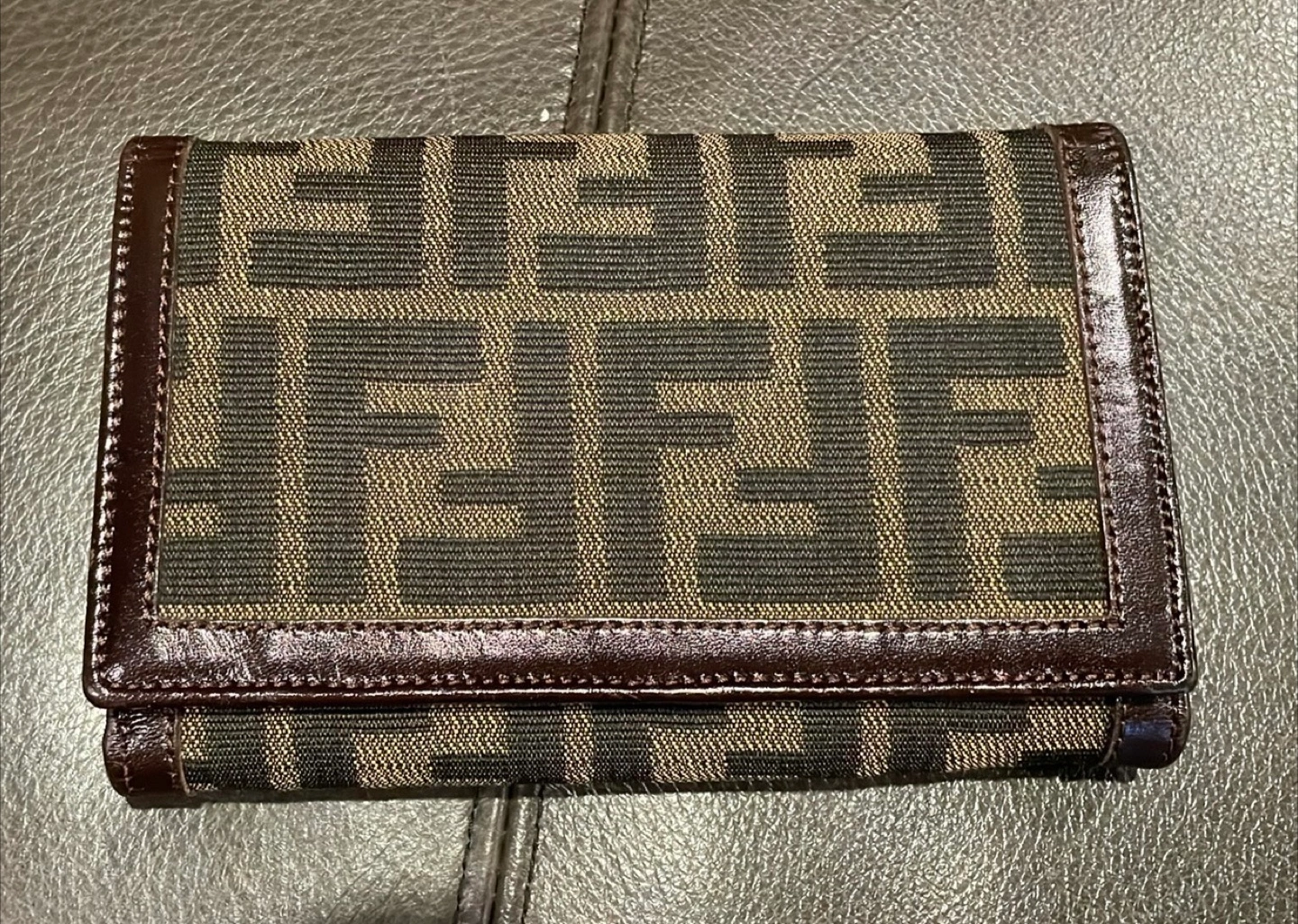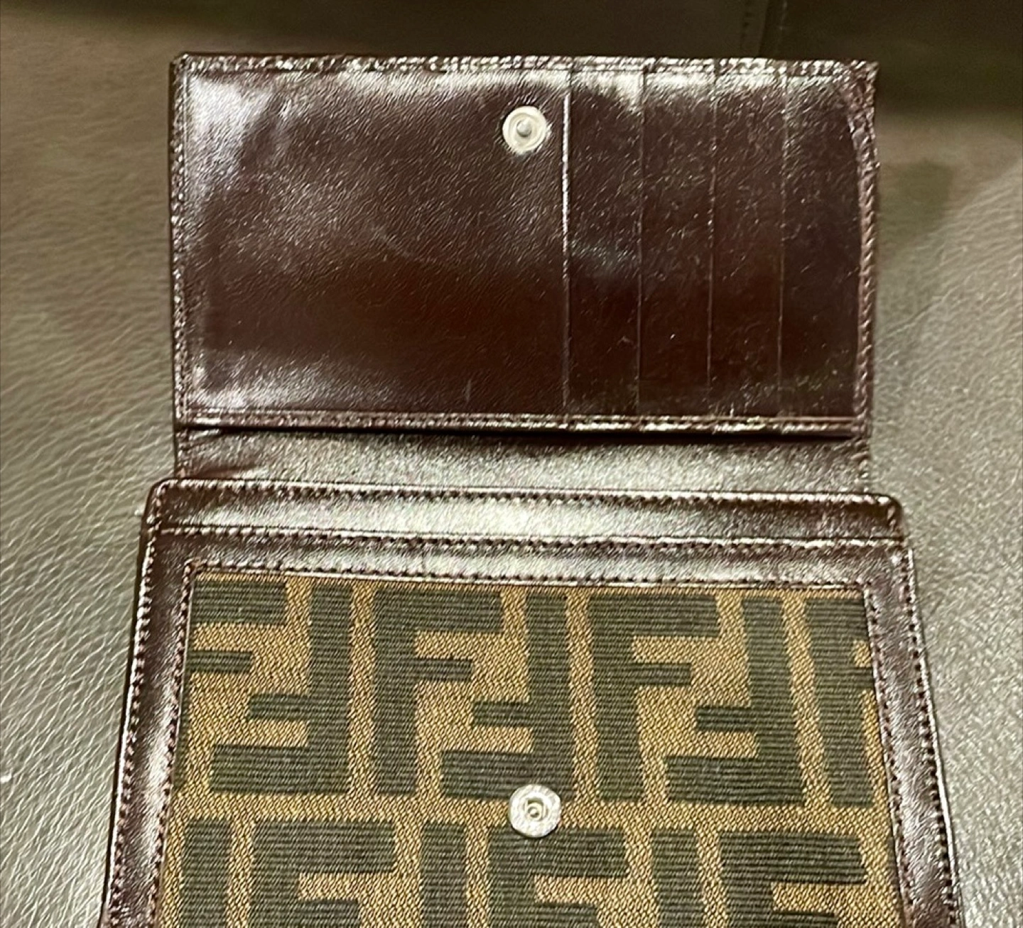 Selling a Fendi Zucca wallet in brown. It has a zipper and a snap closure. It's in excellent condition and ready for a new home!
