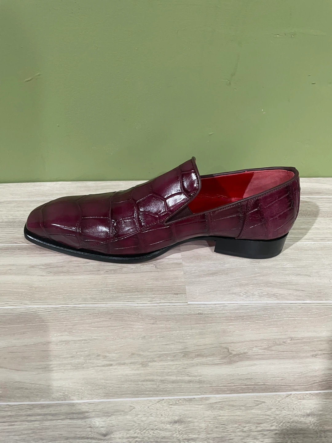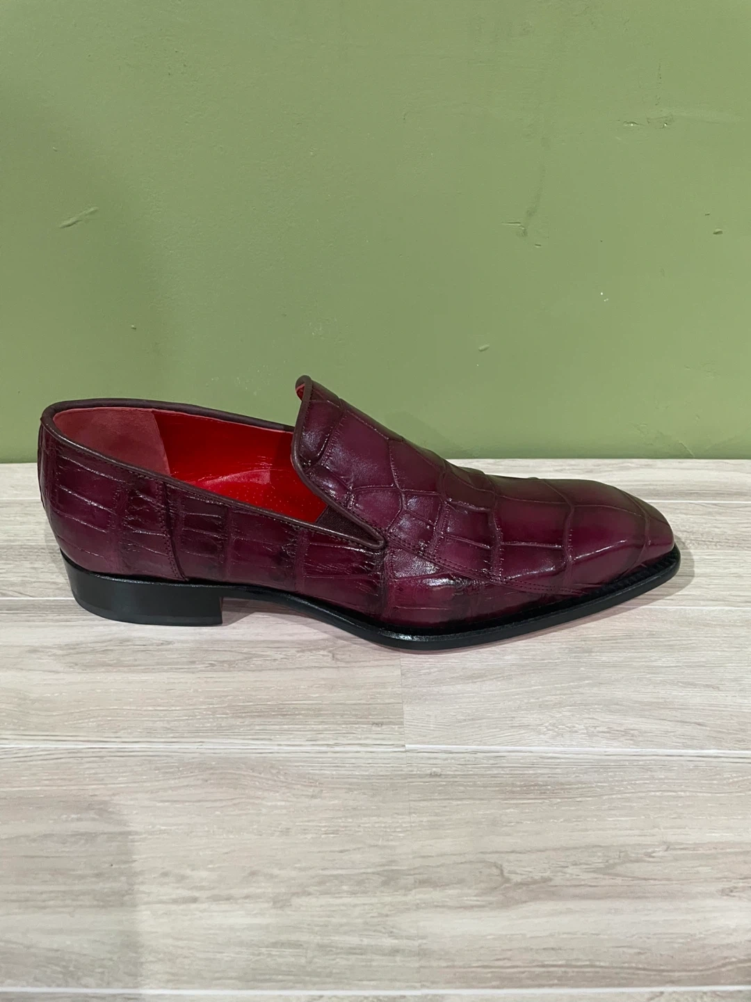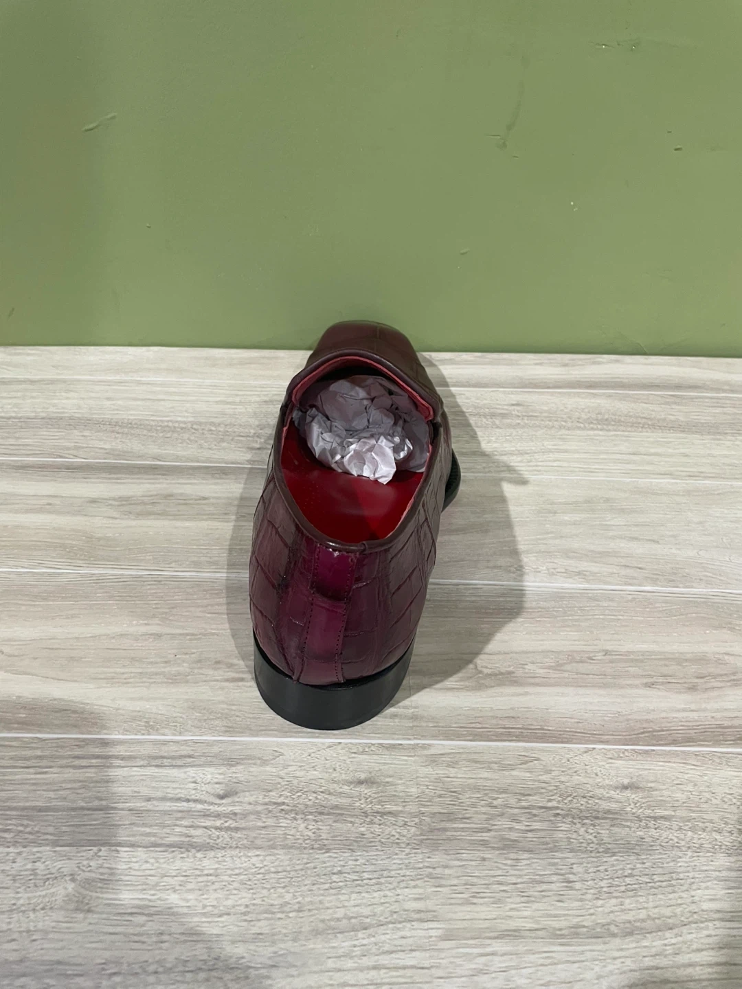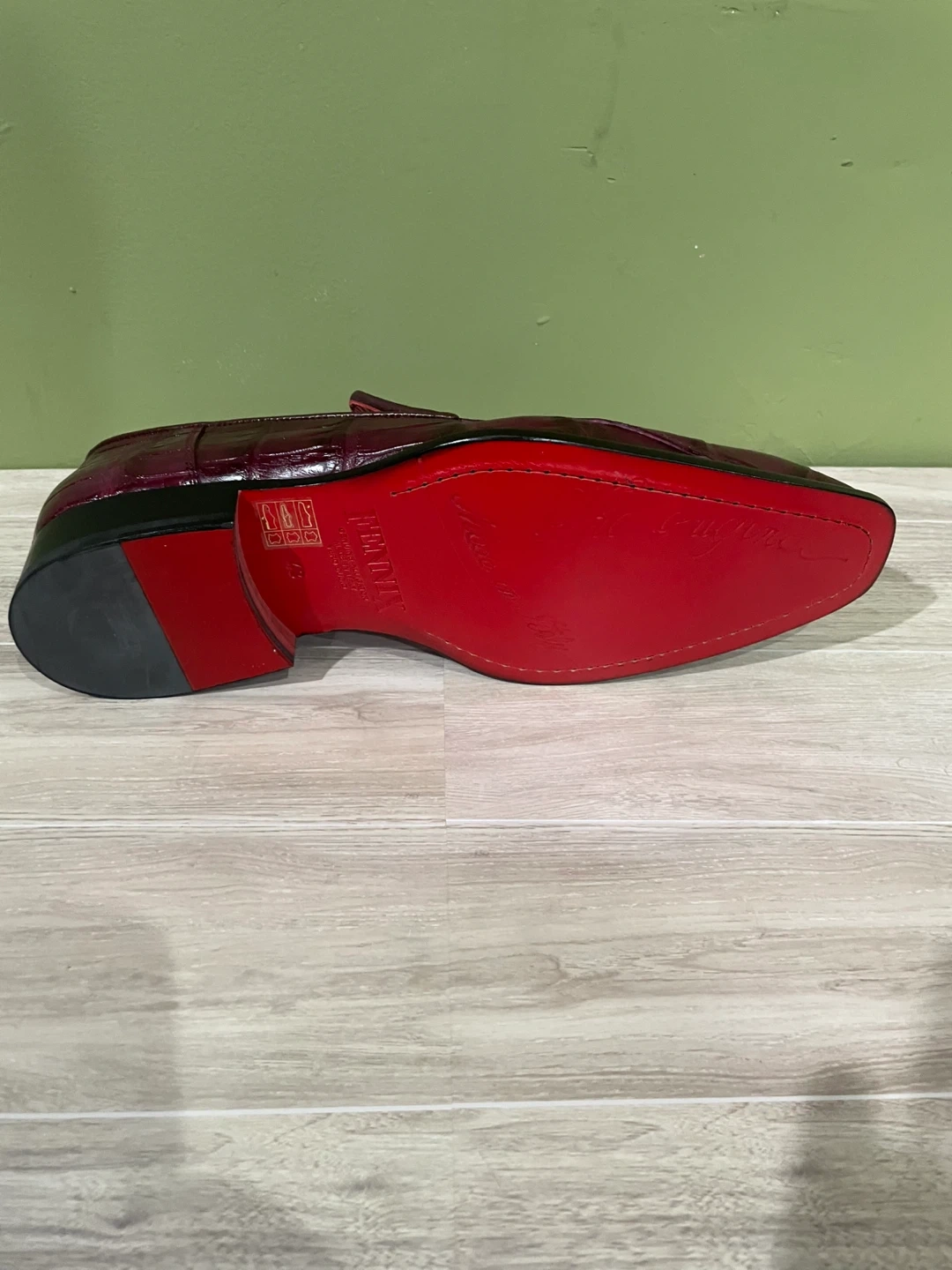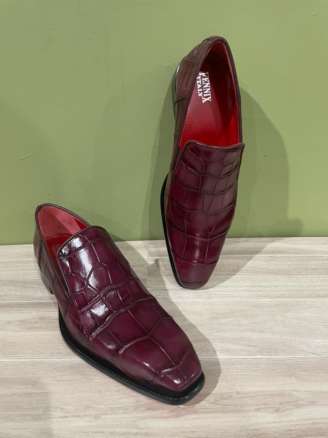 New in box made in Italy These are a pair of FENNIX Italy loafers in a beautiful burgundy color with an alligator skin red bottom sole . They feature a red sole and a classic loafer design. Perfect for adding a touch of sophistication to your wardrobe!