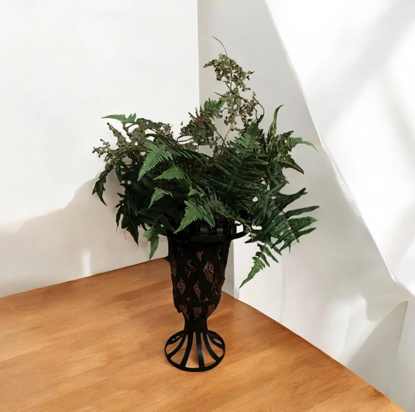 Artificial ferns in a decorative metal vase. It's in good condition and will add a nice touch to any room!
