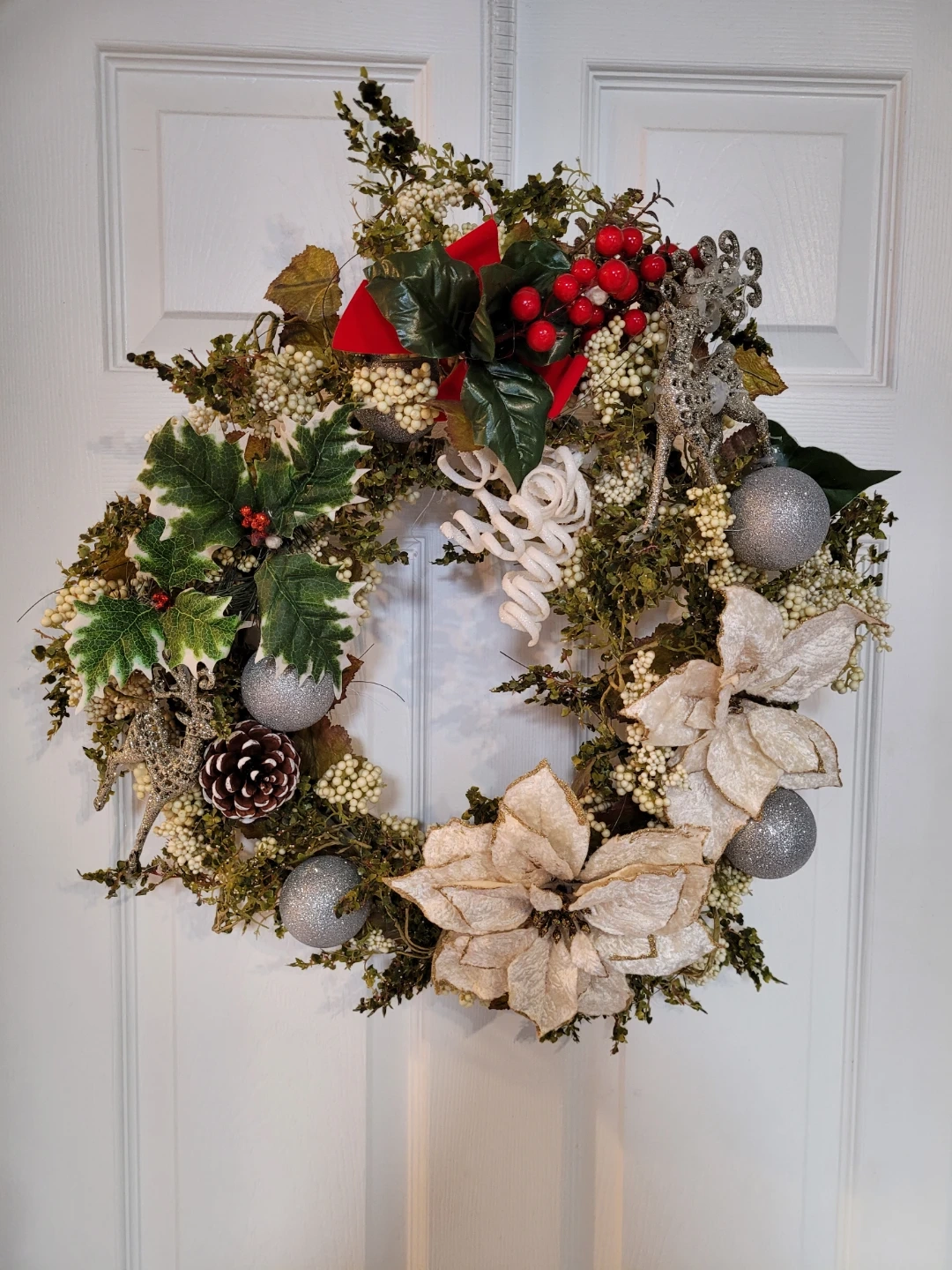 85Festive Crafted Christmas wreath featuring a silver reindeer, berries, pinecones, and ornaments! Perfect for adding a touch of holiday cheer to your door or wall. Feel free to check out my other unique items listed.
