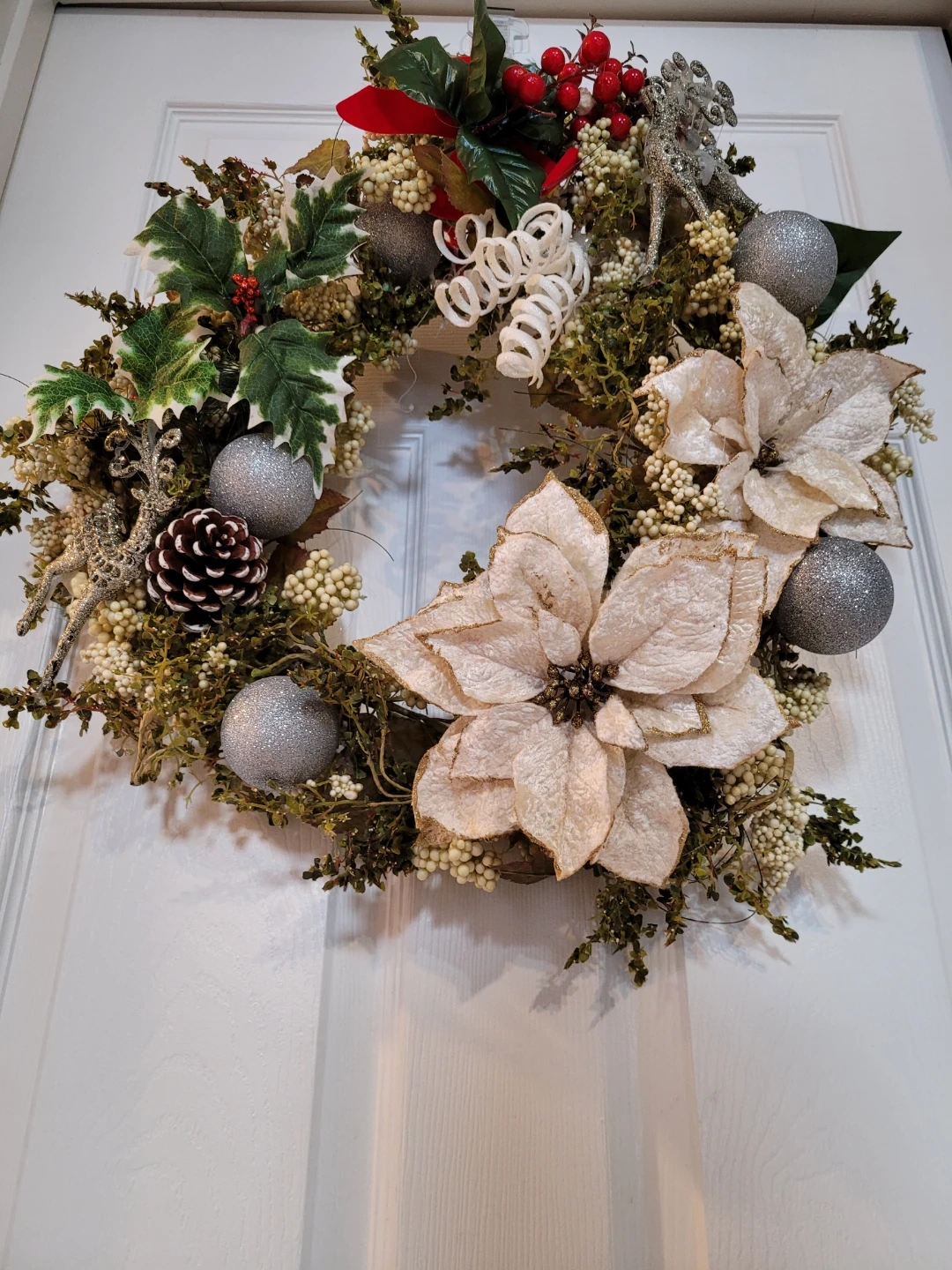 Crafted Christmas Wreath w/ Red Poinsettias & Ornaments