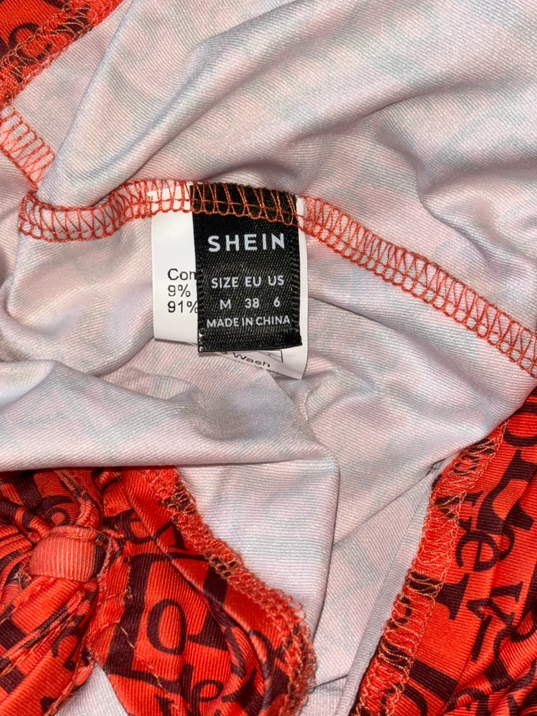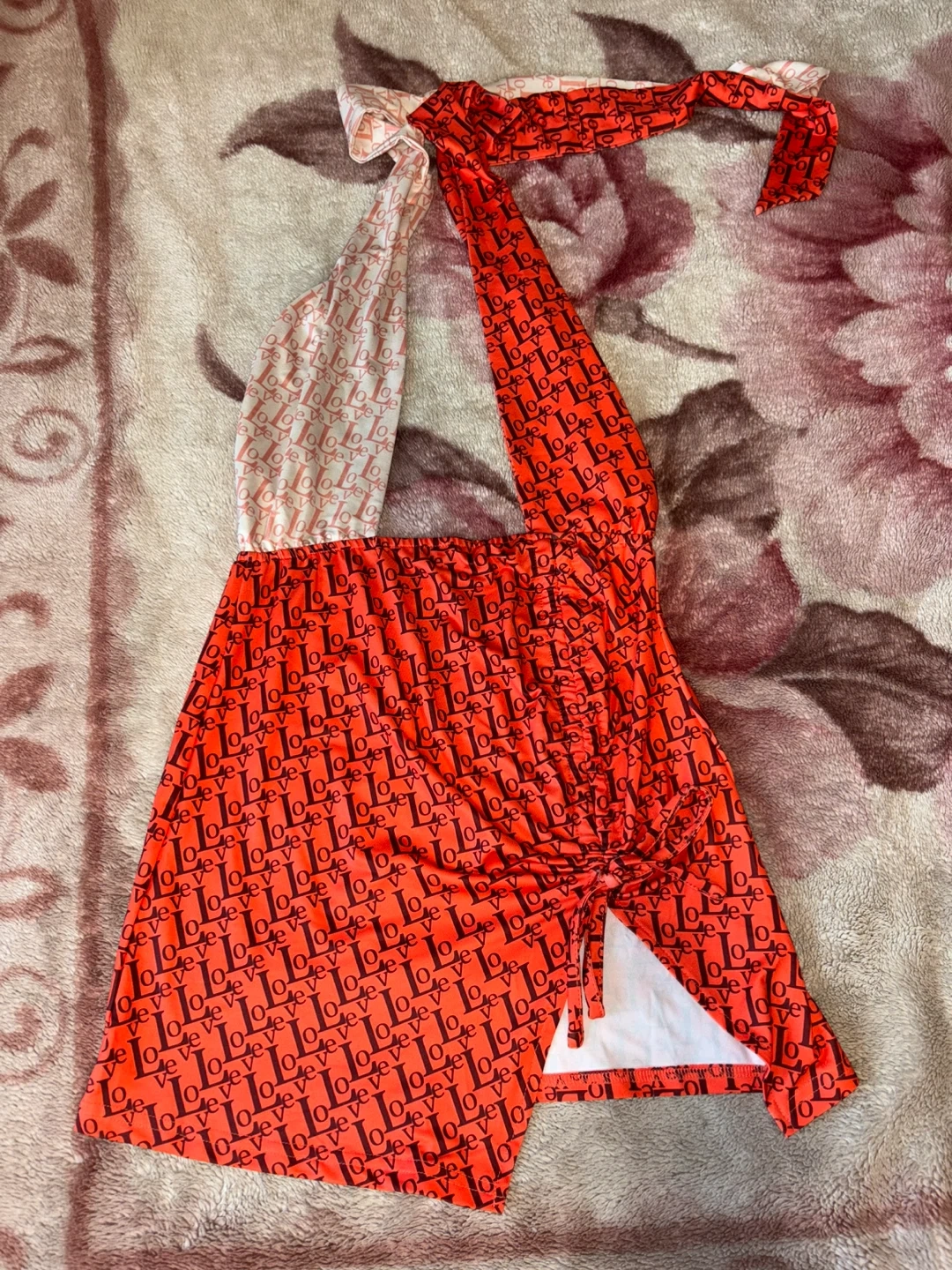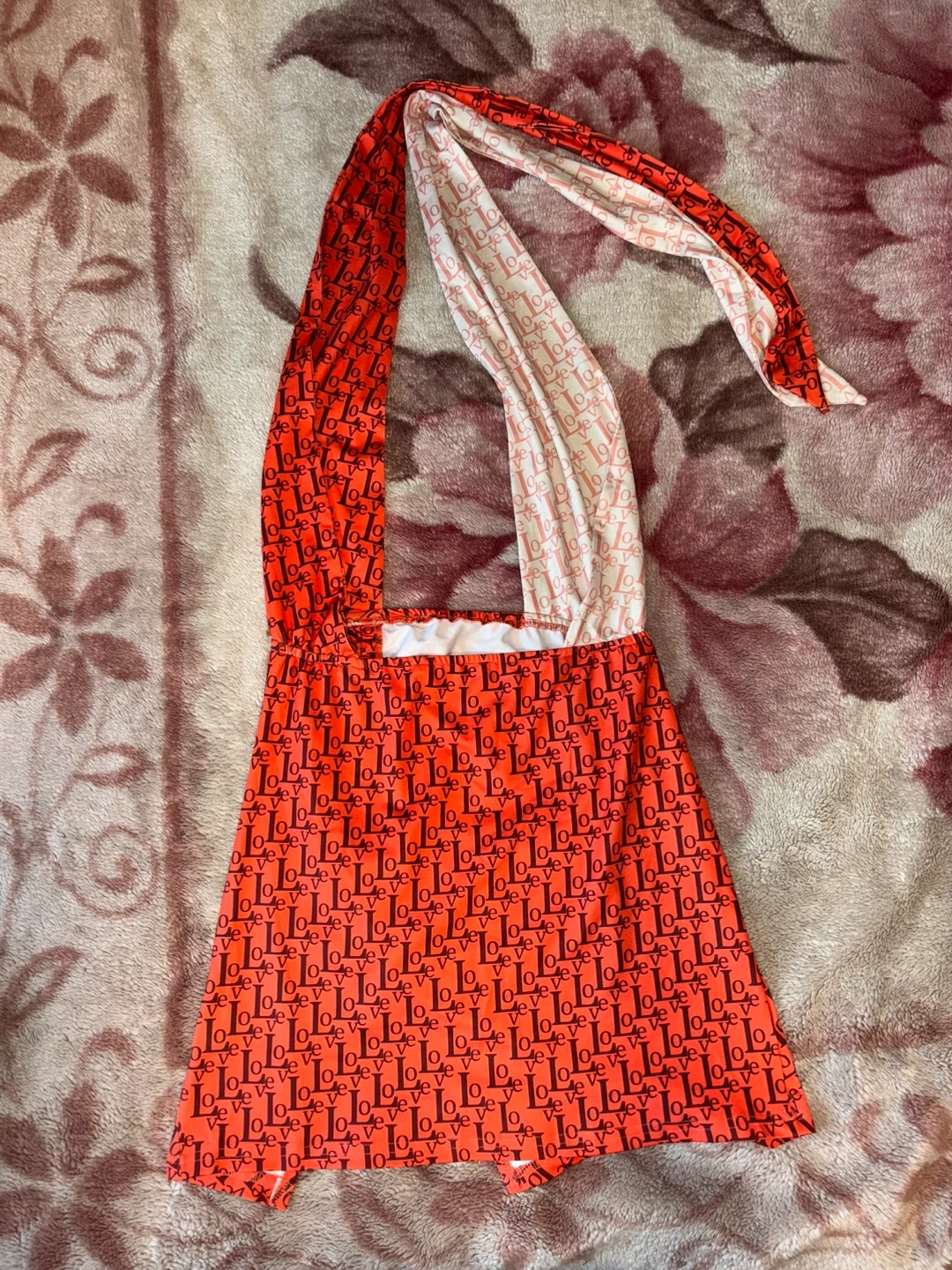 This SHEIN halter dress features an all-over logo print in orange, cream and black. It's a size medium and made in China. The dress has a unique, asymmetric design with a versatile tie closure at the neck.