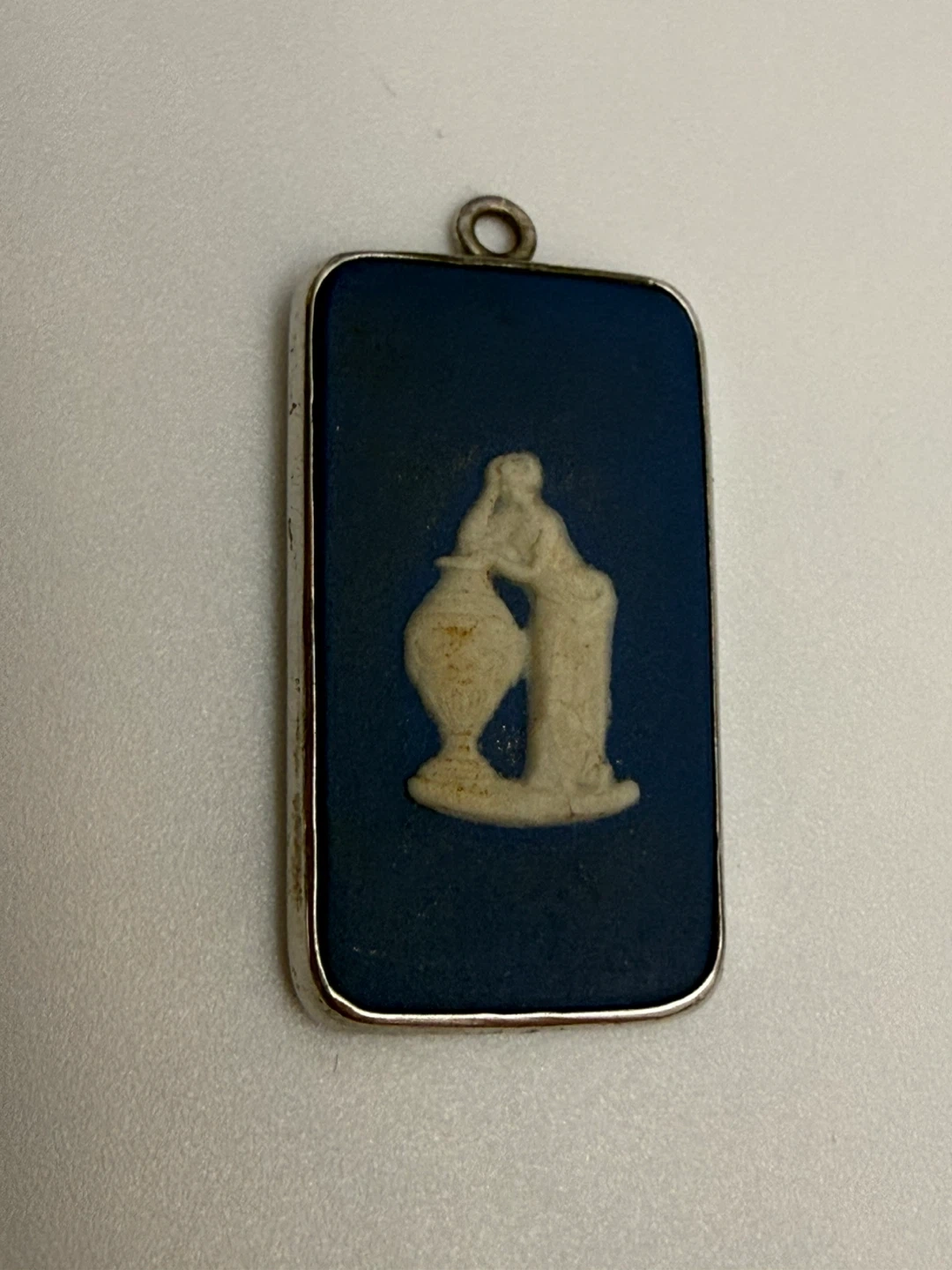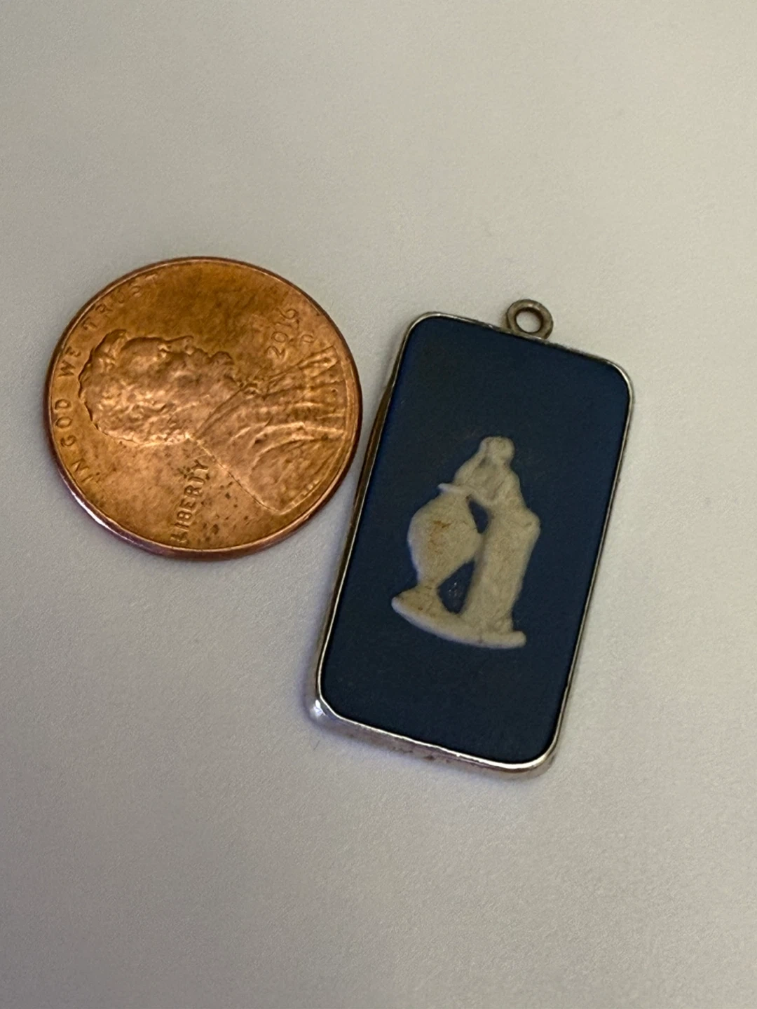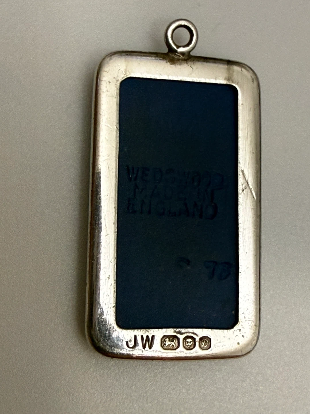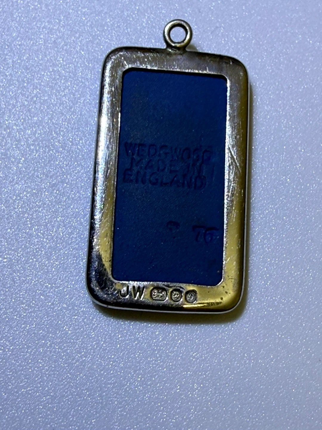 Beautiful Wedgwood Jasperware pendant in dark blue with a white bas-relief classical scene. It's set in a silver-tone metal frame and measures approximately 1 inch tall. The back is marked 'Wedgwood Made in England' with a date mark of '76'.
