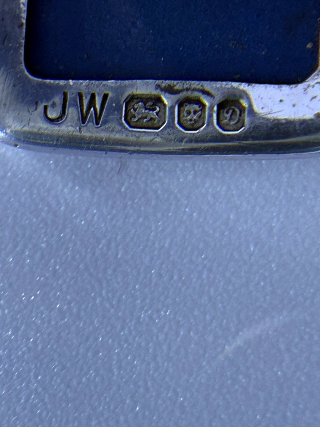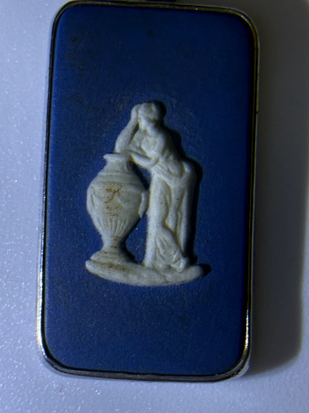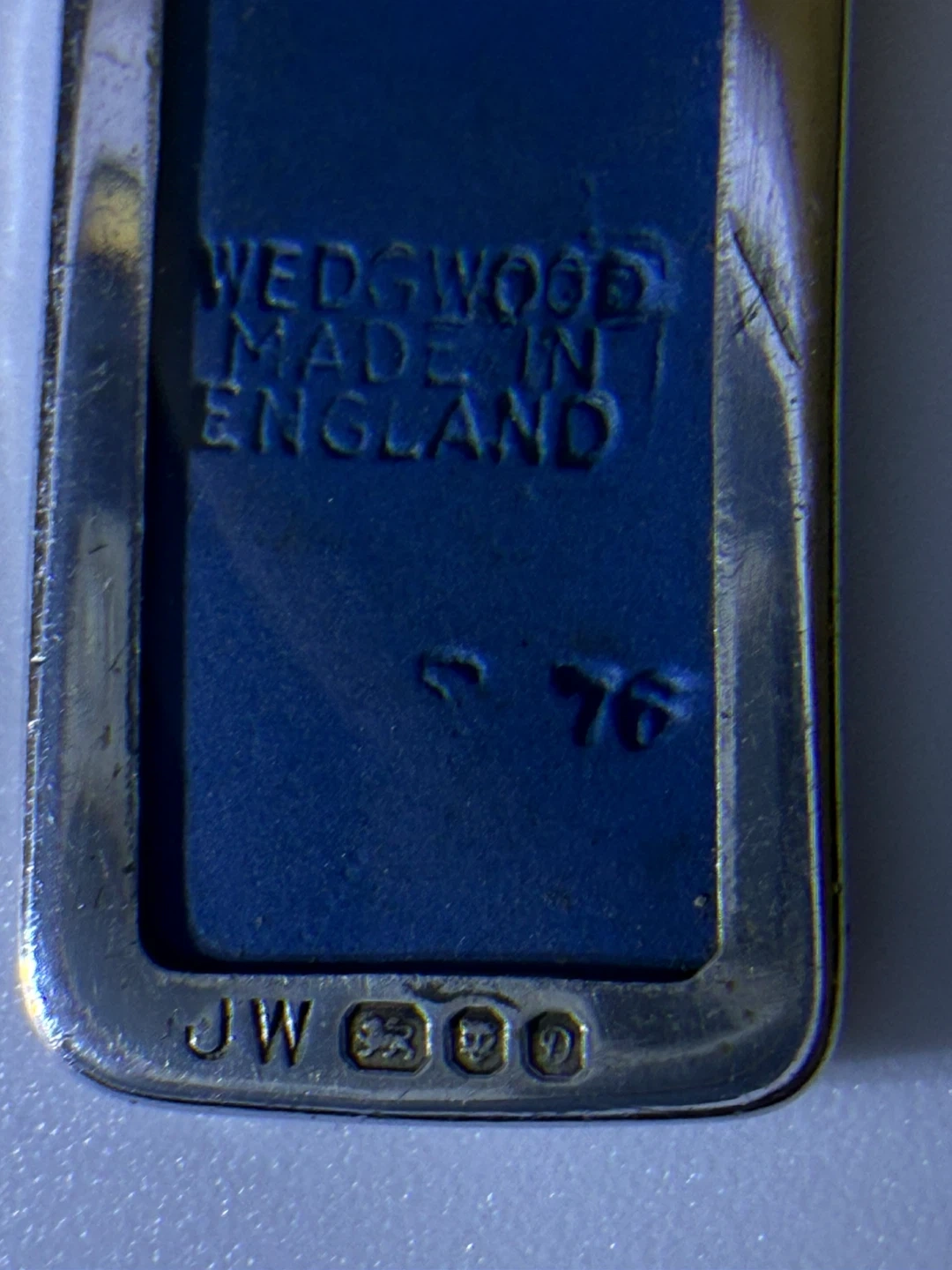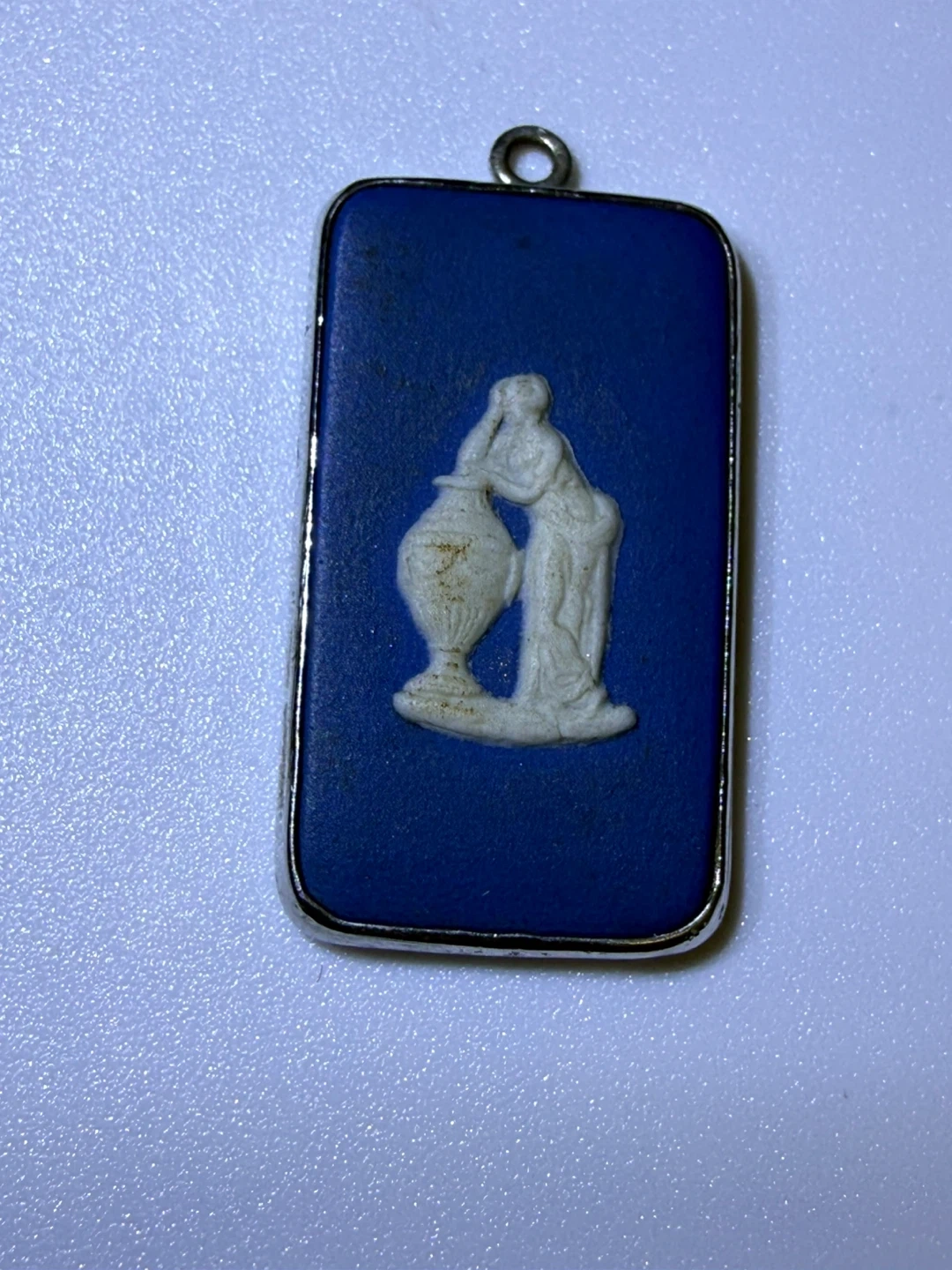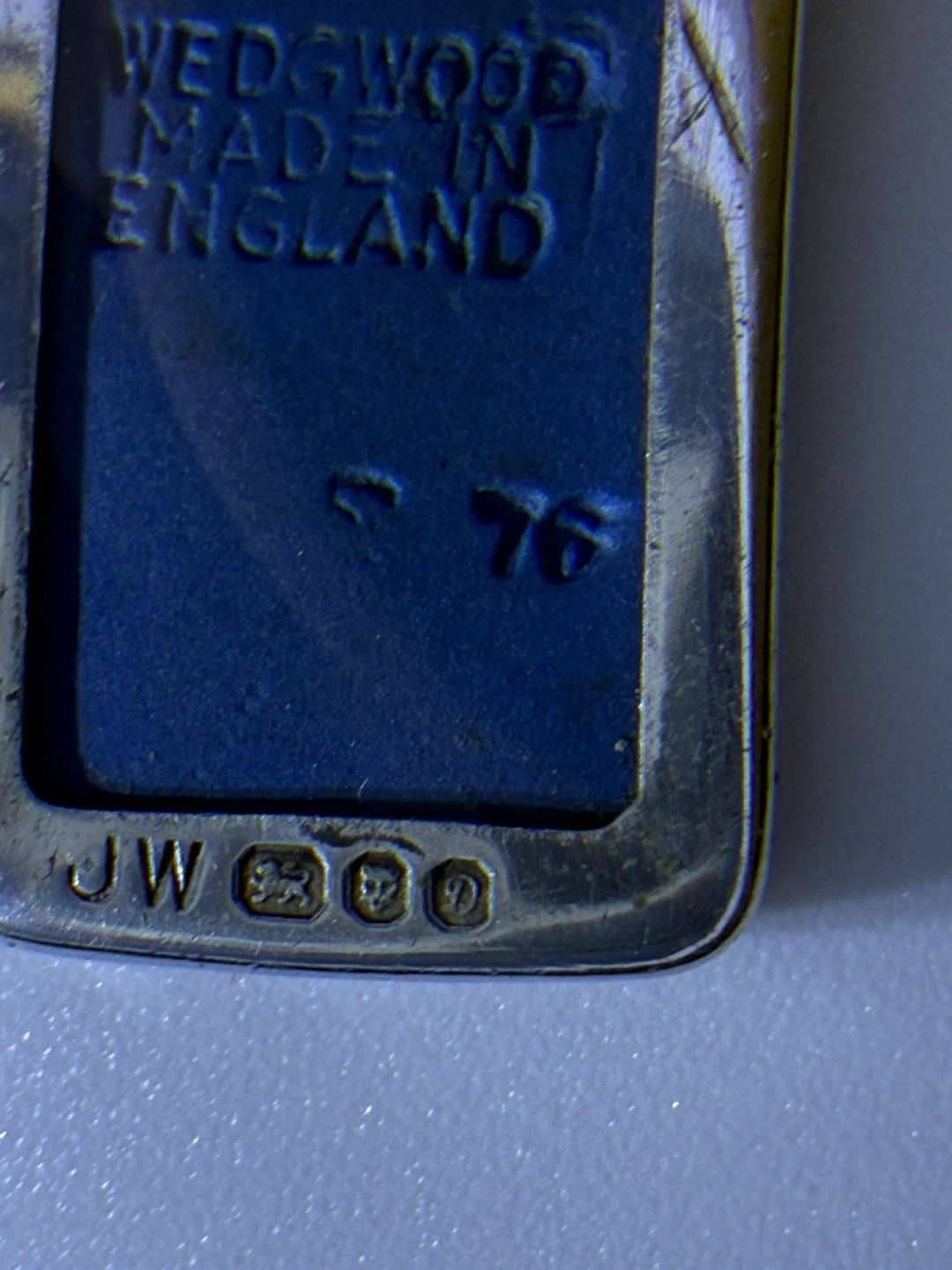Beautiful Wedgwood Jasperware pendant in dark blue with a white bas-relief classical scene. It's set in a silver-tone metal frame and measures approximately 1 inch tall. The back is marked 'Wedgwood Made in England' with a date mark of '76'.