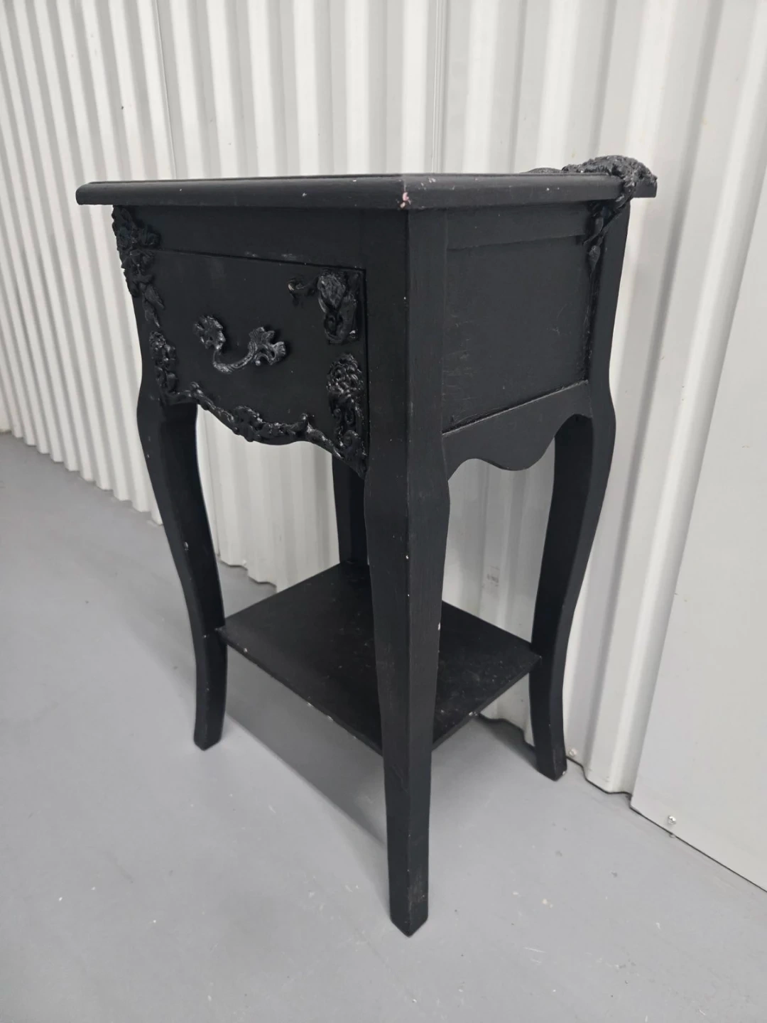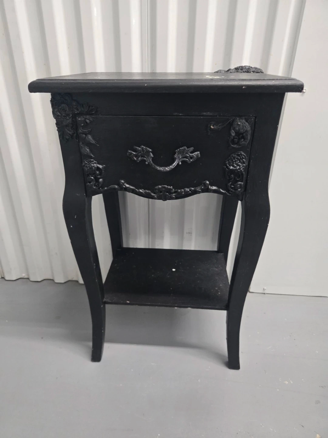 This is a black vintage nightstand with a drawer and a lower shelf. It has ornate detailing on the front and legs. The nightstand's dimensions are approximately 15 inches wide, 13 inches deep, and 24 inches tall.