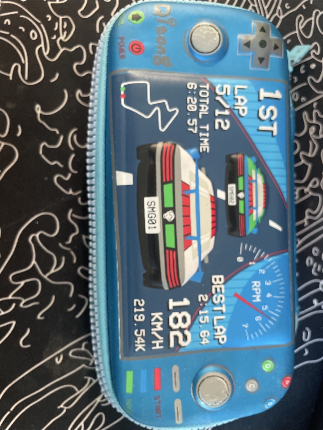 Teong pencil case with a racing car design. It's blue and has a zipper closure. Perfect for storing pens, pencils, and other stationery items