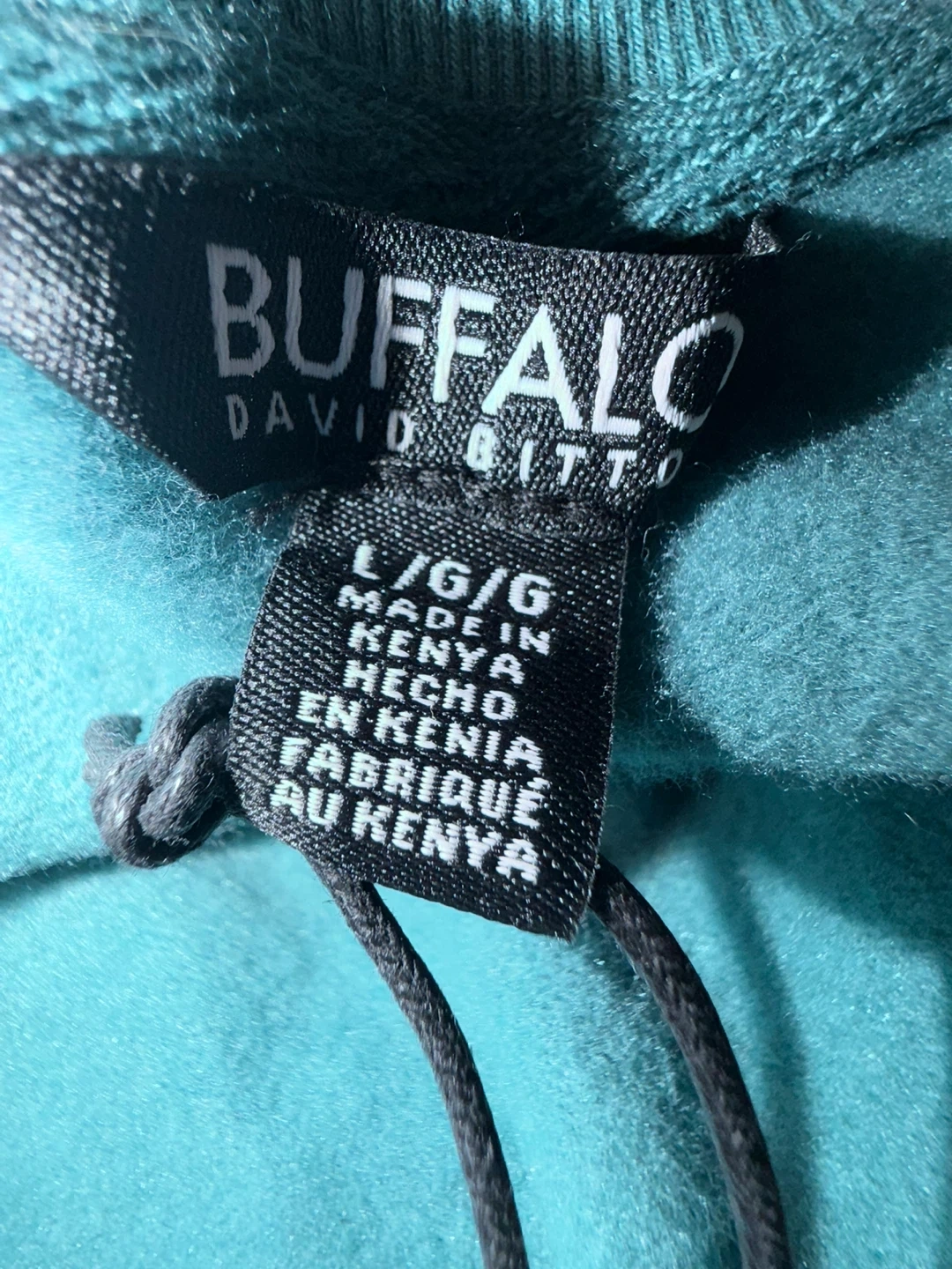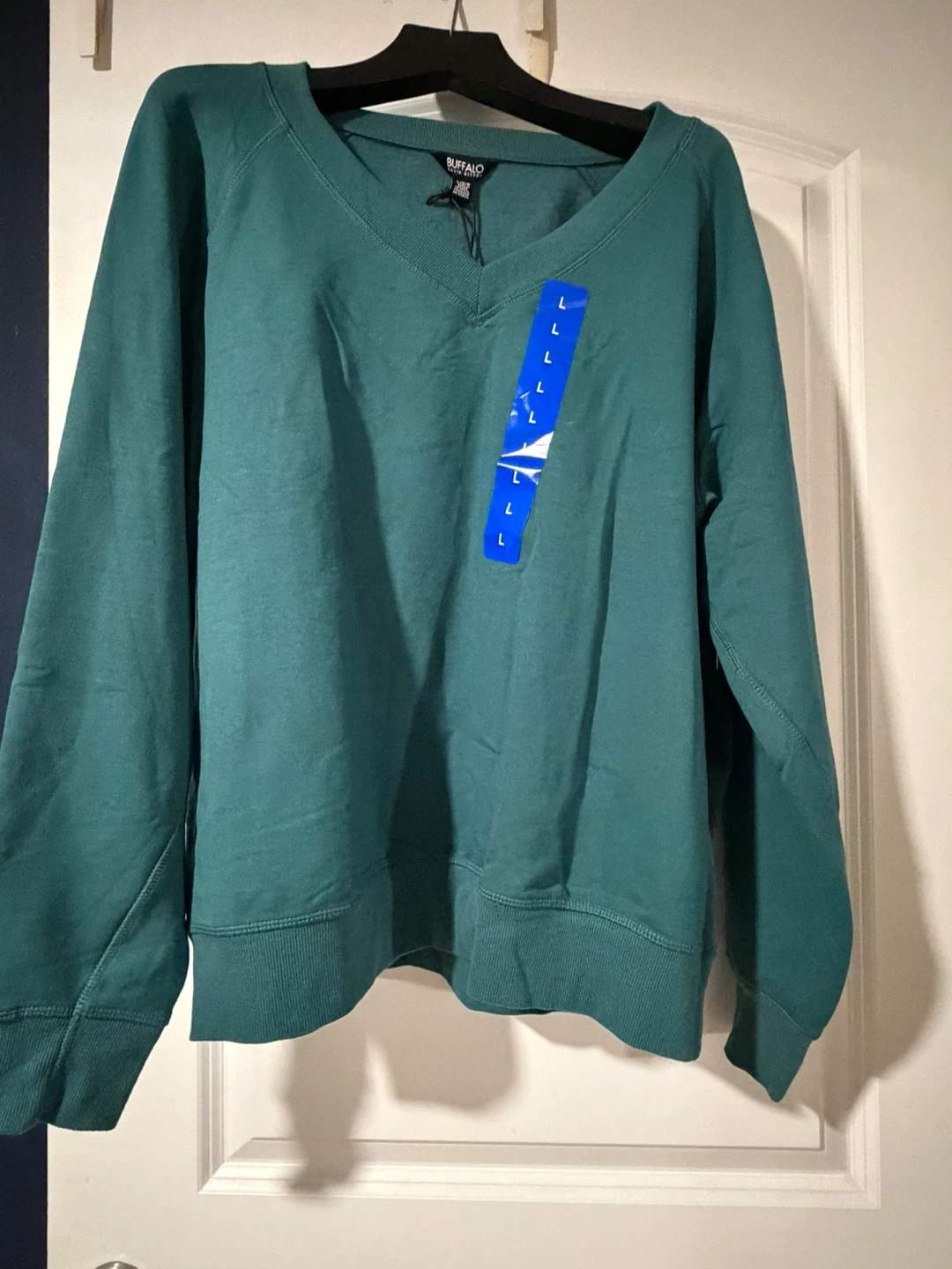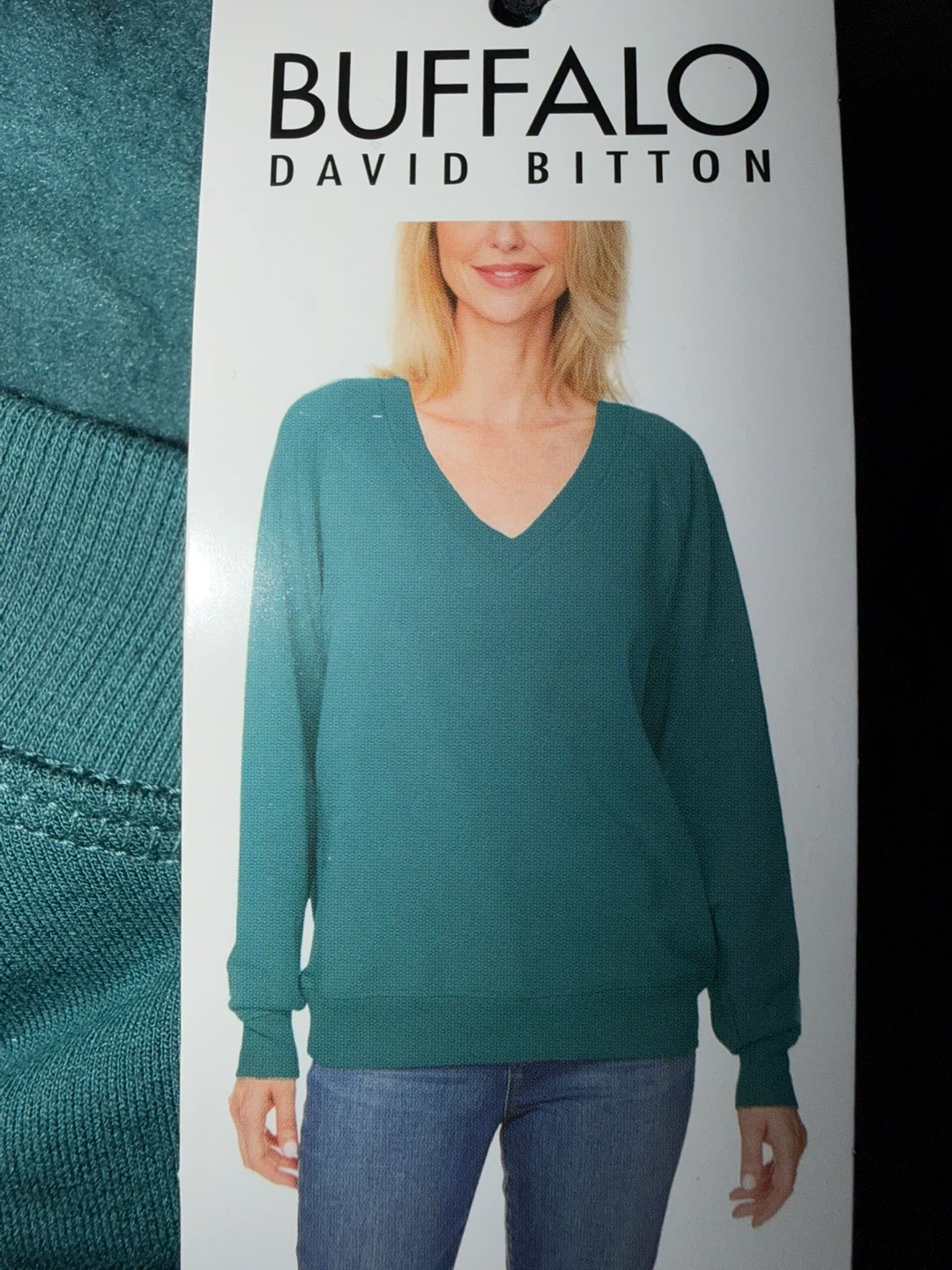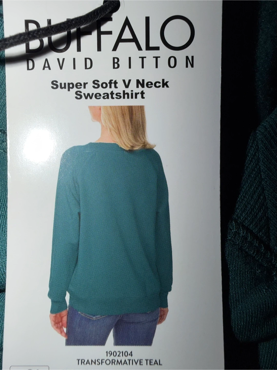 This is a Buffalo David Bitton Super Soft V Neck Sweatshirt. Transformative Teal color. The material is soft and comfortable for everyday wear.