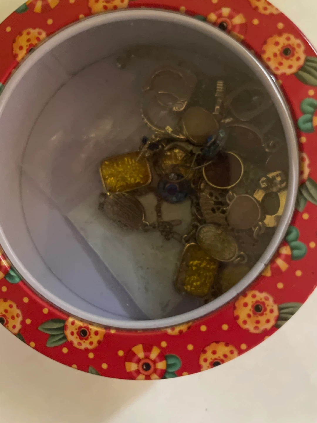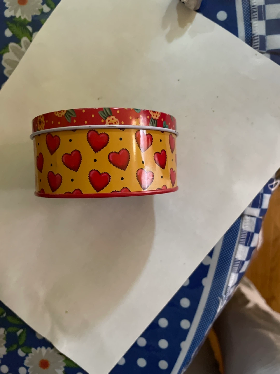 Here's a cute decorative with a heart pattern! It's perfect for storing jewelry or small trinkets. The tin features a yellow background with red hearts and a red rim with flower accents. It's in great condition and ready for a new home