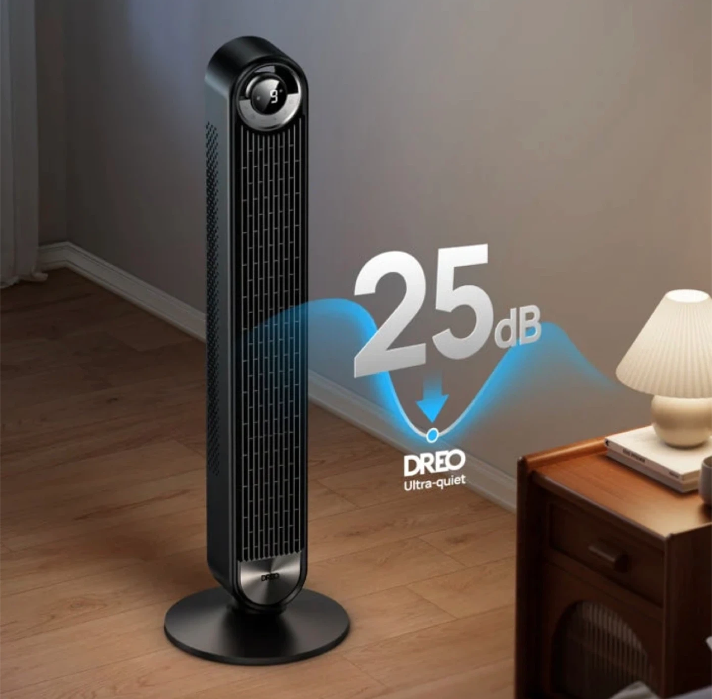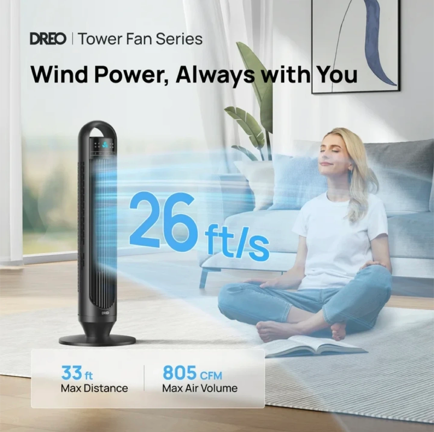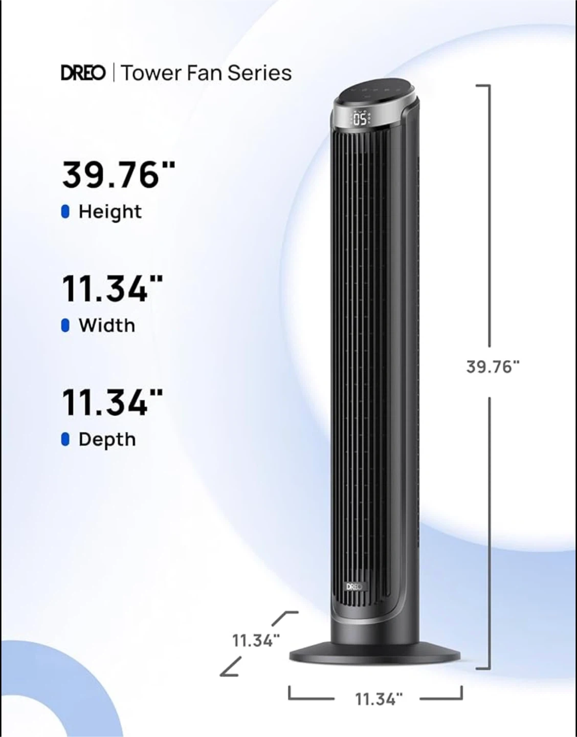 This Dreo Tower Fan Series provides great wind power. It operates at an ultra-quiet 25dB. It can reach a max distance of 33 ft and has a max air volume of 805 CFM. The height is 39.76", width is 11.34", and depth is 11.34".