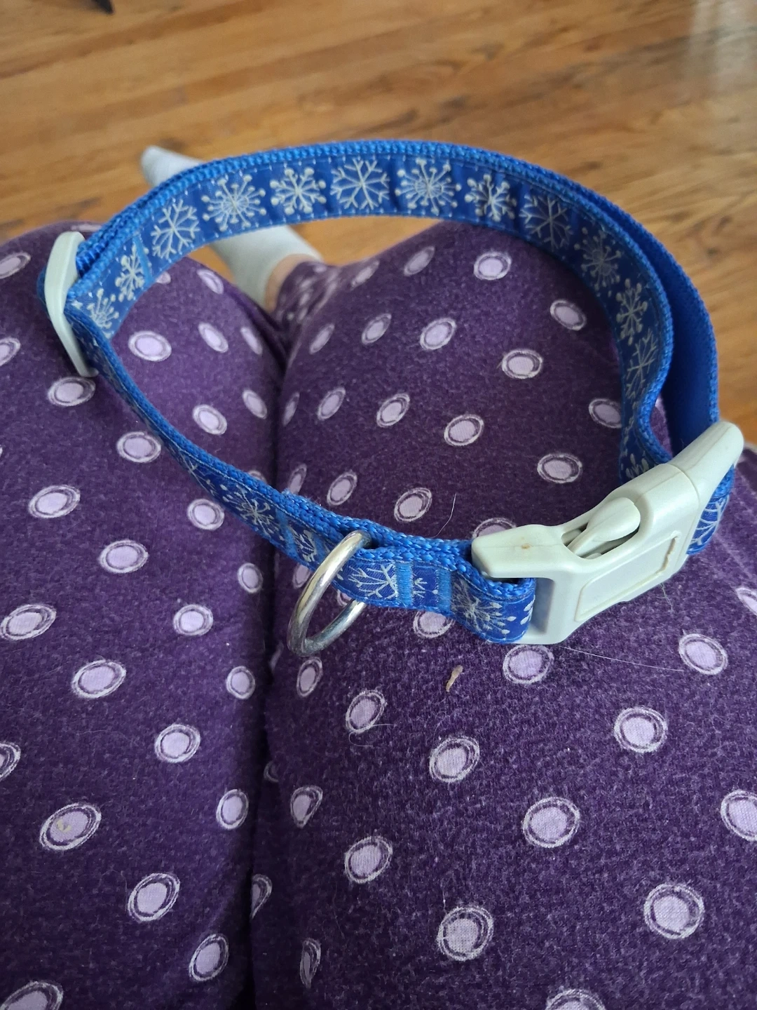 Blue dog collar with a white snowflake pattern. It features a quick-release plastic buckle and a metal D-ring for leash attachment. Adjustable for a comfortable fit.